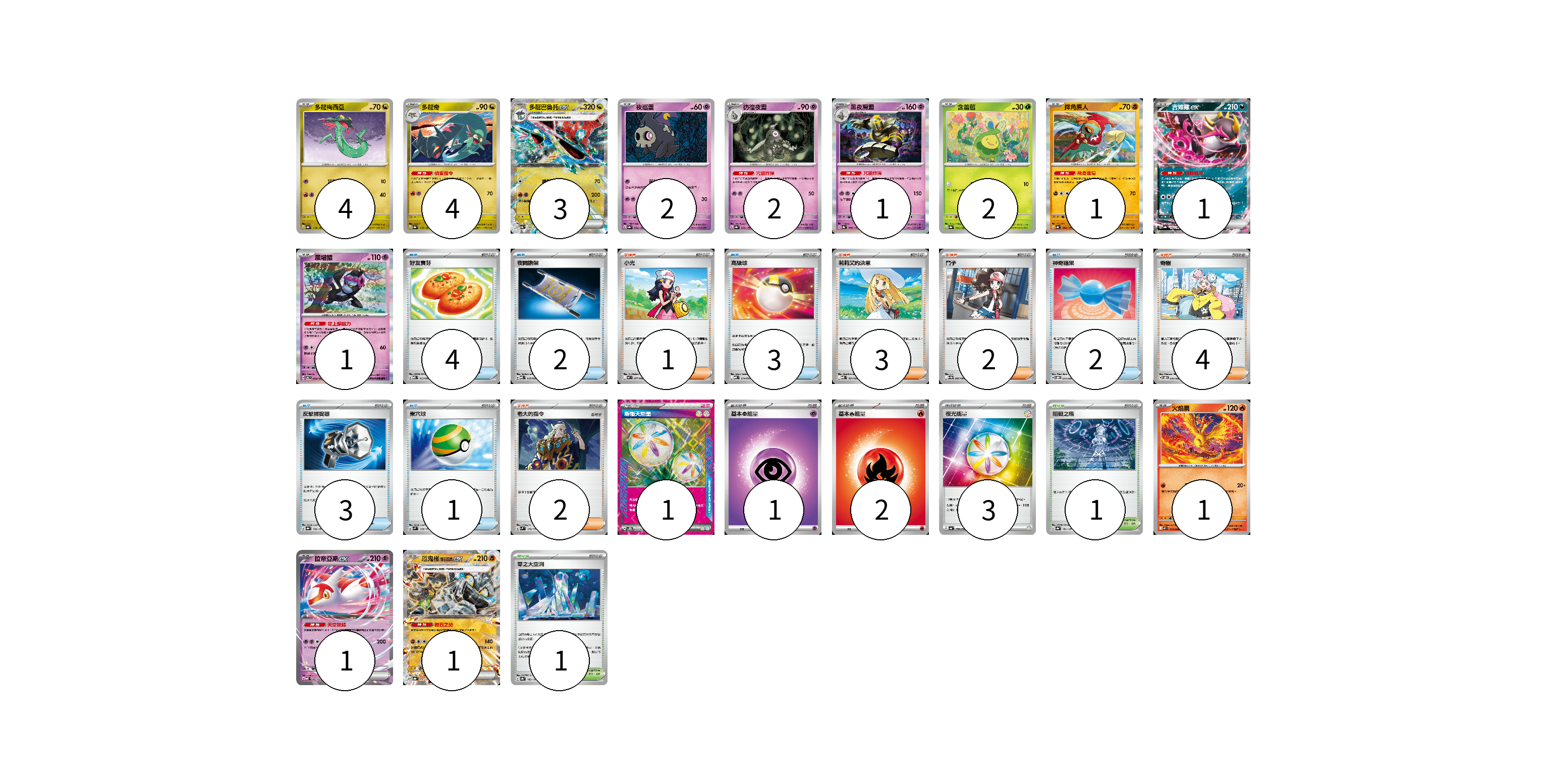 牌組構築方案 以此牌組為基礎新構築牌組 顯示卡面 顯示列表 寶可夢卡(24) 4 4 3 2 2 1 2 1 1 1 1 1 1 物品卡(15) 4 2 3 2 3 1 支援者卡(12) 1 3 2 4 2 競技場卡(2) 1 1 能量卡(7) 1 1 2 3 寶可夢卡(24) 卡牌名稱 張數 卡牌名稱 張數 多龍梅西亞 SV8a 118/187 04 多龍奇 SV8a 119/187 04 多龍巴魯托ex SV8a 120/187 03 夜巡靈 SV8a 064/187 02 彷徨夜靈 SV8a 065/187 02 黑夜魔靈 SV8a 066/187 01 含羞苞 SV8a 001/187 02 摔角鷹人 SV8a 084/187 01 吉雉雞ex SV8a 104/187 01 願增猿 SV6 055/101 01 火焰鳥 M2 014/080 01 拉帝亞斯ex MBD 003/022 01 厄鬼椪 礎石面具ex SV8a 091/187 01 物品卡(15) 卡牌名稱 張數 卡牌名稱 張數 好友寶芬 MBD 013/022 04 夜間擔架 MBD 016/022 02 高級球 MBD 014/022 03 神奇糖果 SVOD 013/020 02 反擊捕捉器 SV8a 139/187 03 巢穴球 SVM 133/175 01 支援者卡(12) 卡牌名稱 張數 卡牌名稱 張數 小光 M2 077/080 01 莉莉艾的決意 MBD 021/022 03 鬥子 SV11W 085/086 02 奇樹 SVOD 016/020 04 老大的指令 SVM 172/175 02 競技場卡(2) 卡牌名稱 張數 卡牌名稱 張數 阻礙之塔 SV8a 181/187 01 零之大空洞 SV8a 182/187 01 能量卡(7) 卡牌名稱 張數 卡牌名稱 張數 新衝天能量 SV5K 071/071 01 基本【超】能量 MBD PSY 01 基本【火】能量 M-P FIR 02 夜光能量 SV4a 190/190 03 以此牌組為基礎新構築牌組 牌組編碼 PFNmEE-gKLANW-VFSPDR copy 列印牌組單 牌組編碼已複製 分享至SNS