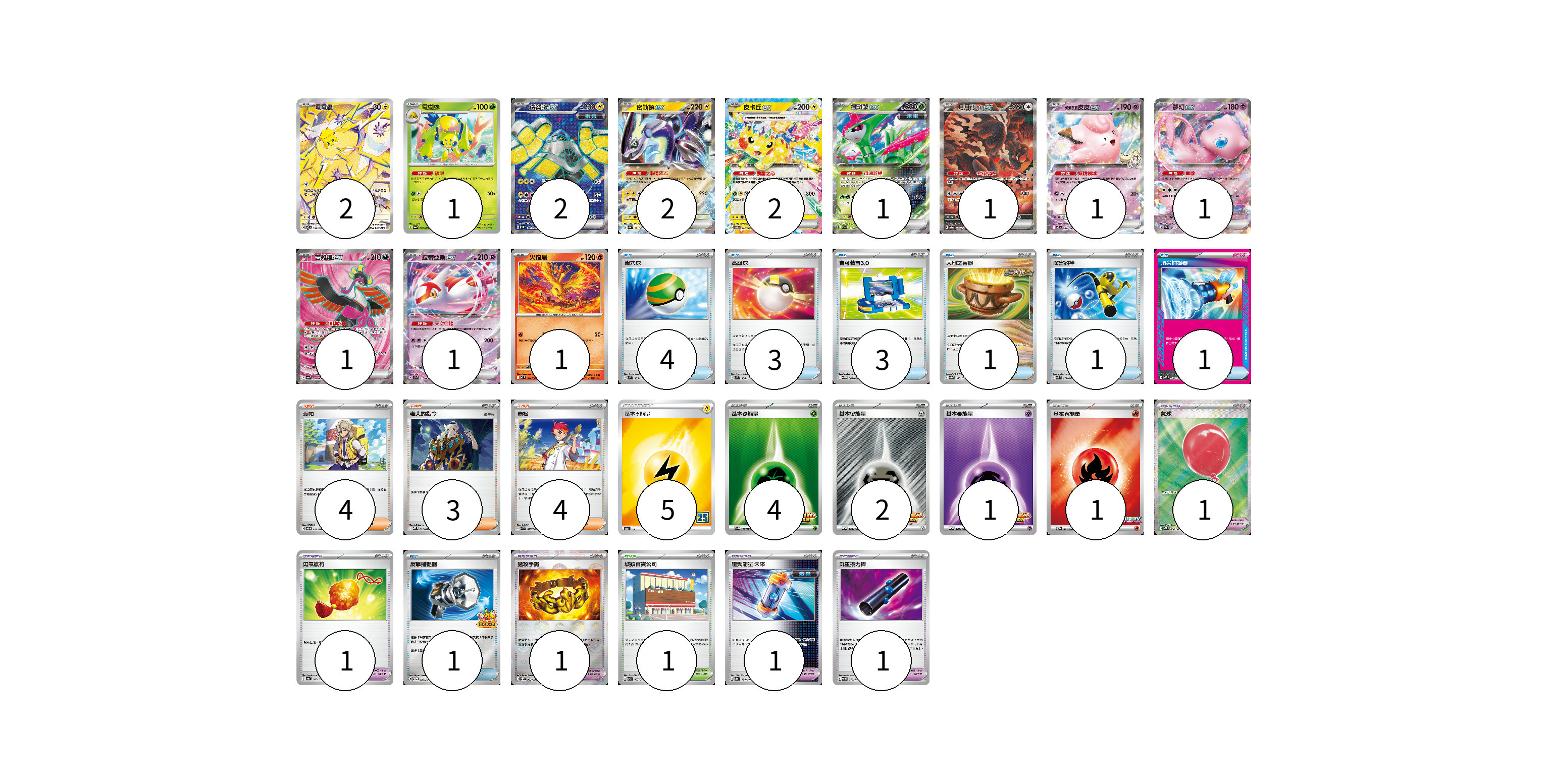 牌組構築方案 以此牌組為基礎新構築牌組 顯示卡面 顯示列表 寶可夢卡(16) 2 1 2 2 2 1 1 1 1 1 1 1 寶可夢道具(5) 1 1 1 1 1 物品卡(14) 4 3 3 1 1 1 1 支援者卡(11) 4 3 4 競技場卡(1) 1 能量卡(13) 5 4 2 1 1 寶可夢卡(16) 卡牌名稱 張數 卡牌名稱 張數 電電蟲 SV7 108/102 02 電蜘蛛 SV6a 002/064 01 鐵臂膀ex SV4M 079/066 02 密勒頓ex SV4a 071/190 02 皮卡丘ex SV8 033/106 02 鐵斑葉ex SV5M 016/071 01 月月熊 赫月ex SV8a 225/187 01 莉莉艾的皮皮ex SV9 033/100 01 夢幻ex SV2a 151/165 01 吉雉雞ex SV6a 081/064 01 拉帝亞斯ex SV7a 019/064 01 火焰鳥 M2 014/080 01 寶可夢道具(5) 卡牌名稱 張數 卡牌名稱 張數 氣球 M1L 084/063 01 勇氣護符 SV4a 169/190 01 猛攻手鐲 SV11W 082/086 01 驅勁能量 未來 SV8a 158/187 01 沉重接力棒 SV5M 066/071 01 物品卡(14) 卡牌名稱 張數 卡牌名稱 張數 巢穴球 SVM 133/175 04 高級球 SVM 134/175 03 寶可裝置3.0 SV11B 081/086 03 大地之容器 SV8a 143/187 01 厲害釣竿 SVK 011/042 01 頂尖捕捉器 MBG 014/022 01 反擊捕捉器 SV-P 083/SV-P 01 支援者卡(11) 卡牌名稱 張數 卡牌名稱 張數 派帕 SVOD 018/020 04 老大的指令 MBD 020/022 03 赤松 SVK 027/042 04 競技場卡(1) 卡牌名稱 張數 卡牌名稱 張數 城鎮百貨公司 SVK 037/042 01 能量卡(13) 卡牌名稱 張數 卡牌名稱 張數 基本雷能量 S8a LIG 05 基本【草】能量 SV-P 257/SV-P 04 基本【鋼】能量 SV-P 264/SV-P 02 基本【超】能量 SV-P 261/SV-P 01 基本【火】能量 M-P 032/M-P 01 以此牌組為基礎新構築牌組 牌組編碼 PFWQTI-ObKDSW-QwPEJN copy 列印牌組單 牌組編碼已複製 分享至SNS