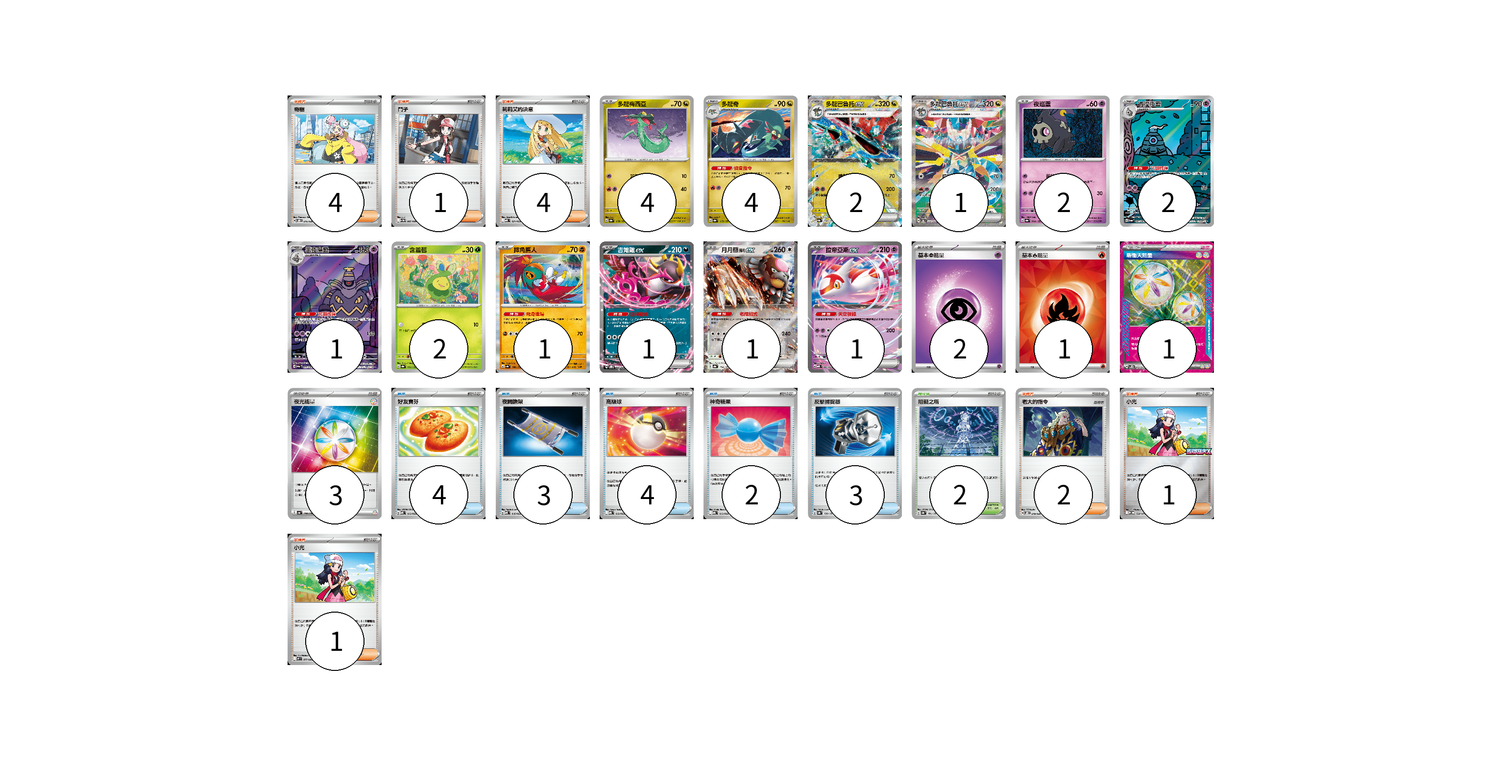 牌組構築方案 以此牌組為基礎新構築牌組 顯示卡面 顯示列表 寶可夢卡(22) 4 4 2 1 2 2 1 2 1 1 1 1 物品卡(16) 4 3 4 2 3 支援者卡(13) 4 1 4 2 1 1 競技場卡(2) 2 能量卡(7) 2 1 1 3 寶可夢卡(22) 卡牌名稱 張數 卡牌名稱 張數 多龍梅西亞 SV8a 118/187 04 多龍奇 SV8a 119/187 04 多龍巴魯托ex SV8a 120/187 02 多龍巴魯托ex SV8a 221/187 01 夜巡靈 SV8a 064/187 02 彷徨夜靈 SV6a 069/064 02 黑夜魔靈 SV6a 070/064 01 含羞苞 SV8a 001/187 02 摔角鷹人 SV4a 106/190 01 吉雉雞ex SVOD 004/020 01 月月熊 赫月ex SV8a 134/187 01 拉帝亞斯ex MBD 003/022 01 物品卡(16) 卡牌名稱 張數 卡牌名稱 張數 好友寶芬 MBD 013/022 04 夜間擔架 MBD 016/022 03 高級球 MBG 012/022 04 神奇糖果 MBG 013/022 02 反擊捕捉器 SV8a 139/187 03 支援者卡(13) 卡牌名稱 張數 卡牌名稱 張數 奇樹 SVOD 016/020 04 鬥子 SV11W 085/086 01 莉莉艾的決意 MBD 021/022 04 老大的指令 SVOD 019/020 02 小光 M-P 028/M-P 01 小光 M2 077/080 01 競技場卡(2) 卡牌名稱 張數 卡牌名稱 張數 阻礙之塔 SV8a 181/187 02 能量卡(7) 卡牌名稱 張數 卡牌名稱 張數 基本【超】能量 MBD PSY 02 基本【火】能量 SVQL FIR 01 新衝天能量 SV5K 071/071 01 夜光能量 SV4a 190/190 03 以此牌組為基礎新構築牌組 牌組編碼 PGjBHS-ANfMsj-LpxOrG copy 列印牌組單 牌組編碼已複製 分享至SNS