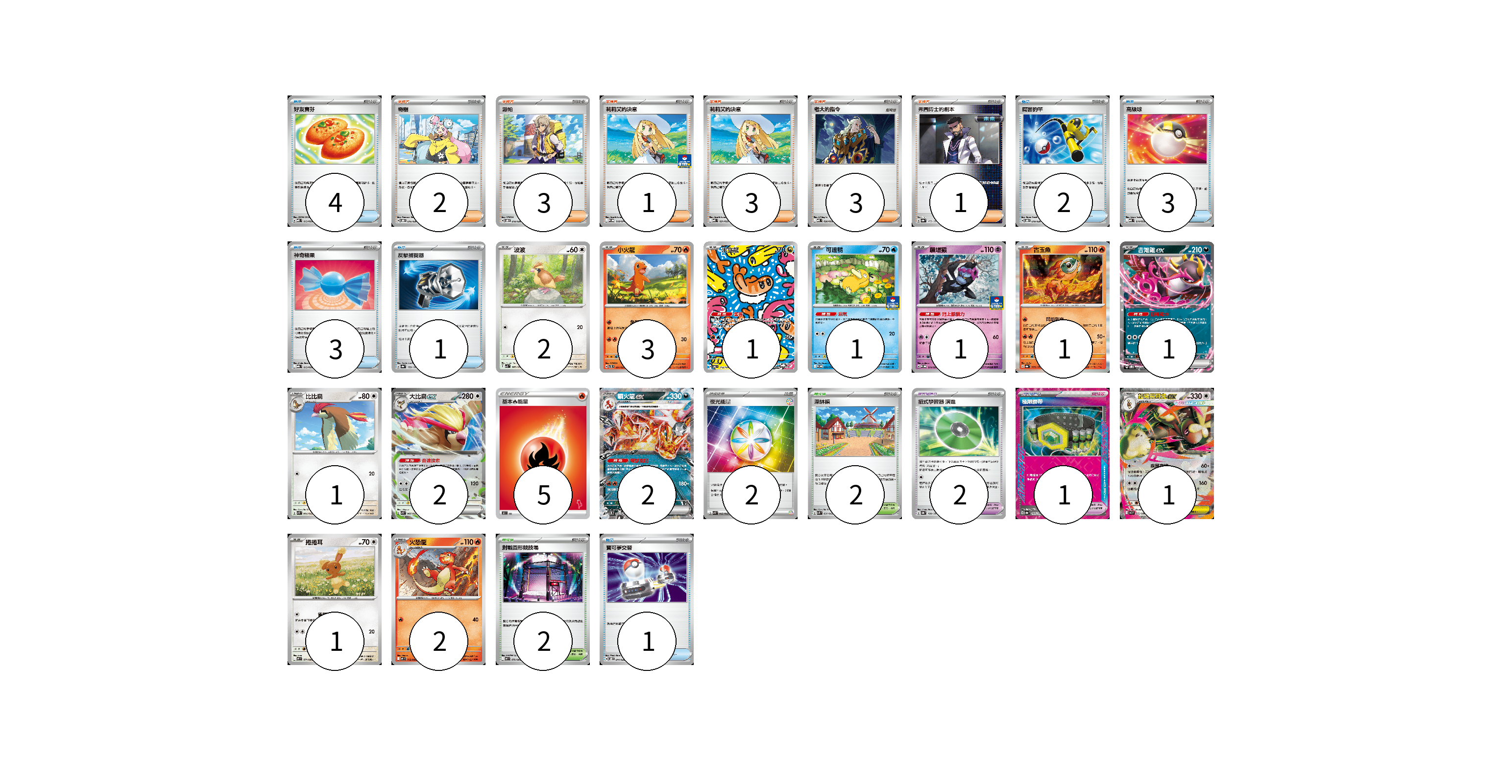 牌組構築方案 以此牌組為基礎新構築牌組 顯示卡面 顯示列表 寶可夢卡(19) 2 3 1 1 1 1 1 1 2 2 1 1 2 寶可夢道具(3) 2 1 物品卡(14) 4 2 3 3 1 1 支援者卡(13) 2 3 1 3 3 1 競技場卡(4) 2 2 能量卡(7) 5 2 寶可夢卡(19) 卡牌名稱 張數 卡牌名稱 張數 波波 SV3 087/108 02 小火龍 SVTL 001/021 03 米立龍 SV6 112/101 01 可達鴨 SV-P 220/SV-P 01 願增猿 M-P 014/M-P 01 古玉魚 SV8a 025/187 01 吉雉雞ex SVOD 004/020 01 比比鳥 SVK 004/042 01 大比鳥ex SVK 005/042 02 噴火龍ex SVTL 006/021 02 超級長耳兔ex M2 072/080 01 捲捲耳 M2 071/080 01 火恐龍 M2 012/080 02 寶可夢道具(3) 卡牌名稱 張數 卡牌名稱 張數 招式學習器 演進 SV8a 160/187 02 極限腰帶 SV8a 159/187 01 物品卡(14) 卡牌名稱 張數 卡牌名稱 張數 好友寶芬 MBD 013/022 04 厲害釣竿 SVOD 010/020 02 高級球 MBD 014/022 03 神奇糖果 MBG 013/022 03 反擊捕捉器 SV8a 139/187 01 寶可夢交替 SVOD 014/020 01 支援者卡(13) 卡牌名稱 張數 卡牌名稱 張數 奇樹 SVOD 016/020 02 派帕 SVOD 018/020 03 莉莉艾的決意 M-P 018/M-P 01 莉莉艾的決意 MBD 021/022 03 老大的指令 MBD 020/022 03 弗圖博士的劇本 SV8a 175/187 01 競技場卡(4) 卡牌名稱 張數 卡牌名稱 張數 深缽鎮 SVK 039/042 02 對戰圓形競技場 M2 079/080 02 能量卡(7) 卡牌名稱 張數 卡牌名稱 張數 基本火能量 SH FIR 05 夜光能量 SVK 042/042 02 以此牌組為基礎新構築牌組 牌組編碼 PGkBQI-RsRqnd-xPbRXQ copy 列印牌組單 牌組編碼已複製 分享至SNS