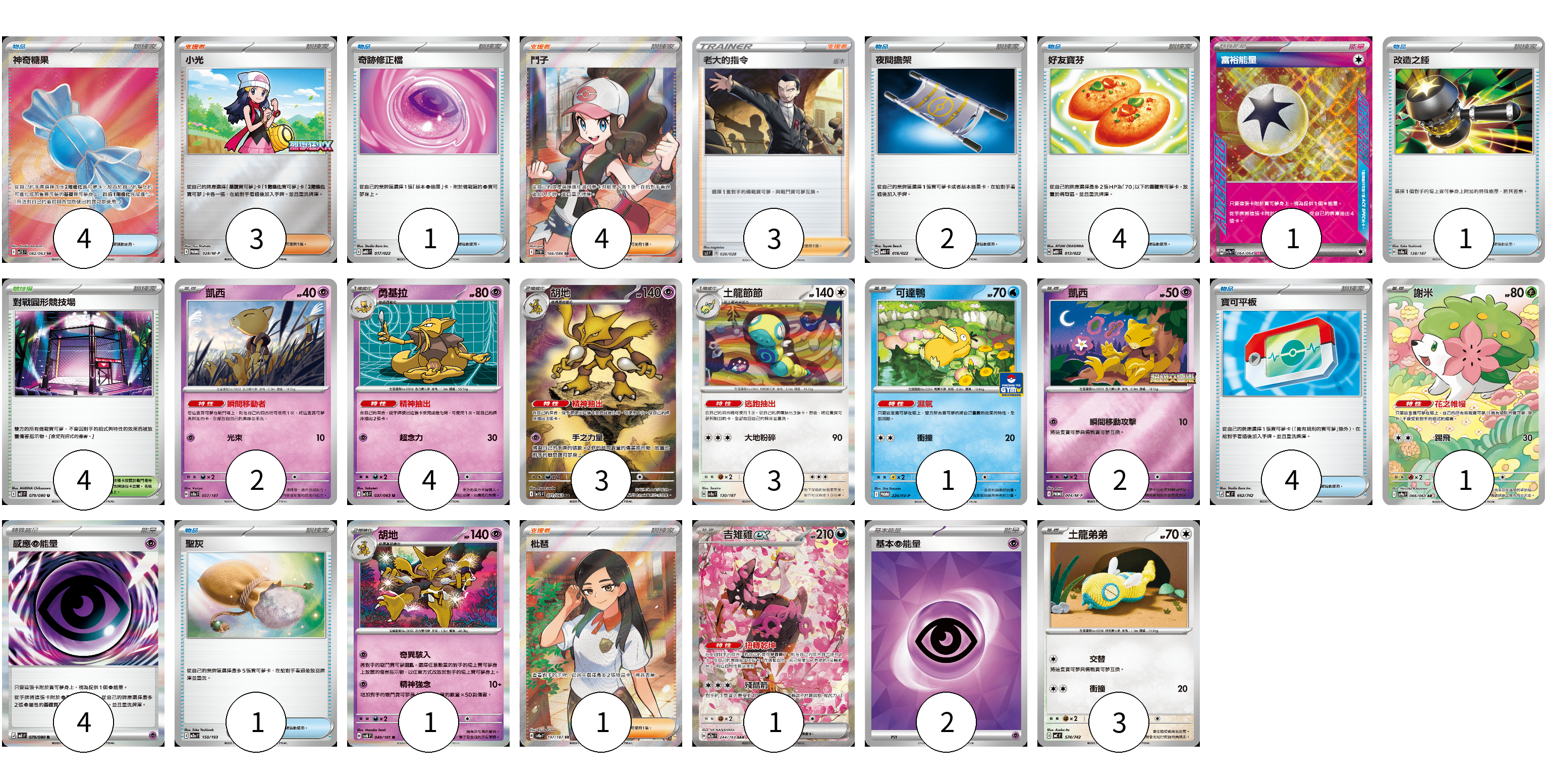 牌組構築方案 以此牌組為基礎新構築牌組 顯示卡面 顯示列表 寶可夢卡(21) 2 4 3 3 1 2 1 1 1 3 物品卡(17) 4 1 2 4 1 4 1 支援者卡(11) 3 4 3 1 競技場卡(4) 4 能量卡(7) 1 4 2 寶可夢卡(21) 卡牌名稱 張數 卡牌名稱 張數 凱西 SV8a 057/187 02 勇基拉 M1S 037/063 04 胡地 M1S 071/063 03 土龍節節 SV8a 130/187 03 可達鴨 SV-P 220/SV-P 01 凱西 M-P 004/M-P 02 謝米 SV9a 066/063 01 胡地 SV6 049/101 01 吉雉雞ex M2a 244/193 01 土龍弟弟 MC 574/742 03 物品卡(17) 卡牌名稱 張數 卡牌名稱 張數 神奇糖果 M1S 082/063 04 奇跡修正檔 MBD 017/022 01 夜間擔架 MBD 016/022 02 好友寶芬 MBD 013/022 04 改造之錘 SV8a 138/187 01 寶可平板 MC 662/742 04 聖灰 M2a 150/193 01 支援者卡(11) 卡牌名稱 張數 卡牌名稱 張數 小光 M-P 028/M-P 03 鬥子 SV11W 166/086 04 老大的指令(坂木) SJ 026/028 03 枇琶 SV8a 197/187 01 競技場卡(4) 卡牌名稱 張數 卡牌名稱 張數 對戰圓形競技場 M2 079/080 04 能量卡(7) 卡牌名稱 張數 卡牌名稱 張數 富裕能量 SV7a 064/064 01 感應【超】能量 M3 079/080 04 基本【超】能量 SVM PSY 02 以此牌組為基礎新構築牌組 牌組編碼 PIcgLz-eXyQvw-jDXuoA copy 列印牌組單 牌組編碼已複製 分享至SNS