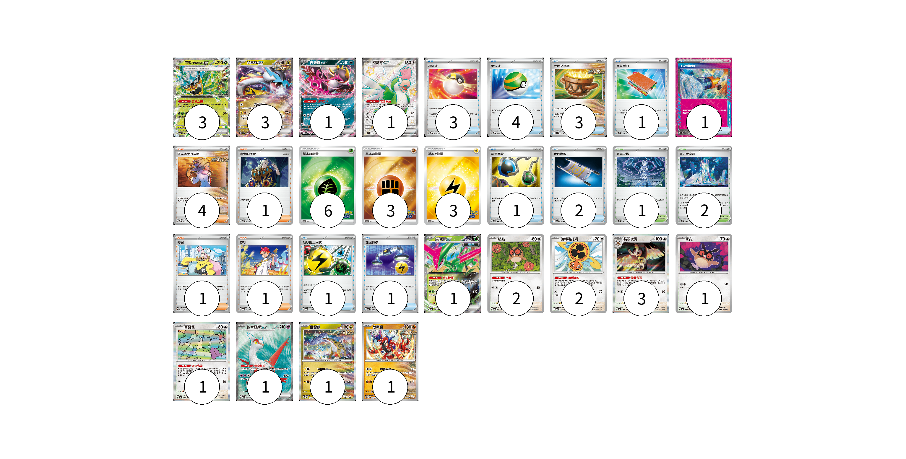 牌組構築方案 以此牌組為基礎新構築牌組 顯示卡面 顯示列表 寶可夢卡(21) 3 3 1 1 1 2 2 3 1 1 1 1 1 物品卡(17) 3 4 3 1 1 1 2 1 1 支援者卡(7) 4 1 1 1 競技場卡(3) 1 2 能量卡(12) 6 3 3 寶可夢卡(21) 卡牌名稱 張數 卡牌名稱 張數 厄鬼椪 碧草面具ex SV6 016/101 03 猛雷鼓ex SV5K 053/071 03 吉雉雞ex SV6a 038/064 01 怒鸚哥ex SV4a 337/190 01 鐵斑葉ex SV8a 016/187 01 咕咕 SV8a 127/187 02 旋轉洛托姆 SV8a 131/187 02 貓頭夜鷹 SV8a 128/187 03 咕咕 SV5K 054/071 01 百變怪 SV4a 144/190 01 拉帝亞斯ex SV7a 078/064 01 猛雷鼓 SV7 075/102 01 故勒頓 SV8 069/106 01 物品卡(17) 卡牌名稱 張數 卡牌名稱 張數 高級球 SVK 018/042 03 巢穴球 SVK 016/042 04 大地之容器 SVK 012/042 03 朋友手冊 SV1S 069/078 01 頂尖捕捉器 SV5M 062/071 01 能量回收 SVTM 009/022 01 夜間擔架 SV6a 056/064 02 超級能量回收 SV8a 141/187 01 能量轉移 SVM 127/175 01 支援者卡(7) 卡牌名稱 張數 卡牌名稱 張數 奧琳博士的氣魄 SVHK 017/022 04 老大的指令 SVTG 019/019 01 奇樹 SVOD 016/020 01 赤松 SV8a 163/187 01 競技場卡(3) 卡牌名稱 張數 卡牌名稱 張數 阻礙之塔 SV8a 181/187 01 零之大空洞 SV8a 182/187 02 能量卡(12) 卡牌名稱 張數 卡牌名稱 張數 基本草能量 S10b GRA 06 基本鬥能量 S10b FIG 03 基本雷能量 S10b LIG 03 以此牌組為基礎新構築牌組 牌組編碼 PJztmM-WAjIsg-LkIktj copy 列印牌組單 牌組編碼已複製 分享至SNS