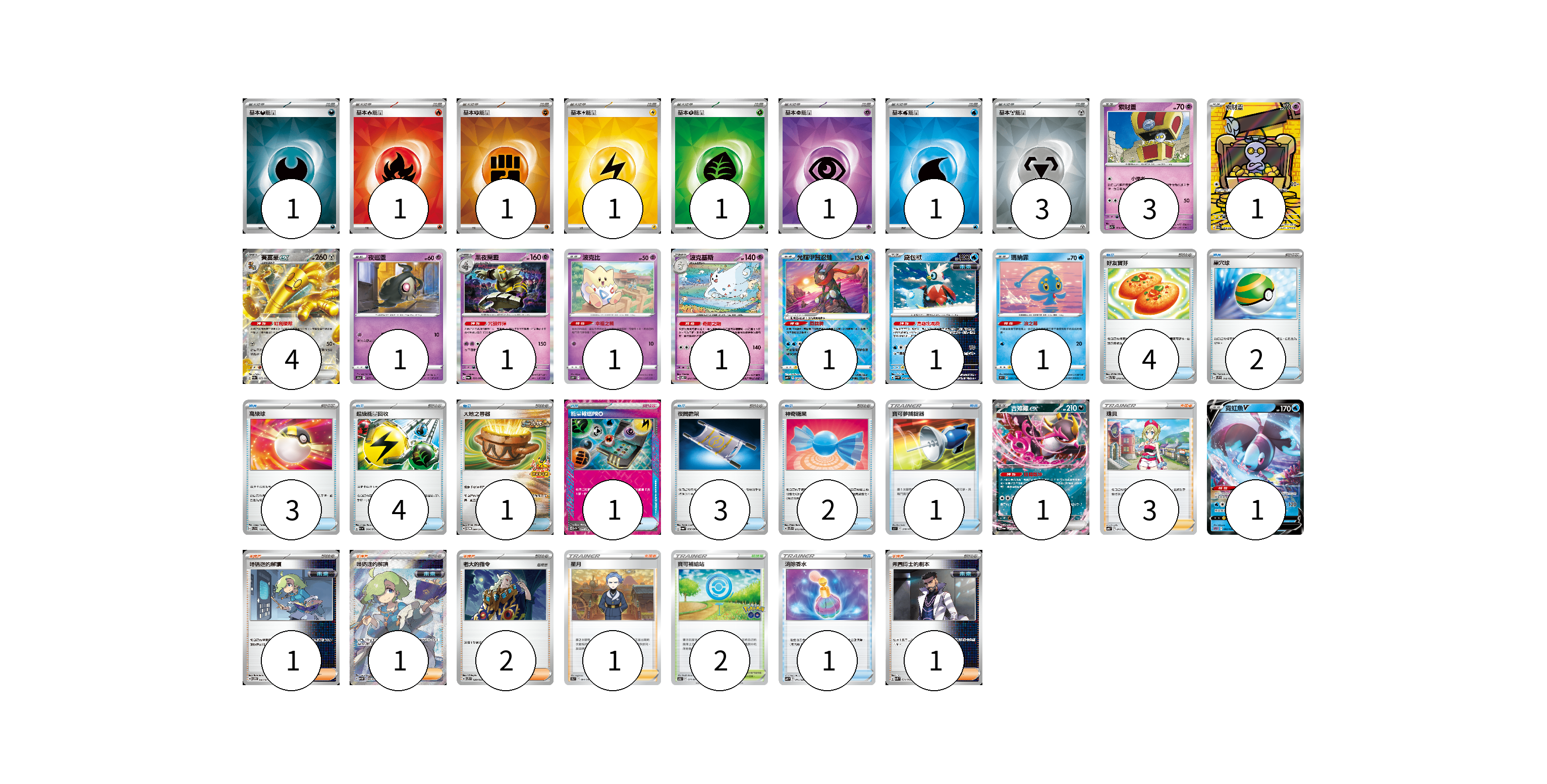 牌組構築方案 以此牌組為基礎新構築牌組 顯示卡面 顯示列表 寶可夢卡(17) 3 1 4 1 1 1 1 1 1 1 1 1 物品卡(22) 4 2 3 4 1 1 3 2 1 1 支援者卡(9) 3 1 1 2 1 1 競技場卡(2) 2 能量卡(10) 1 1 1 1 1 1 1 3 寶可夢卡(17) 卡牌名稱 張數 卡牌名稱 張數 索財靈 SV7a 024/064 03 索財靈 SV3a 068/062 01 賽富豪ex SV3a 050/062 04 夜巡靈 S12a 057/172 01 黑夜魔靈 SV6a 020/064 01 波克比 S10P 026/067 01 波克基斯 SV8 047/106 01 光輝甲賀忍蛙 SVF 004/038 01 鐵包袱 SV4M 020/066 01 瑪納霏 S9 031/100 01 吉雉雞ex SV6a 038/064 01 霓虹魚V SPD 002/020 01 物品卡(22) 卡牌名稱 張數 卡牌名稱 張數 好友寶芬 SVTL 010/021 04 巢穴球 SVF 016/038 02 高級球 SVD 119/139 03 超級能量回收 SV1a 064/073 04 大地之容器 SV-P 084/SV-P 01 能量輸送PRO SV7a 052/064 01 夜間擔架 SV6a 056/064 03 神奇糖果 SVTS 015/022 02 寶可夢捕捉器 SI 378/414 01 消除香水 SVF 011/038 01 支援者卡(9) 卡牌名稱 張數 卡牌名稱 張數 珠貝 SVB 017/028 03 暗碼迷的解讀 SV5M 067/071 01 暗碼迷的解讀 SV5M 090/071 01 老大的指令 SVTS 020/022 02 星月 S9a 064/067 01 弗圖博士的劇本 SVK 034/042 01 競技場卡(2) 卡牌名稱 張數 卡牌名稱 張數 寶可補給站 S10b 071/071 02 能量卡(10) 卡牌名稱 張數 卡牌名稱 張數 基本【惡】能量 SVK DAR 01 基本【火】能量 SVK FIR 01 基本【鬥】能量 SVK FIG 01 基本【雷】能量 SVK LIG 01 基本【草】能量 SVK GRA 01 基本【超】能量 SVK PSY 01 基本【水】能量 SVK WAT 01 基本【鋼】能量 SVK MET 03 以此牌組為基礎新構築牌組 牌組編碼 PKdDnC-AQJdWz-PKOIPI copy 列印牌組單 牌組編碼已複製 分享至SNS