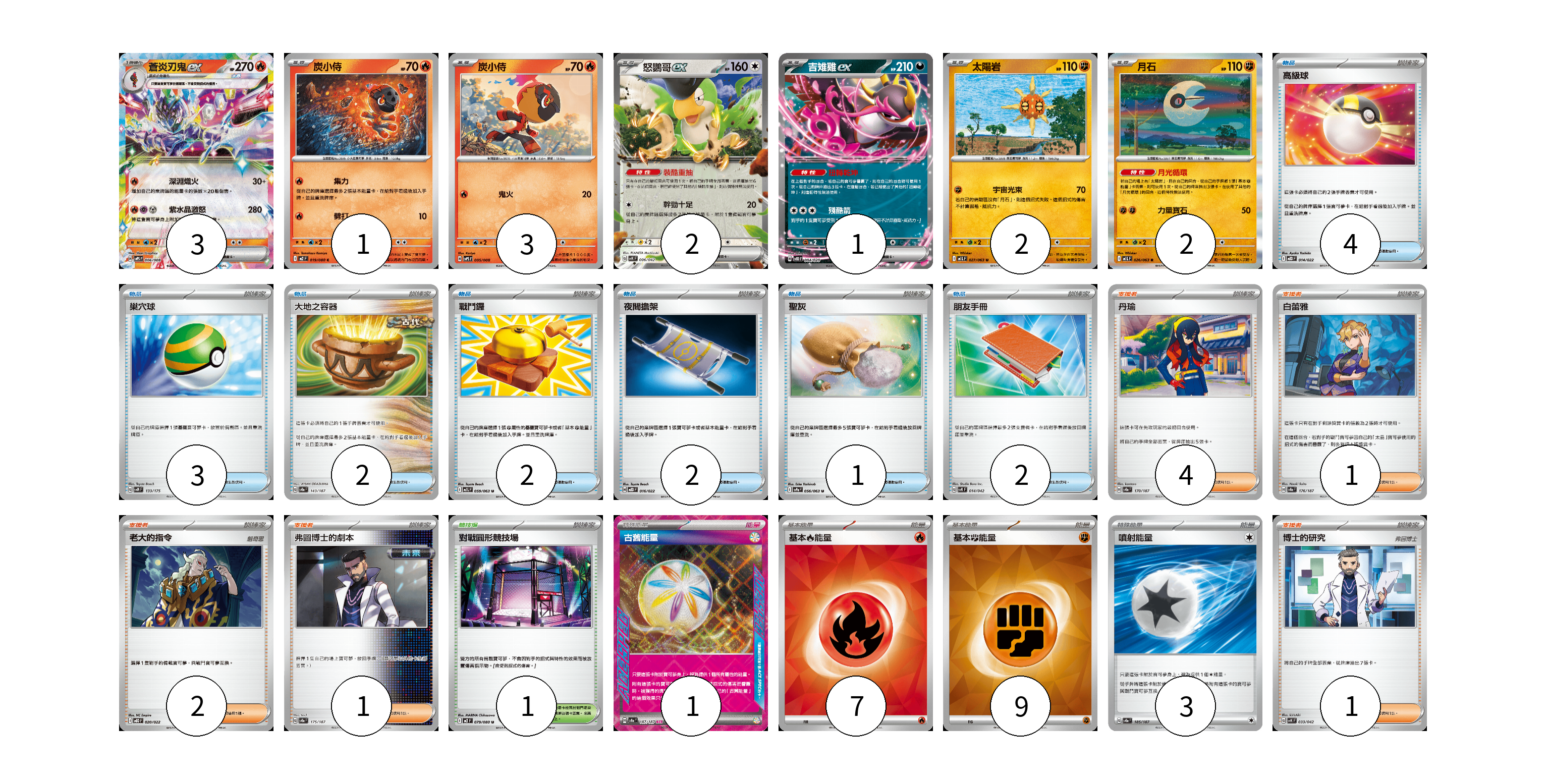 牌組構築方案 以此牌組為基礎新構築牌組 顯示卡面 顯示列表 寶可夢卡(14) 3 1 3 2 1 2 2 物品卡(16) 4 3 2 2 2 1 2 支援者卡(9) 4 1 2 1 1 競技場卡(1) 1 能量卡(20) 1 7 9 3 寶可夢卡(14) 卡牌名稱 張數 卡牌名稱 張數 蒼炎刃鬼ex SVPS 006/008 03 炭小侍 M2 019/080 01 炭小侍 SVPS 005/008 03 怒鸚哥ex SVK 006/042 02 吉雉雞ex SVOD 004/020 01 太陽岩 M1L 027/063 02 月石 M1L 026/063 02 物品卡(16) 卡牌名稱 張數 卡牌名稱 張數 高級球 MBD 014/022 04 巢穴球 SVM 133/175 03 大地之容器 SV8a 143/187 02 戰鬥鑼 M1L 059/063 02 夜間擔架 MBD 016/022 02 聖灰 SV9a 056/063 01 朋友手冊 SVK 014/042 02 支援者卡(9) 卡牌名稱 張數 卡牌名稱 張數 丹瑜 SV8a 170/187 04 白蕾雅 SV8a 176/187 01 老大的指令 MBD 020/022 02 弗圖博士的劇本 SV8a 175/187 01 博士的研究 SVK 033/042 01 競技場卡(1) 卡牌名稱 張數 卡牌名稱 張數 對戰圓形競技場 M2 079/080 01 能量卡(20) 卡牌名稱 張數 卡牌名稱 張數 古舊能量 SV8a 187/187 01 基本【火】能量 SVM FIR 07 基本【鬥】能量 SVM FIG 09 噴射能量 SV8a 185/187 03 以此牌組為基礎新構築牌組 牌組編碼 PNiFQB-MWJyjq-KVotab copy 列印牌組單 牌組編碼已複製 分享至SNS