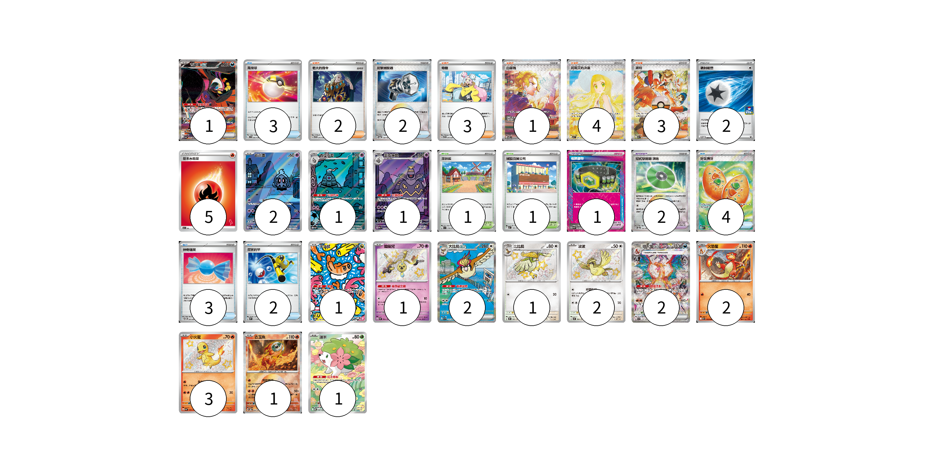 牌組構築方案 以此牌組為基礎新構築牌組 顯示卡面 顯示列表 寶可夢卡(21) 1 2 1 1 1 1 2 1 2 2 2 3 1 1 寶可夢道具(3) 1 2 物品卡(14) 3 2 4 3 2 支援者卡(13) 2 3 1 4 3 競技場卡(2) 1 1 能量卡(7) 2 5 寶可夢卡(21) 卡牌名稱 張數 卡牌名稱 張數 吉雉雞ex SV6a 089/064 01 夜巡靈 SV6a 068/064 02 彷徨夜靈 SV6a 069/064 01 黑夜魔靈 SV6a 070/064 01 米立龍 SV6 112/101 01 鑰圈兒 SV4a 264/190 01 大比鳥ex SV3 136/108 02 比比鳥 SV4a 305/190 01 波波 SV4a 304/190 02 噴火龍ex SV3 134/108 02 火恐龍 M2 012/080 02 小火龍 SV4a 210/190 03 古玉魚 SV8a 025/187 01 謝米 SV9a 066/063 01 寶可夢道具(3) 卡牌名稱 張數 卡牌名稱 張數 極限腰帶 SV5K 066/071 01 招式學習器 演進 SV8a 160/187 02 物品卡(14) 卡牌名稱 張數 卡牌名稱 張數 高級球 SVB 002/028 03 反擊捕捉器 SV8a 139/187 02 好友寶芬 M1S 081/063 04 神奇糖果 SVOM 014/021 03 厲害釣竿 SVK 011/042 02 支援者卡(13) 卡牌名稱 張數 卡牌名稱 張數 老大的指令 SVTH 017/018 02 奇樹 SVTR 017/021 03 白蕾雅 SV7 132/102 01 莉莉艾的決意 M1L 091/063 04 派帕 SV4a 353/190 03 競技場卡(2) 卡牌名稱 張數 卡牌名稱 張數 深缽鎮 SV1a 070/073 01 城鎮百貨公司 SV3 107/108 01 能量卡(7) 卡牌名稱 張數 卡牌名稱 張數 噴射能量 SV-P 180/SV-P 02 基本火能量 SH FIR 05 以此牌組為基礎新構築牌組 牌組編碼 PNqFQo-zrXdPG-ZGGrDb copy 列印牌組單 牌組編碼已複製 分享至SNS