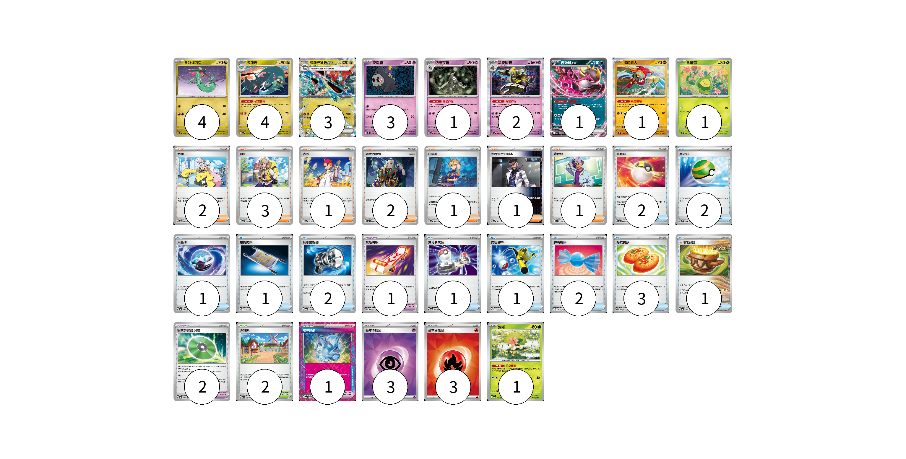 牌組構築方案 以此牌組為基礎新構築牌組 顯示卡面 顯示列表 寶可夢卡(21) 4 4 3 3 1 2 1 1 1 1 寶可夢道具(4) 1 2 1 物品卡(16) 2 2 1 1 2 1 1 2 3 1 支援者卡(11) 2 3 1 2 1 1 1 競技場卡(2) 2 能量卡(6) 3 3 寶可夢卡(21) 卡牌名稱 張數 卡牌名稱 張數 多龍梅西亞 SV8a 118/187 04 多龍奇 SV8a 119/187 04 多龍巴魯托ex SV8a 120/187 03 夜巡靈 SV8a 064/187 03 彷徨夜靈 SV8a 065/187 01 黑夜魔靈 SV8a 066/187 02 吉雉雞ex SVOD 004/020 01 摔角鷹人 SV8a 084/187 01 含羞苞 SV8a 001/187 01 謝米 SV9a 006/063 01 寶可夢道具(4) 卡牌名稱 張數 卡牌名稱 張數 緊急滑板 SVOD 015/020 01 招式學習器 演進 SV8a 160/187 02 璀璨結晶 SV8a 152/187 01 物品卡(16) 卡牌名稱 張數 卡牌名稱 張數 高級球 SVOD 012/020 02 巢穴球 SVM 133/175 02 太晶珠 SV8a 145/187 01 夜間擔架 SVOM 016/021 01 反擊捕捉器 SV8a 139/187 02 寶可夢交替 SV9a 058/063 01 厲害釣竿 SVOD 010/020 01 神奇糖果 SVOD 013/020 02 好友寶芬 SVOD 011/020 03 大地之容器 SV8a 143/187 01 支援者卡(11) 卡牌名稱 張數 卡牌名稱 張數 奇樹 SVOD 016/020 02 派帕 SVOD 018/020 03 赤松 SV8a 163/187 01 老大的指令 SVOD 019/020 02 白蕾雅 SV8a 176/187 01 弗圖博士的劇本 SV8a 175/187 01 吉尼亞 SVD 129/139 01 競技場卡(2) 卡牌名稱 張數 卡牌名稱 張數 深缽鎮 SVK 039/042 02 能量卡(6) 卡牌名稱 張數 卡牌名稱 張數 基本【超】能量 SVOD PSY 03 基本【火】能量 SVK FIR 03 以此牌組為基礎新構築牌組 牌組編碼 POnHvJ-zlfYMi-bTDHTx copy 列印牌組單 牌組編碼已複製 分享至SNS