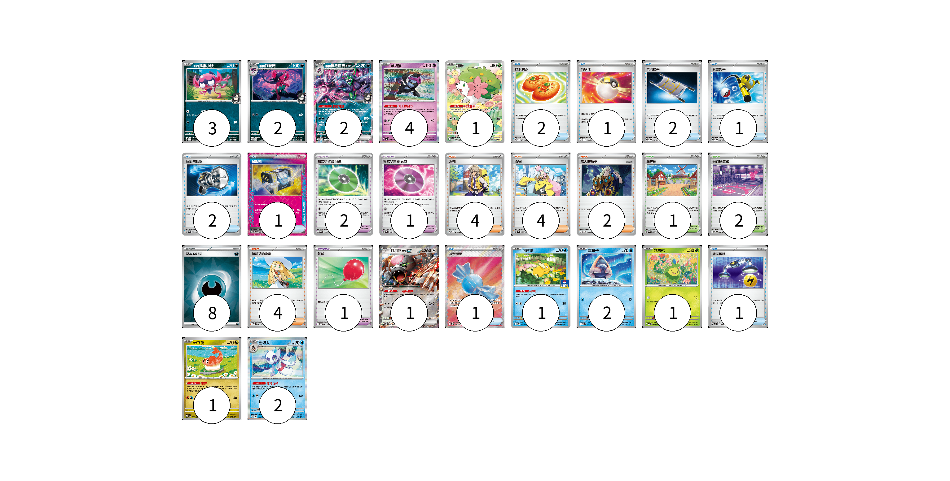 牌組構築方案 以此牌組為基礎新構築牌組 顯示卡面 顯示列表 寶可夢卡(20) 3 2 2 4 1 1 1 2 1 1 2 寶可夢道具(4) 2 1 1 物品卡(11) 2 1 2 1 2 1 1 1 支援者卡(14) 4 4 2 4 競技場卡(3) 1 2 能量卡(8) 8 寶可夢卡(20) 卡牌名稱 張數 卡牌名稱 張數 <瑪俐的>搗蛋小妖 SVOM 005/021 03 <瑪俐的>詐唬魔 SVOM 006/021 02 <瑪俐的>長毛巨魔ex SVOM 007/021 02 願增猿 SV8a 075/187 04 謝米 SV9a 066/063 01 月月熊 赫月 ex SV5a 052/066 01 可達鴨 SV-P 220/SV-P 01 雪童子 M2a 035/193 02 含羞苞 M2a 011/193 01 米立龍 M2a 135/193 01 雪妖女 SV6 033/101 02 寶可夢道具(4) 卡牌名稱 張數 卡牌名稱 張數 招式學習器 演進 SV8a 160/187 02 招式學習器 衰退 SV8a 161/187 01 氣球 SV11B 082/086 01 物品卡(11) 卡牌名稱 張數 卡牌名稱 張數 好友寶芬 SVOD 011/020 02 高級球 SVOD 012/020 01 夜間擔架 SVOM 016/021 02 厲害釣竿 SVOD 010/020 01 反擊捕捉器 SV8a 139/187 02 秘密箱 SV6 092/101 01 神奇糖果 M1S 082/063 01 能量轉移 SVM 127/175 01 支援者卡(14) 卡牌名稱 張數 卡牌名稱 張數 派帕 SVOD 018/020 04 奇樹 SVM 160/175 04 老大的指令 SVOD 019/020 02 莉莉艾的決意 M1L 062/063 04 競技場卡(3) 卡牌名稱 張數 卡牌名稱 張數 深缽鎮 SVK 039/042 01 尖釘鎮道館 SVOM 021/021 02 能量卡(8) 卡牌名稱 張數 卡牌名稱 張數 基本【惡】能量 SVOM DAR 08 以此牌組為基礎新構築牌組 牌組編碼 PQJHkj-qvpRGv-DhvOEg copy 列印牌組單 牌組編碼已複製 分享至SNS