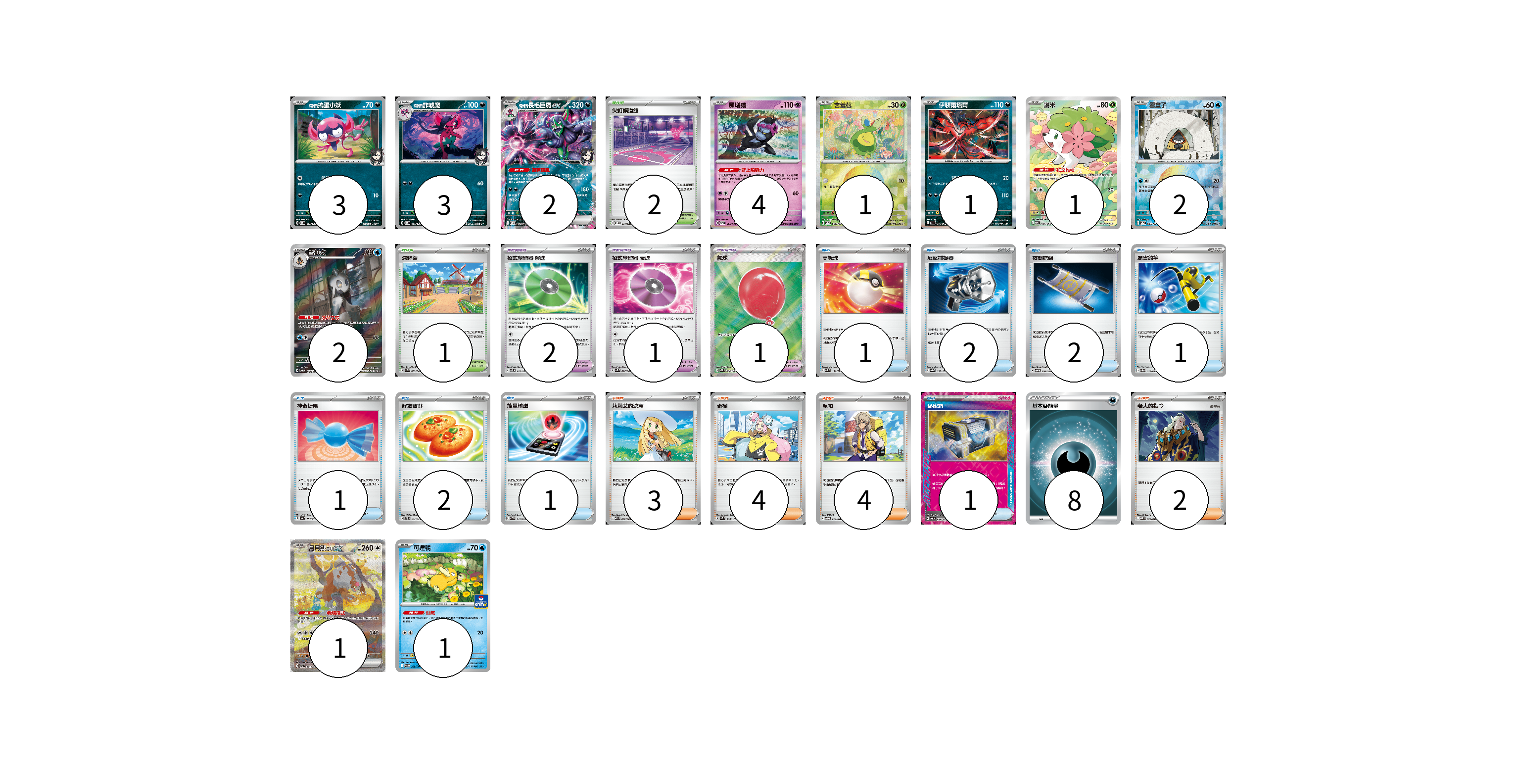牌組構築方案 以此牌組為基礎新構築牌組 顯示卡面 顯示列表 寶可夢卡(21) 3 3 2 4 1 1 1 2 2 1 1 寶可夢道具(4) 2 1 1 物品卡(11) 1 2 2 1 1 2 1 1 支援者卡(13) 3 4 4 2 競技場卡(3) 2 1 能量卡(8) 8 寶可夢卡(21) 卡牌名稱 張數 卡牌名稱 張數 <瑪俐的>搗蛋小妖 SVOM 005/021 03 <瑪俐的>詐唬魔 SVOM 006/021 03 <瑪俐的>長毛巨魔ex SVOM 007/021 02 願增猿 SV6 055/101 04 含羞苞 SV8a 001/187 01 伊裴爾塔爾 M1L 040/063 01 謝米 SV9a 066/063 01 雪童子 SV8a 037/187 02 雪妖女 SV6 104/101 02 月月熊 赫月 ex SV5a 091/066 01 可達鴨 SV-P 220/SV-P 01 寶可夢道具(4) 卡牌名稱 張數 卡牌名稱 張數 招式學習器 演進 SVTL 017/021 02 招式學習器 衰退 SVK 026/042 01 氣球 M1L 084/063 01 物品卡(11) 卡牌名稱 張數 卡牌名稱 張數 高級球 SVM 134/175 01 反擊捕捉器 SV8a 139/187 02 夜間擔架 SVOM 016/021 02 厲害釣竿 SVEM 011/020 01 神奇糖果 SV4a 163/190 01 好友寶芬 SVTS 012/022 02 能量輸送 SVAW 012/023 01 秘密箱 SV6 092/101 01 支援者卡(13) 卡牌名稱 張數 卡牌名稱 張數 莉莉艾的決意 M1L 062/063 03 奇樹 SVM 160/175 04 派帕 SVOD 018/020 04 老大的指令 MBD 020/022 02 競技場卡(3) 卡牌名稱 張數 卡牌名稱 張數 尖釘鎮道館 SVOM 021/021 02 深缽鎮 SVK 039/042 01 能量卡(8) 卡牌名稱 張數 卡牌名稱 張數 基本惡能量 SLD DAR 08 以此牌組為基礎新構築牌組 牌組編碼 PRSaFP-qvhKtk-izUcId copy 列印牌組單 牌組編碼已複製 分享至SNS