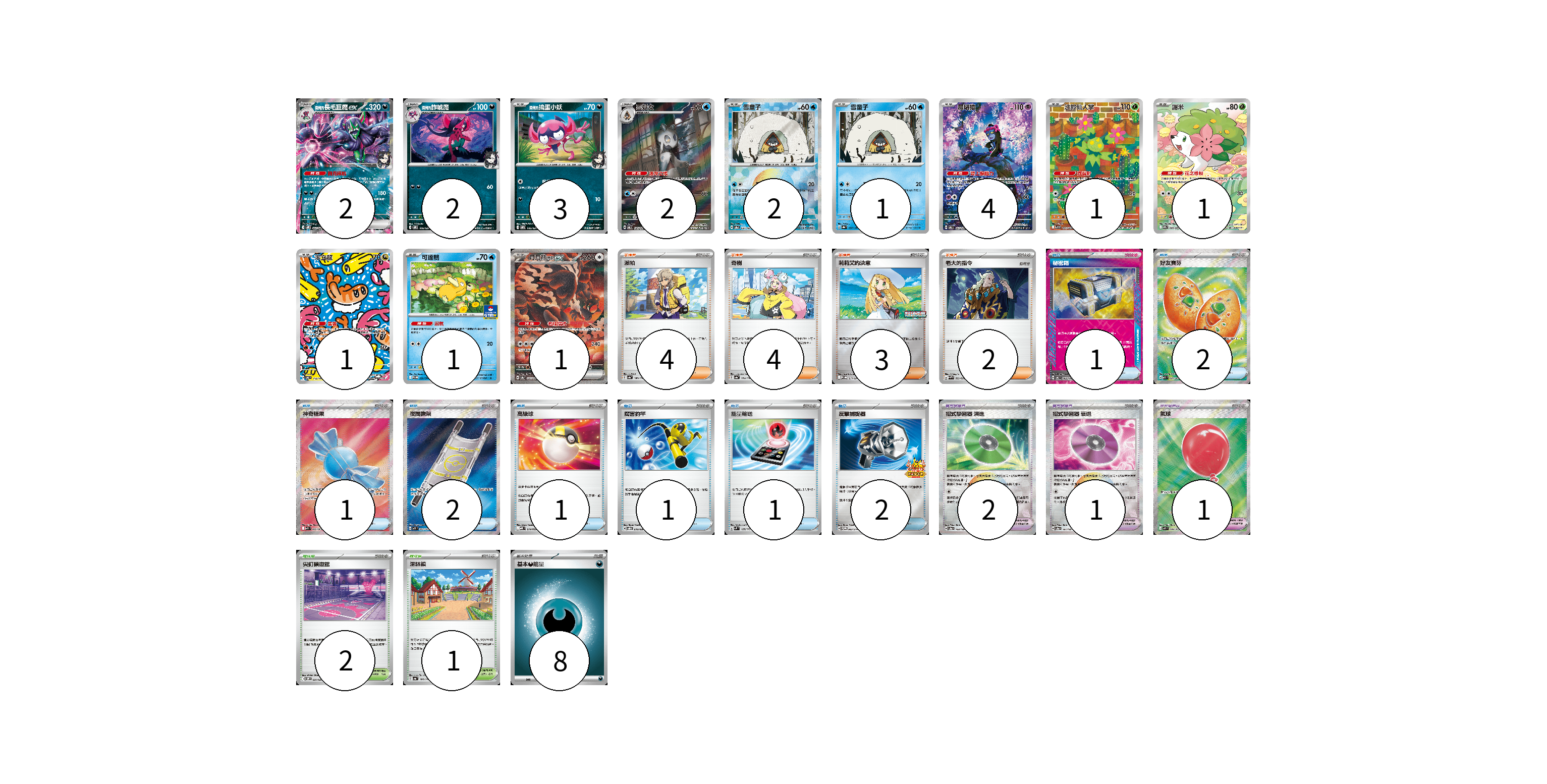 牌組構築方案 以此牌組為基礎新構築牌組 顯示卡面 顯示列表 寶可夢卡(21) 2 2 3 2 2 1 4 1 1 1 1 1 寶可夢道具(4) 2 1 1 物品卡(11) 1 2 1 2 1 1 1 2 支援者卡(13) 4 4 3 2 競技場卡(3) 2 1 能量卡(8) 8 寶可夢卡(21) 卡牌名稱 張數 卡牌名稱 張數 <瑪俐的>長毛巨魔ex SVOM 007/021 02 <瑪俐的>詐唬魔 SVOM 006/021 02 <瑪俐的>搗蛋小妖 SVOM 005/021 03 雪妖女 SV6 104/101 02 雪童子 SV8a 037/187 02 雪童子 SV8a 037/187 01 願增猿 SV6 107/101 04 沙鈴仙人掌 SV9 101/100 01 謝米 SV9a 066/063 01 米立龍 SV6 112/101 01 可達鴨 SV-P 220/SV-P 01 月月熊 赫月ex SV8a 225/187 01 寶可夢道具(4) 卡牌名稱 張數 卡牌名稱 張數 招式學習器 演進 SV8a 160/187 02 招式學習器 衰退 SV8a 161/187 01 氣球 M1L 084/063 01 物品卡(11) 卡牌名稱 張數 卡牌名稱 張數 秘密箱 SV6 092/101 01 好友寶芬 M1S 081/063 02 神奇糖果 M1S 082/063 01 夜間擔架 M1L 083/063 02 高級球 MBD 014/022 01 厲害釣竿 SVOD 010/020 01 能量輸送 SVM 128/175 01 反擊捕捉器 SV-P 083/SV-P 02 支援者卡(13) 卡牌名稱 張數 卡牌名稱 張數 派帕 SV4a 180/190 04 奇樹 SV4a 174/190 04 莉莉艾的決意 M-P 011/M-P 03 老大的指令 SVHM 022/022 02 競技場卡(3) 卡牌名稱 張數 卡牌名稱 張數 尖釘鎮道館 SVOM 021/021 02 深缽鎮 SV4a 185/190 01 能量卡(8) 卡牌名稱 張數 卡牌名稱 張數 基本【惡】能量 MBG DAR 08 以此牌組為基礎新構築牌組 牌組編碼 PSSDCN-UxcYBI-aPTSye copy 列印牌組單 牌組編碼已複製 分享至SNS