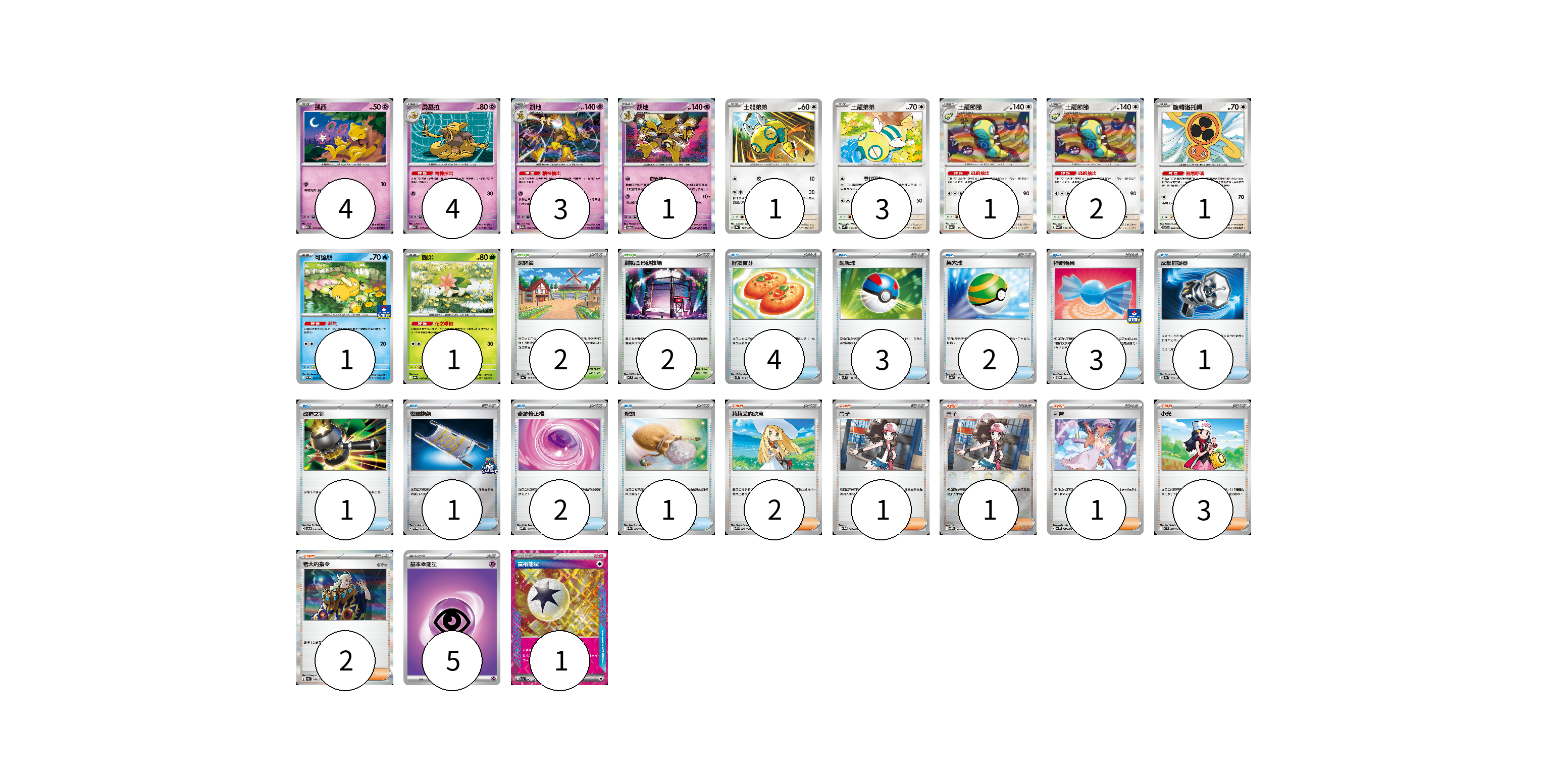 牌組構築方案 以此牌組為基礎新構築牌組 顯示卡面 顯示列表 寶可夢卡(22) 4 4 3 1 1 3 1 2 1 1 1 物品卡(18) 4 3 2 3 1 1 1 2 1 支援者卡(10) 2 1 1 1 3 2 競技場卡(4) 2 2 能量卡(6) 5 1 寶可夢卡(22) 卡牌名稱 張數 卡牌名稱 張數 凱西 M1S 036/063 04 勇基拉 M1S 037/063 04 胡地 M1S 038/063 03 胡地 SV6 049/101 01 土龍弟弟 SV8a 129/187 01 土龍弟弟 SV2P 056/071 03 土龍節節 SV8a 130/187 01 土龍節節 SV5K 057/071 02 旋轉洛托姆 SV7 080/102 01 可達鴨 SV-P 220/SV-P 01 謝米 SV9a 006/063 01 物品卡(18) 卡牌名稱 張數 卡牌名稱 張數 好友寶芬 SV5K 063/071 04 超級球 SVM 132/175 03 巢穴球 SV4a 159/190 02 神奇糖果 SV-P 104/SV-P 03 反擊捕捉器 SV8a 139/187 01 改造之錘 SV5a 054/066 01 夜間擔架 SV-P 204/SV-P 01 奇跡修正檔 MBD 017/022 02 聖灰 SV9a 056/063 01 支援者卡(10) 卡牌名稱 張數 卡牌名稱 張數 莉莉艾的決意 M1L 062/063 02 鬥子 SV11W 085/086 01 鬥子 SV11W 085/086 01 莉普 SV4M 066/066 01 小光 M2 077/080 03 老大的指令 SV4a 181/190 02 競技場卡(4) 卡牌名稱 張數 卡牌名稱 張數 深缽鎮 SV4a 185/190 02 對戰圓形競技場 M2 079/080 02 能量卡(6) 卡牌名稱 張數 卡牌名稱 張數 基本超能量 sv-p PSY 05 富裕能量 SV7a 064/064 01 以此牌組為基礎新構築牌組 牌組編碼 PUPOSA-HCmLox-COtWbn copy 列印牌組單 牌組編碼已複製 分享至SNS