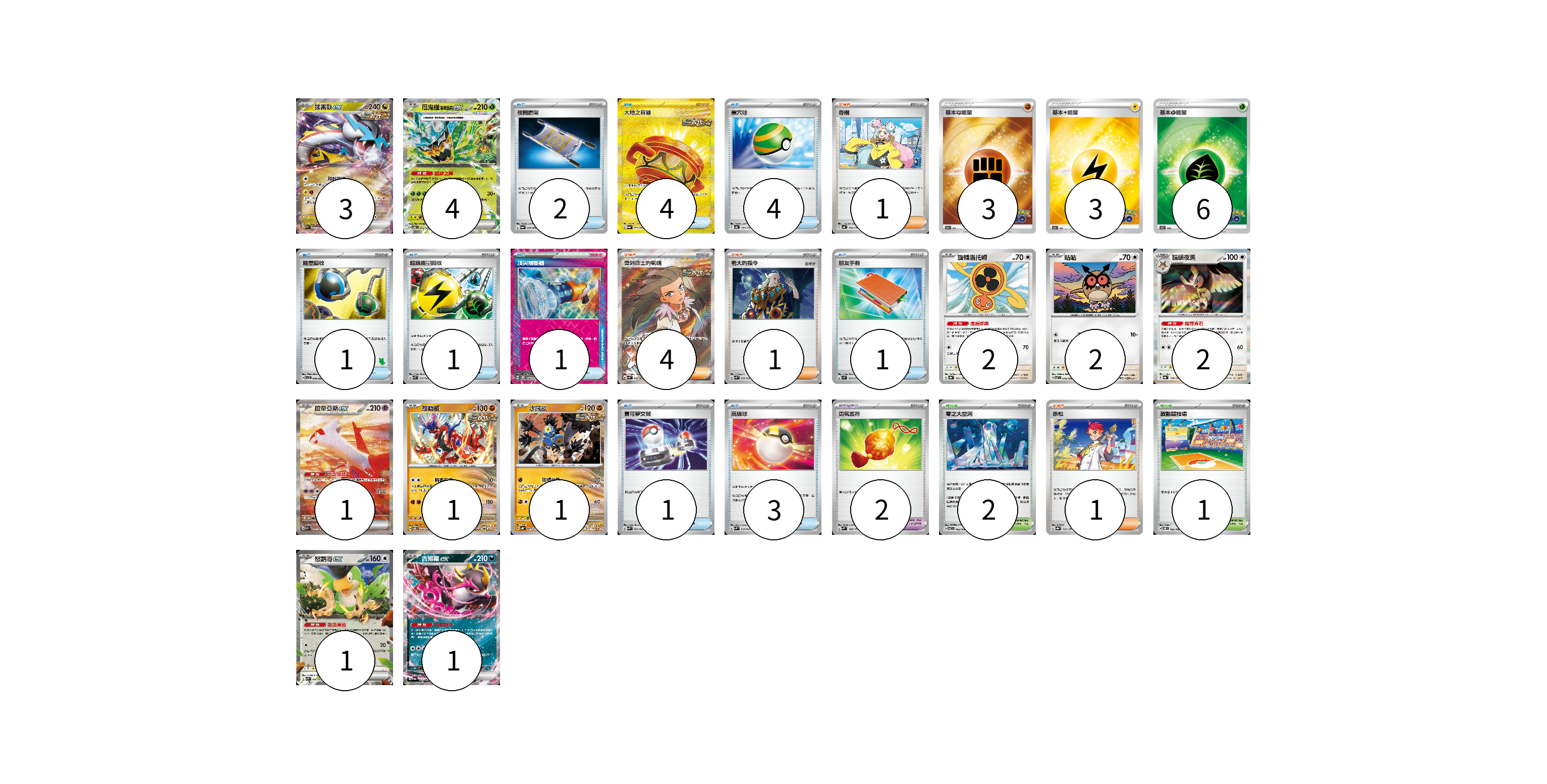 牌組構築方案 以此牌組為基礎新構築牌組 顯示卡面 顯示列表 寶可夢卡(18) 3 4 2 2 2 1 1 1 1 1 寶可夢道具(2) 2 物品卡(18) 2 4 4 1 1 1 1 1 3 支援者卡(7) 1 4 1 1 競技場卡(3) 2 1 能量卡(12) 3 3 6 寶可夢卡(18) 卡牌名稱 張數 卡牌名稱 張數 猛雷鼓ex SV5K 053/071 03 厄鬼椪 碧草面具ex SV6 016/101 04 旋轉洛托姆 SV8a 131/187 02 咕咕 SV7 076/102 02 貓頭夜鷹 SV8a 128/187 02 拉帝亞斯ex SV7a 087/064 01 故勒頓 SV8 069/106 01 沙鐵皮 SVHK 009/022 01 怒鸚哥ex SVK 006/042 01 吉雉雞ex SV6a 038/064 01 寶可夢道具(2) 卡牌名稱 張數 卡牌名稱 張數 勇氣護符 SVM 142/175 02 物品卡(18) 卡牌名稱 張數 卡牌名稱 張數 夜間擔架 SV6a 056/064 02 大地之容器 SV6a 093/064 04 巢穴球 SV4a 159/190 04 能量回收 SVI 049/066 01 超級能量回收 SVK 010/042 01 頂尖捕捉器 SV5M 062/071 01 朋友手冊 SV1S 069/078 01 寶可夢交替 SVK 022/042 01 高級球 SVK 018/042 03 支援者卡(7) 卡牌名稱 張數 卡牌名稱 張數 奇樹 SV4a 174/190 01 奧琳博士的氣魄 SV4K 085/066 04 老大的指令 SVK 036/042 01 赤松 SV8a 163/187 01 競技場卡(3) 卡牌名稱 張數 卡牌名稱 張數 零之大空洞 SV7 102/102 02 激動競技場 SV8 105/106 01 能量卡(12) 卡牌名稱 張數 卡牌名稱 張數 基本鬥能量 S10b FIG 03 基本雷能量 S10b LIG 03 基本草能量 S10b GRA 06 以此牌組為基礎新構築牌組 牌組編碼 PVmayx-LwKUEB-KulIZo copy 列印牌組單 牌組編碼已複製 分享至SNS