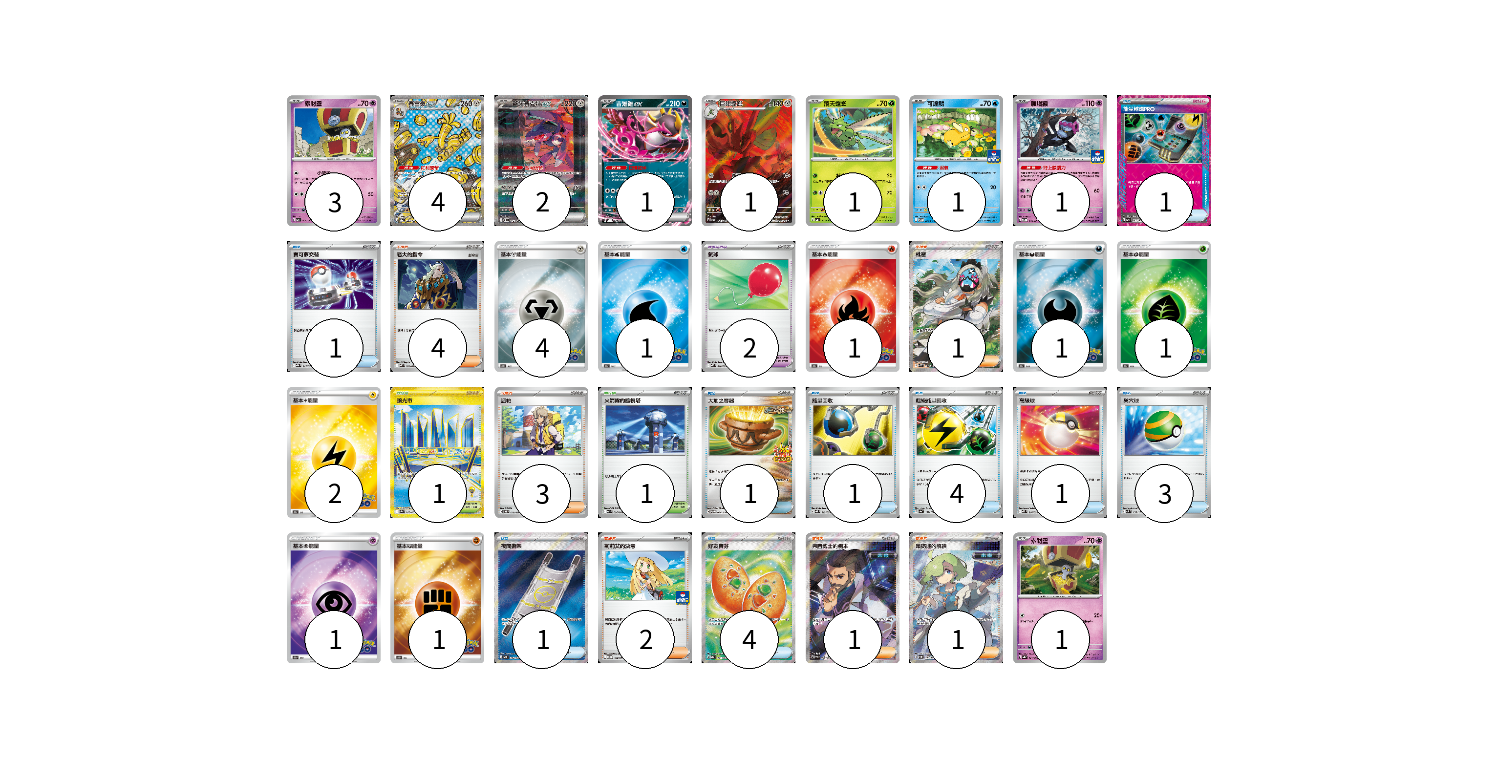 牌組構築方案 以此牌組為基礎新構築牌組 顯示卡面 顯示列表 寶可夢卡(15) 3 4 2 1 1 1 1 1 1 寶可夢道具(2) 2 物品卡(17) 1 1 1 1 4 1 3 1 4 支援者卡(12) 4 1 3 2 1 1 競技場卡(2) 1 1 能量卡(12) 4 1 1 1 1 2 1 1 寶可夢卡(15) 卡牌名稱 張數 卡牌名稱 張數 索財靈 SV7a 024/064 03 賽富豪ex SV8a 220/187 04 蓋諾賽克特ex SV11B 172/086 02 吉雉雞ex SVOD 004/020 01 巨鉗螳螂 SV3 116/108 01 飛天螳螂 SV2a 123/165 01 可達鴨 SV-P 220/SV-P 01 願增猿 M-P 014/M-P 01 索財靈 SV3a 021/062 01 寶可夢道具(2) 卡牌名稱 張數 卡牌名稱 張數 氣球 MBD 018/022 02 物品卡(17) 卡牌名稱 張數 卡牌名稱 張數 能量輸送PRO SV7a 052/064 01 寶可夢交替 MBG 015/022 01 大地之容器 SV-P 084/SV-P 01 能量回收 SVQL 012/022 01 超級能量回收 SV4a 157/190 04 高級球 MBD 014/022 01 巢穴球 SVM 133/175 03 夜間擔架 M1L 083/063 01 好友寶芬 M1S 081/063 04 支援者卡(12) 卡牌名稱 張數 卡牌名稱 張數 老大的指令 MBD 020/022 04 枇琶 SV5K 091/071 01 派帕 SVOD 018/020 03 莉莉艾的決意 M-P 018/M-P 02 弗圖博士的劇本 SV4M 086/066 01 暗碼迷的解讀 SV5M 090/071 01 競技場卡(2) 卡牌名稱 張數 卡牌名稱 張數 釀光市 SV9a 092/063 01 火箭隊的監視塔 SV10 096/098 01 能量卡(12) 卡牌名稱 張數 卡牌名稱 張數 基本鋼能量 S10b MET 04 基本水能量 S10b WAT 01 基本火能量 S10b FIR 01 基本惡能量 S10b DAR 01 基本草能量 S10b GRA 01 基本雷能量 S10b LIG 02 基本超能量 S10b PSY 01 基本鬥能量 S10b FIG 01 以此牌組為基礎新構築牌組 牌組編碼 PXxjzR-WYHPwc-dyvvEr copy 列印牌組單 牌組編碼已複製 分享至SNS