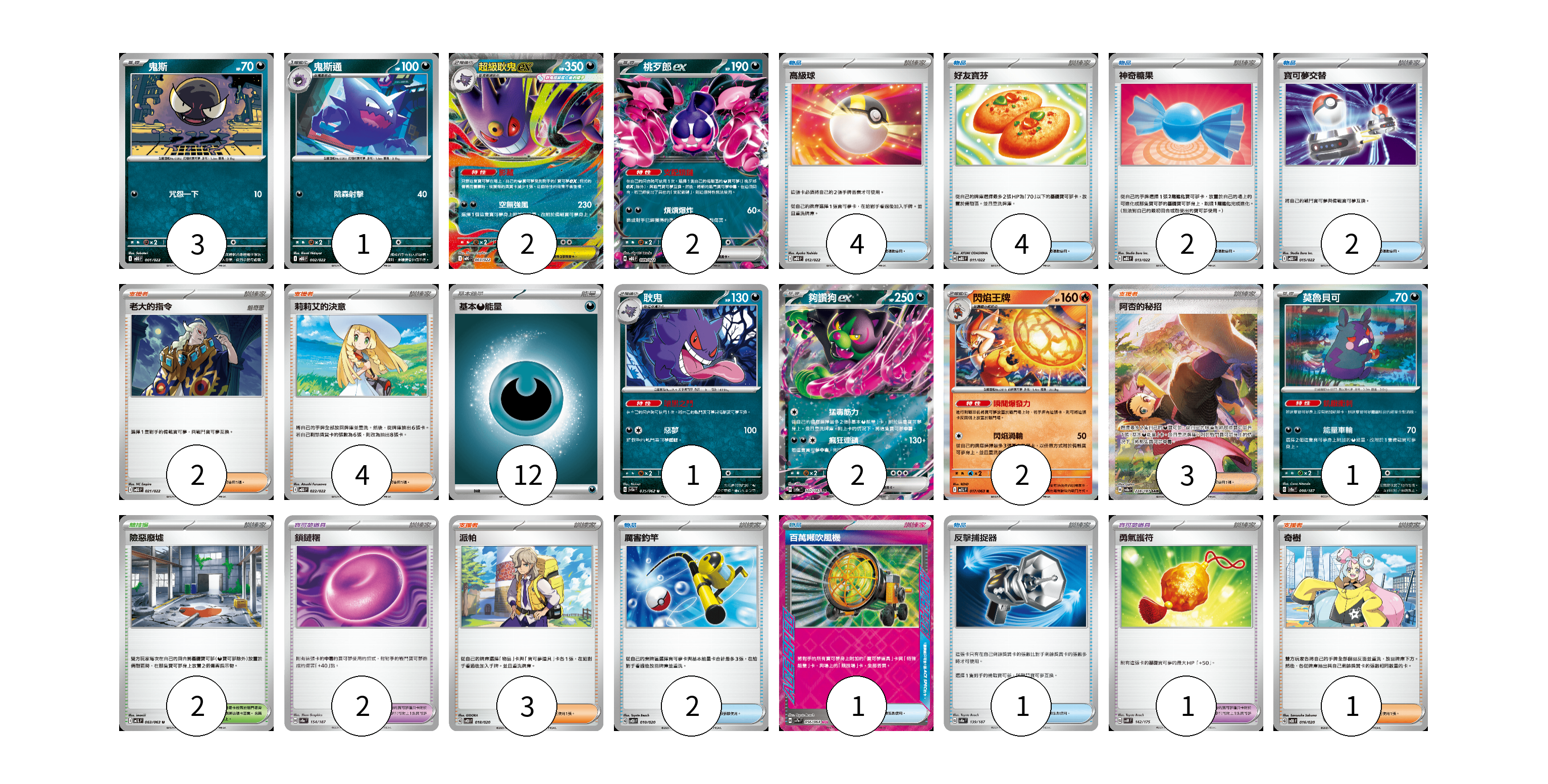 牌組構築方案 以此牌組為基礎新構築牌組 顯示卡面 顯示列表 寶可夢卡(14) 3 1 2 2 1 2 2 1 寶可夢道具(3) 2 1 物品卡(16) 4 4 2 2 2 1 1 支援者卡(13) 2 4 3 3 1 競技場卡(2) 2 能量卡(12) 12 寶可夢卡(14) 卡牌名稱 張數 卡牌名稱 張數 鬼斯 MBG 001/022 03 鬼斯通 MBG 002/022 01 超級耿鬼ex MBG 003/022 02 桃歹郎ex MBG 009/022 02 耿鬼 SV3a 035/062 01 夠讚狗ex SV8a 102/187 02 閃焰王牌 M1L 017/063 02 莫魯貝可 SV8a 098/187 01 寶可夢道具(3) 卡牌名稱 張數 卡牌名稱 張數 鎖鏈糬 SV8a 154/187 02 勇氣護符 SVM 142/175 01 物品卡(16) 卡牌名稱 張數 卡牌名稱 張數 高級球 MBG 012/022 04 好友寶芬 MBG 011/022 04 神奇糖果 MBG 013/022 02 寶可夢交替 MBG 015/022 02 厲害釣竿 SVOD 010/020 02 百萬噸吹風機 SV7a 056/064 01 反擊捕捉器 SV8a 139/187 01 支援者卡(13) 卡牌名稱 張數 卡牌名稱 張數 老大的指令 MBG 021/022 02 莉莉艾的決意 MBG 022/022 04 阿杏的秘招 SV8a 228/187 03 派帕 SVOD 018/020 03 奇樹 SVOD 016/020 01 競技場卡(2) 卡牌名稱 張數 卡牌名稱 張數 險惡廢墟 M1L 063/063 02 能量卡(12) 卡牌名稱 張數 卡牌名稱 張數 基本【惡】能量 MBG DAR 12 以此牌組為基礎新構築牌組 牌組編碼 PYaMXf-XkwIeD-hJceRG copy 列印牌組單 牌組編碼已複製 分享至SNS