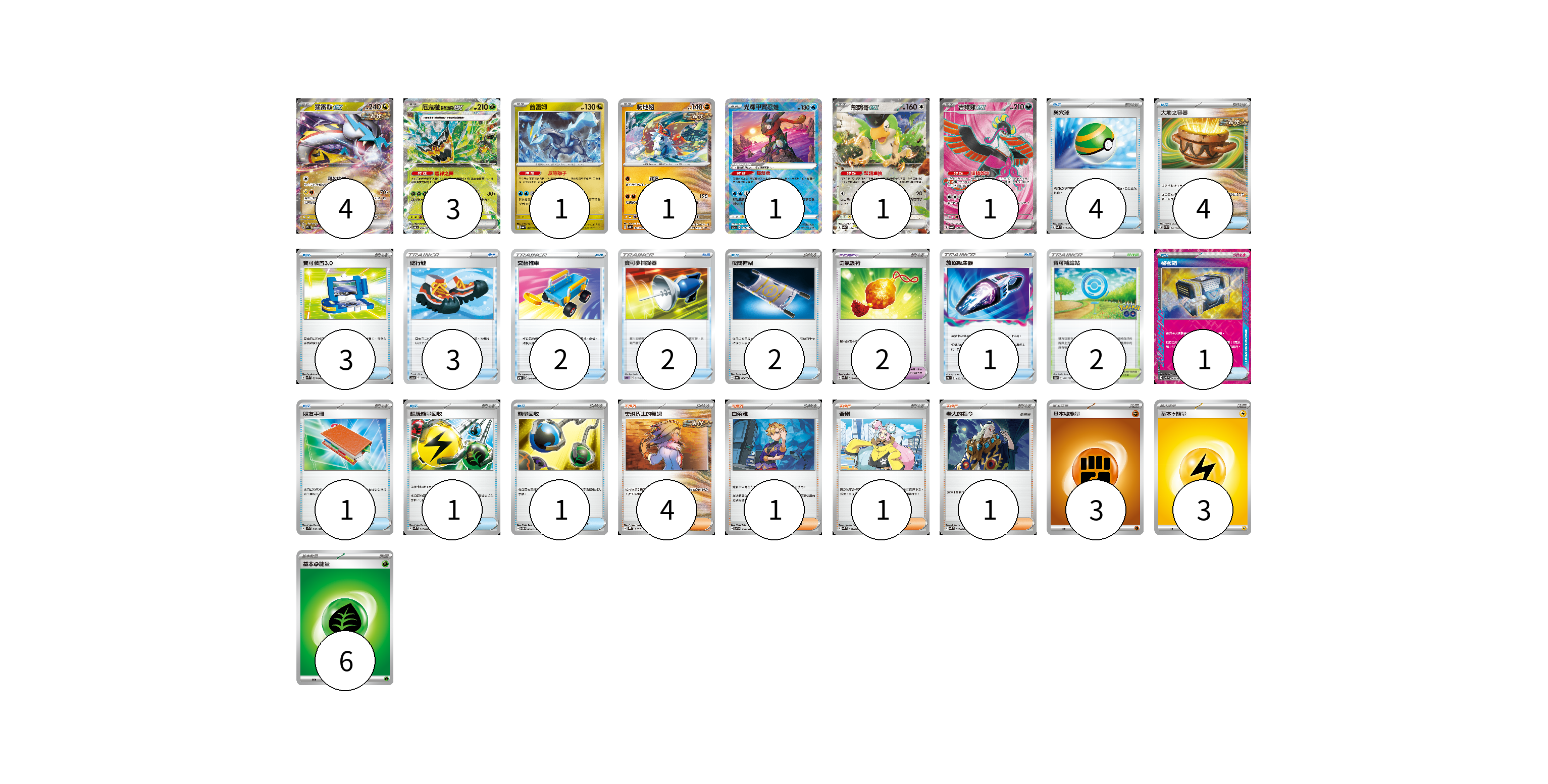 牌組構築方案 以此牌組為基礎新構築牌組 顯示卡面 顯示列表 寶可夢卡(12) 4 3 1 1 1 1 1 寶可夢道具(2) 2 物品卡(25) 4 4 3 3 2 2 2 1 1 1 1 1 支援者卡(7) 4 1 1 1 競技場卡(2) 2 能量卡(12) 3 3 6 寶可夢卡(12) 卡牌名稱 張數 卡牌名稱 張數 猛雷鼓ex SV5K 053/071 04 厄鬼椪 碧草面具ex SV6 016/101 03 酋雷姆 SV6a 047/064 01 爬地翅 SV4K 041/066 01 光輝甲賀忍蛙 S12a 033/172 01 怒鸚哥ex SV4a 154/190 01 吉雉雞ex SV6a 081/064 01 寶可夢道具(2) 卡牌名稱 張數 卡牌名稱 張數 勇氣護符 SVK 024/042 02 物品卡(25) 卡牌名稱 張數 卡牌名稱 張數 巢穴球 SVK 016/042 04 大地之容器 SVK 012/042 04 寶可裝置3.0 SVK 021/042 03 健行鞋 S12a 137/172 03 交替推車 SVTR 009/021 02 寶可夢捕捉器 SDM 017/022 02 夜間擔架 SV6a 056/064 02 放逐吸塵器 SVF 023/038 01 秘密箱 SV6 092/101 01 朋友手冊 SV1S 069/078 01 超級能量回收 SVK 010/042 01 能量回收 SVTM 009/022 01 支援者卡(7) 卡牌名稱 張數 卡牌名稱 張數 奧琳博士的氣魄 SVHK 017/022 04 白蕾雅 SV7 100/102 01 奇樹 SVK 031/042 01 老大的指令 SVK 036/042 01 競技場卡(2) 卡牌名稱 張數 卡牌名稱 張數 寶可補給站 S10b 071/071 02 能量卡(12) 卡牌名稱 張數 卡牌名稱 張數 基本【鬥】能量 SVHK FIG 03 基本【雷】能量 SVHM LIG 03 基本【草】能量 SVF GRA 06 以此牌組為基礎新構築牌組 牌組編碼 PZConP-jCYGSu-CxkmTj copy 列印牌組單 牌組編碼已複製 分享至SNS