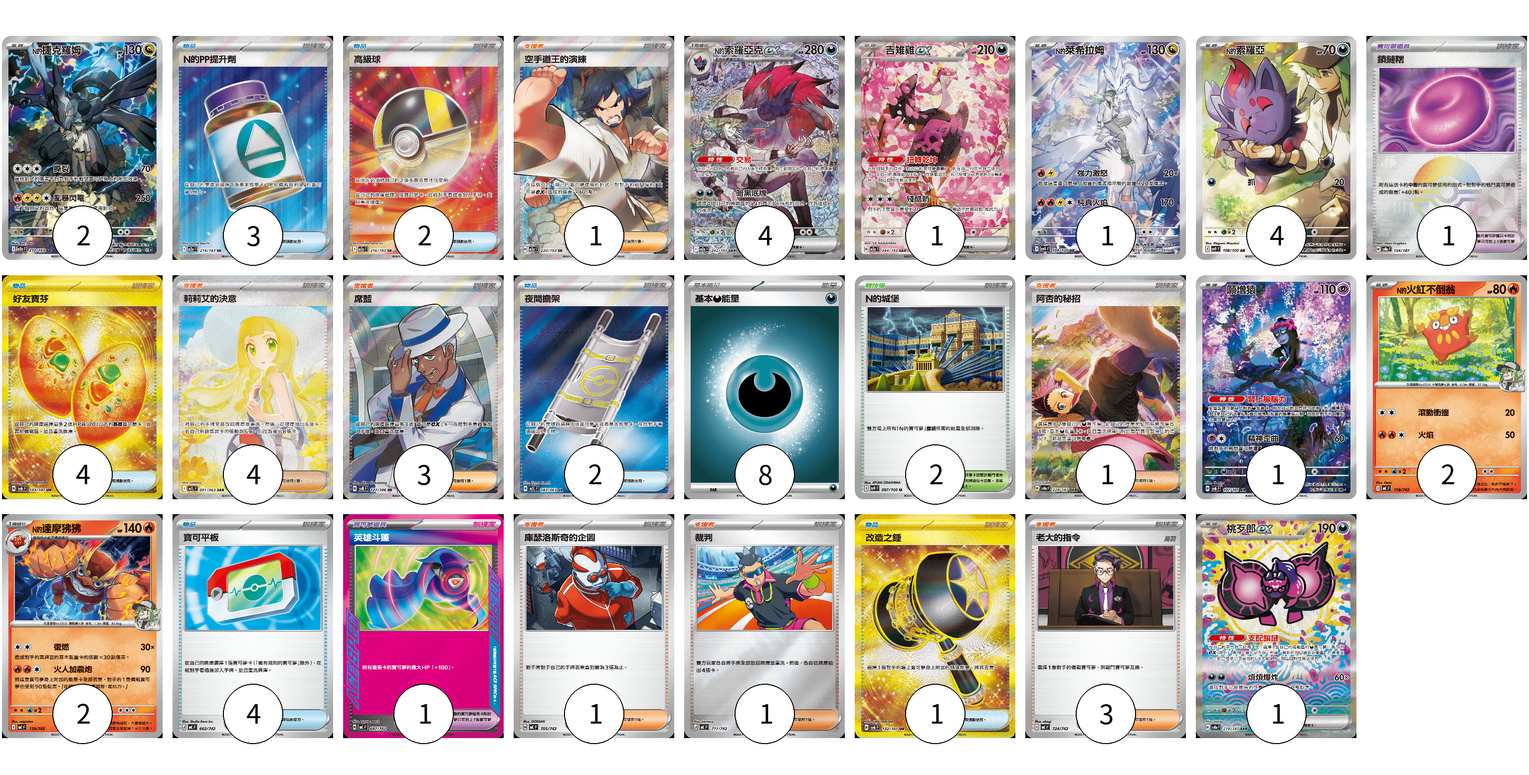 牌組構築方案 以此牌組為基礎新構築牌組 顯示卡面 顯示列表 寶可夢卡(18) 2 4 1 1 4 1 2 2 1 寶可夢道具(2) 1 1 物品卡(16) 3 2 4 2 4 1 支援者卡(14) 1 4 3 1 1 1 3 競技場卡(2) 2 能量卡(8) 8 寶可夢卡(18) 卡牌名稱 張數 卡牌名稱 張數 N的捷克羅姆 M2a 210/193 02 N的索羅亞克ex M2a 242/193 04 吉雉雞ex M2a 244/193 01 N的萊希拉姆 SV9 109/100 01 N的索羅亞 SV9 108/100 04 願增猿 SV6 107/101 01 N的火紅不倒翁 MC 118/742 02 N的達摩狒狒 MC 119/742 02 桃歹郎ex SV8a 219/187 01 寶可夢道具(2) 卡牌名稱 張數 卡牌名稱 張數 鎖鏈糬 SV8a 154/187 01 英雄斗篷 MC 687/742 01 物品卡(16) 卡牌名稱 張數 卡牌名稱 張數 N的PP提升劑 M2a 214/193 03 高級球 M2a 216/193 02 好友寶芬 SV6 133/101 04 夜間擔架 M1L 083/063 02 寶可平板 MC 662/742 04 改造之錘 SV6 132/101 01 支援者卡(14) 卡牌名稱 張數 卡牌名稱 張數 空手道王的演練 M2a 220/193 01 莉莉艾的決意 M1L 091/063 04 席藍 SV8 127/106 03 阿杏的秘招 SV8a 228/187 01 庫瑟洛斯奇的企圖 MC 705/742 01 裁判 MC 711/742 01 老大的指令 MC 724/742 03 競技場卡(2) 卡牌名稱 張數 卡牌名稱 張數 N的城堡 SV9 097/100 02 能量卡(8) 卡牌名稱 張數 卡牌名稱 張數 基本【惡】能量 M-P DAR 08 以此牌組為基礎新構築牌組 牌組編碼 PaDEAN-pXbMwr-zHZtMX copy 列印牌組單 牌組編碼已複製 分享至SNS