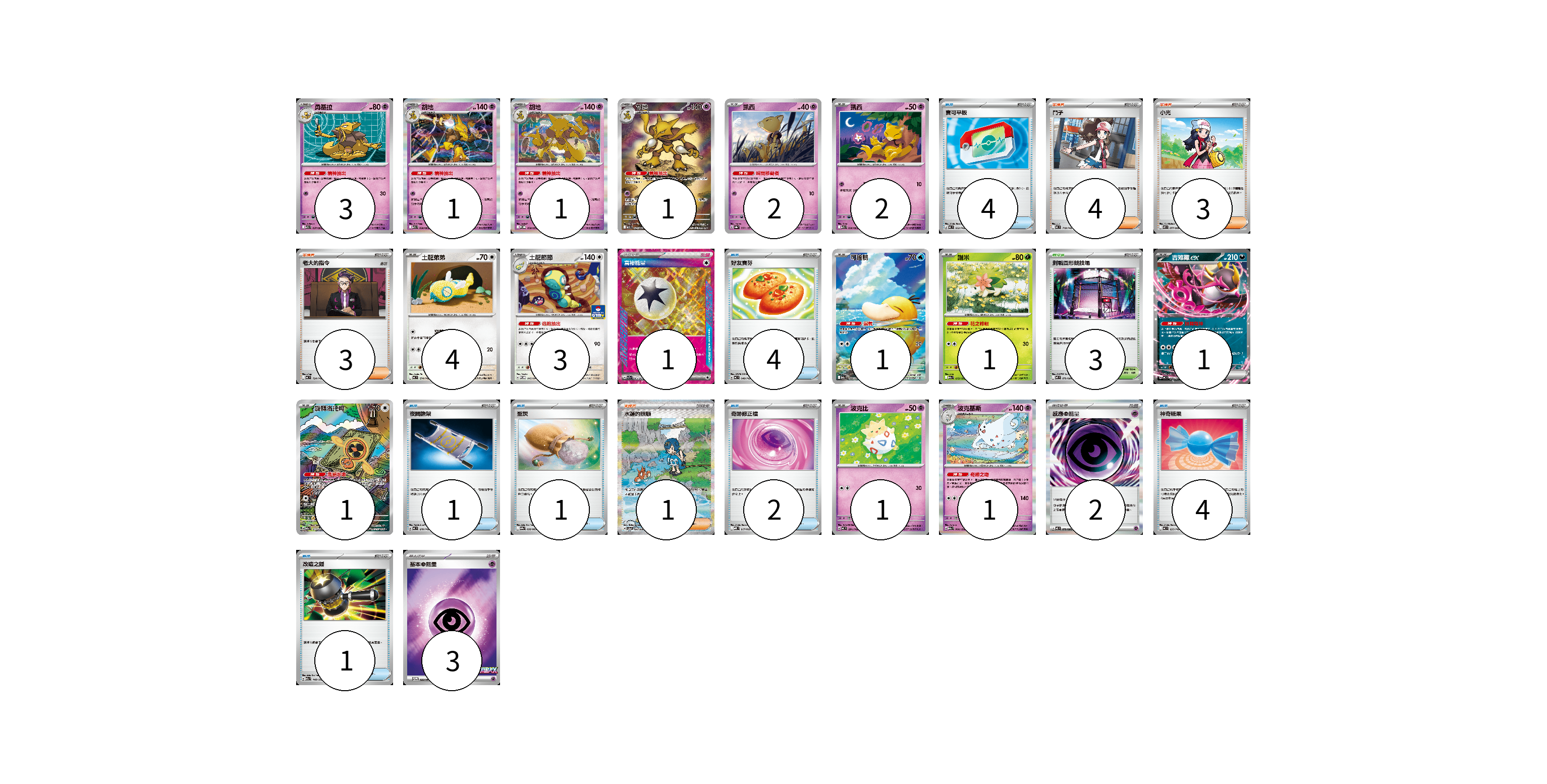 牌組構築方案 以此牌組為基礎新構築牌組 顯示卡面 顯示列表 寶可夢卡(23) 3 1 1 1 2 2 4 3 1 1 1 1 1 1 物品卡(17) 4 4 1 1 2 4 1 支援者卡(11) 4 3 3 1 競技場卡(3) 3 能量卡(6) 1 2 3 寶可夢卡(23) 卡牌名稱 張數 卡牌名稱 張數 勇基拉 M1S 037/063 03 胡地 M1S 038/063 01 胡地 M-P 058/M-P 01 胡地 M1S 071/063 01 凱西 SV8a 057/187 02 凱西 M1S 036/063 02 土龍弟弟 MC 574/742 04 土龍節節 M-P 045/M-P 03 可達鴨 M2a 199/193 01 謝米 M2a 012/193 01 吉雉雞ex MC 489/742 01 旋轉洛托姆 M2a 213/193 01 波克比 MC 291/742 01 波克基斯 M2a 066/193 01 物品卡(17) 卡牌名稱 張數 卡牌名稱 張數 寶可平板 MC 662/742 04 好友寶芬 MC 648/742 04 夜間擔架 MC 670/742 01 聖灰 SV9a 056/063 01 奇跡修正檔 MBD 017/022 02 神奇糖果 MC 655/742 04 改造之錘 M2a 148/193 01 支援者卡(11) 卡牌名稱 張數 卡牌名稱 張數 鬥子 MC 718/742 04 小光 M2 077/080 03 老大的指令 MC 724/742 03 水蓮的照顧 SV5a 093/066 01 競技場卡(3) 卡牌名稱 張數 卡牌名稱 張數 對戰圓形競技場 M2 079/080 03 能量卡(6) 卡牌名稱 張數 卡牌名稱 張數 富裕能量 SV7a 064/064 01 感應【超】能量 M3 079/080 02 基本【超】能量 M-P 033/M-P 03 以此牌組為基礎新構築牌組 牌組編碼 PbhppY-VxlCGW-uYezPU copy 列印牌組單 牌組編碼已複製 分享至SNS