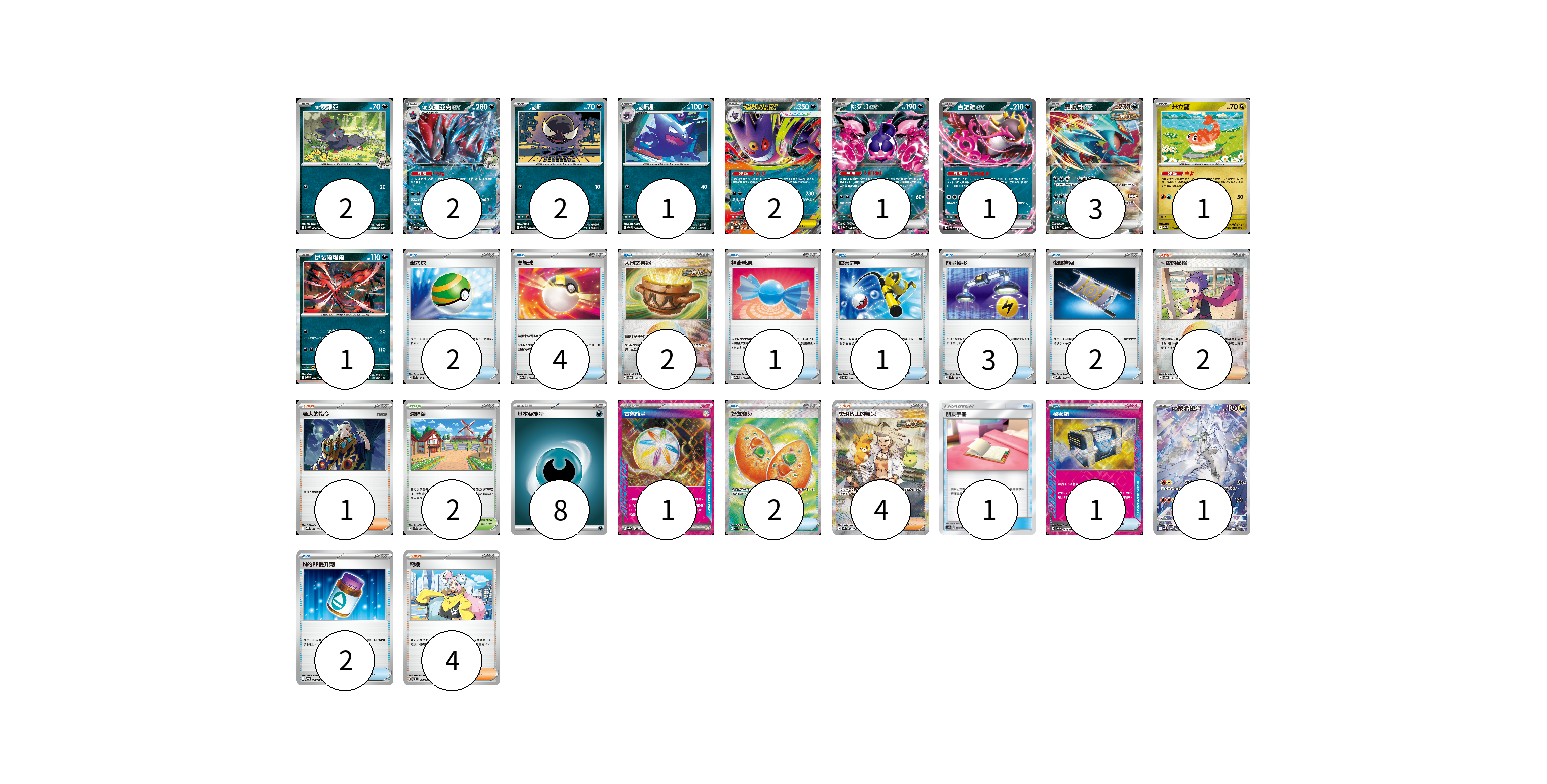 牌組構築方案 以此牌組為基礎新構築牌組 顯示卡面 顯示列表 寶可夢卡(17) 2 2 2 1 2 1 1 3 1 1 1 寶可夢道具(4) 4 物品卡(21) 2 4 2 1 1 3 2 2 1 1 2 支援者卡(7) 2 1 4 競技場卡(2) 2 能量卡(9) 8 1 寶可夢卡(17) 卡牌名稱 張數 卡牌名稱 張數 N的索羅亞 SV9 060/100 02 N的索羅亞克ex SV9 061/100 02 鬼斯 MBG 001/022 02 鬼斯通 MBG 002/022 01 超級耿鬼ex MBG 003/022 02 桃歹郎ex SV8a 105/187 01 吉雉雞ex SVOD 004/020 01 轟鳴月ex SV8a 101/187 03 米立龍 MBG 010/022 01 伊裴爾塔爾 M1L 040/063 01 N的萊希拉姆 SV9 109/100 01 寶可夢道具(4) 卡牌名稱 張數 卡牌名稱 張數 奇樹 SVTL 018/021 04 物品卡(21) 卡牌名稱 張數 卡牌名稱 張數 巢穴球 SVM 133/175 02 高級球 MBG 012/022 04 大地之容器 SV8a 143/187 02 神奇糖果 MBG 013/022 01 厲害釣竿 SVOD 010/020 01 能量轉移 SVM 127/175 03 夜間擔架 MBD 016/022 02 好友寶芬 M1S 081/063 02 朋友手冊 AS6b 188/194 01 秘密箱 SV6 092/101 01 N的PP提升劑 SV9 089/100 02 支援者卡(7) 卡牌名稱 張數 卡牌名稱 張數 阿杏的秘招 SV8a 166/187 02 老大的指令 MBG 021/022 01 奧琳博士的氣魄 SV4K 091/066 04 競技場卡(2) 卡牌名稱 張數 卡牌名稱 張數 深缽鎮 SVK 039/042 02 能量卡(9) 卡牌名稱 張數 卡牌名稱 張數 基本惡能量 sv-p DAR 08 古舊能量 SV8a 187/187 01 以此牌組為基礎新構築牌組 牌組編碼 PchECW-fcbKqd-PGCRQH copy 列印牌組單 牌組編碼已複製 分享至SNS