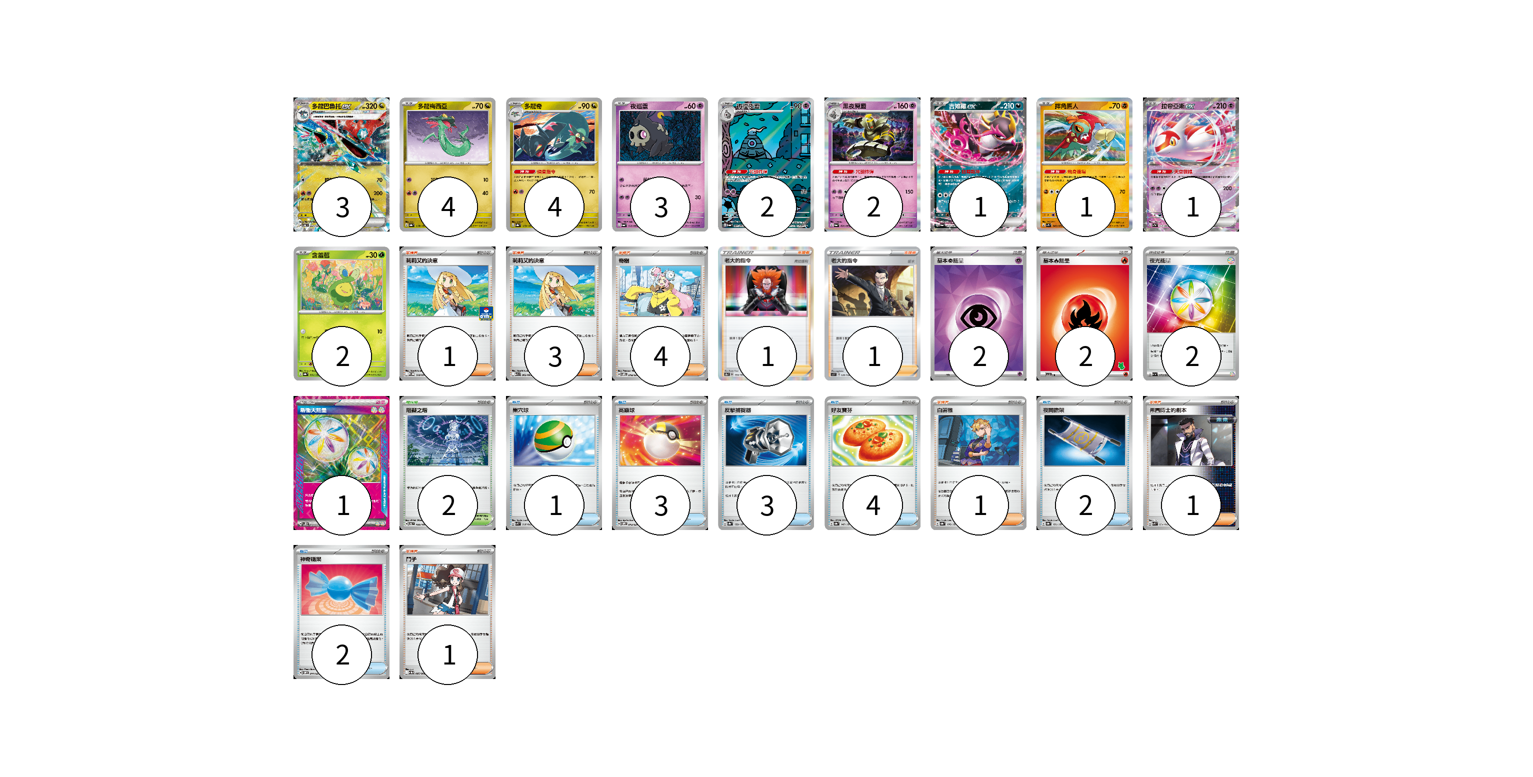 牌組構築方案 以此牌組為基礎新構築牌組 顯示卡面 顯示列表 寶可夢卡(23) 3 4 4 3 2 2 1 1 1 2 物品卡(15) 1 3 3 4 2 2 支援者卡(13) 1 3 4 1 1 1 1 1 競技場卡(2) 2 能量卡(7) 2 2 2 1 寶可夢卡(23) 卡牌名稱 張數 卡牌名稱 張數 多龍巴魯托ex SV6 081/101 03 多龍梅西亞 SV8a 118/187 04 多龍奇 SV8a 119/187 04 夜巡靈 SV6a 018/064 03 彷徨夜靈 SV6a 069/064 02 黑夜魔靈 SV6a 020/064 02 吉雉雞ex SV6a 038/064 01 摔角鷹人 SV1S 045/078 01 拉帝亞斯ex SV7a 019/064 01 含羞苞 SV8a 001/187 02 物品卡(15) 卡牌名稱 張數 卡牌名稱 張數 巢穴球 SVK 016/042 01 高級球 SVOM 013/021 03 反擊捕捉器 SV8a 139/187 03 好友寶芬 SV8a 147/187 04 夜間擔架 SV8a 151/187 02 神奇糖果 SVOM 014/021 02 支援者卡(13) 卡牌名稱 張數 卡牌名稱 張數 莉莉艾的決意 M-P 018/M-P 01 莉莉艾的決意 M1L 062/063 03 奇樹 SVOM 018/021 04 老大的指令(弗拉達利) S8b 158/184 01 老大的指令(坂木) SJ 026/028 01 白蕾雅 SV8a 176/187 01 弗圖博士的劇本 SVK 034/042 01 鬥子 SV11W 085/086 01 競技場卡(2) 卡牌名稱 張數 卡牌名稱 張數 阻礙之塔 SV6 100/101 02 能量卡(7) 卡牌名稱 張數 卡牌名稱 張數 基本【超】能量 SVOD PSY 02 基本【火】能量 SVI FIR 02 夜光能量 SV1a 073/073 02 新衝天能量 SV5K 071/071 01 以此牌組為基礎新構築牌組 牌組編碼 PeCOMw-ByelzD-kCOaSP copy 列印牌組單 牌組編碼已複製 分享至SNS
