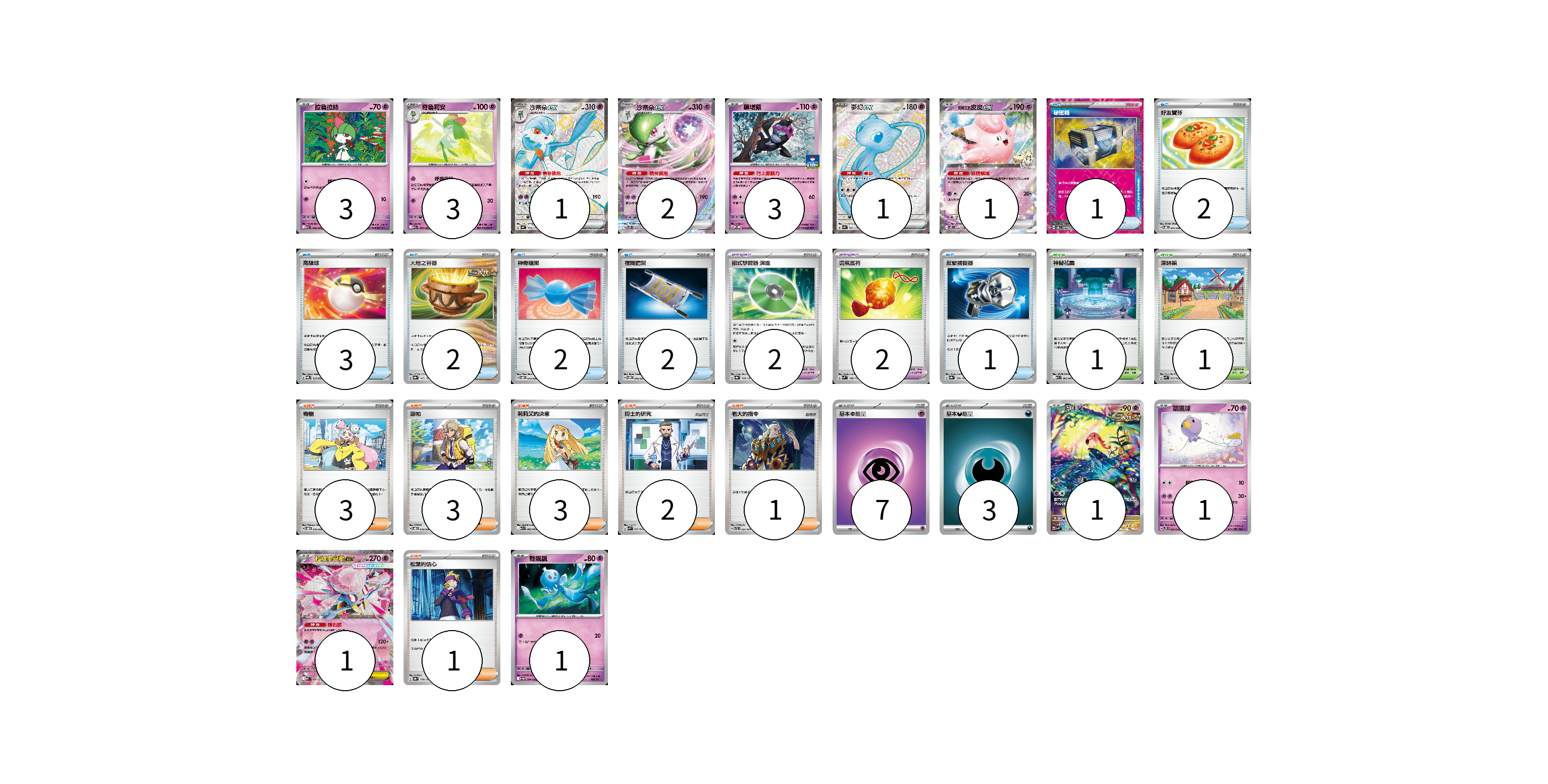 牌組構築方案 以此牌組為基礎新構築牌組 顯示卡面 顯示列表 寶可夢卡(18) 3 3 1 2 3 1 1 1 1 1 1 寶可夢道具(4) 2 2 物品卡(13) 1 2 3 2 2 2 1 支援者卡(13) 3 3 3 2 1 1 競技場卡(2) 1 1 能量卡(10) 7 3 寶可夢卡(18) 卡牌名稱 張數 卡牌名稱 張數 拉魯拉絲 M1S 040/063 03 奇魯莉安 M1S 041/063 03 沙奈朵ex SV4a 328/190 01 沙奈朵ex SVTS 004/022 02 願增猿 M-P 014/M-P 03 夢幻ex SV4a 327/190 01 莉莉艾的皮皮ex SV9 033/100 01 吼叫尾 SV4K 071/066 01 飄飄球 SVTS 005/022 01 超級蒂安希ex MBD 006/022 01 輕飄飄 SV11W 041/086 01 寶可夢道具(4) 卡牌名稱 張數 卡牌名稱 張數 招式學習器 演進 SV8a 160/187 02 勇氣護符 SVM 142/175 02 物品卡(13) 卡牌名稱 張數 卡牌名稱 張數 秘密箱 SV6 092/101 01 好友寶芬 SVOD 011/020 02 高級球 SVQL 015/022 03 大地之容器 SV8a 143/187 02 神奇糖果 SVOD 013/020 02 夜間擔架 SVOM 016/021 02 反擊捕捉器 SV8a 139/187 01 支援者卡(13) 卡牌名稱 張數 卡牌名稱 張數 奇樹 SVOD 016/020 03 派帕 SVOD 018/020 03 莉莉艾的決意 M1L 062/063 03 博士的研究 SVK 033/042 02 老大的指令 SVTL 021/021 01 松葉的信心 SV8a 178/187 01 競技場卡(2) 卡牌名稱 張數 卡牌名稱 張數 神秘花園 M1S 063/063 01 深缽鎮 SVK 039/042 01 能量卡(10) 卡牌名稱 張數 卡牌名稱 張數 基本超能量 sv-p PSY 07 基本惡能量 sv-p DAR 03 以此牌組為基礎新構築牌組 牌組編碼 PfPmpb-aAaEZm-Bzymdb copy 列印牌組單 牌組編碼已複製 分享至SNS