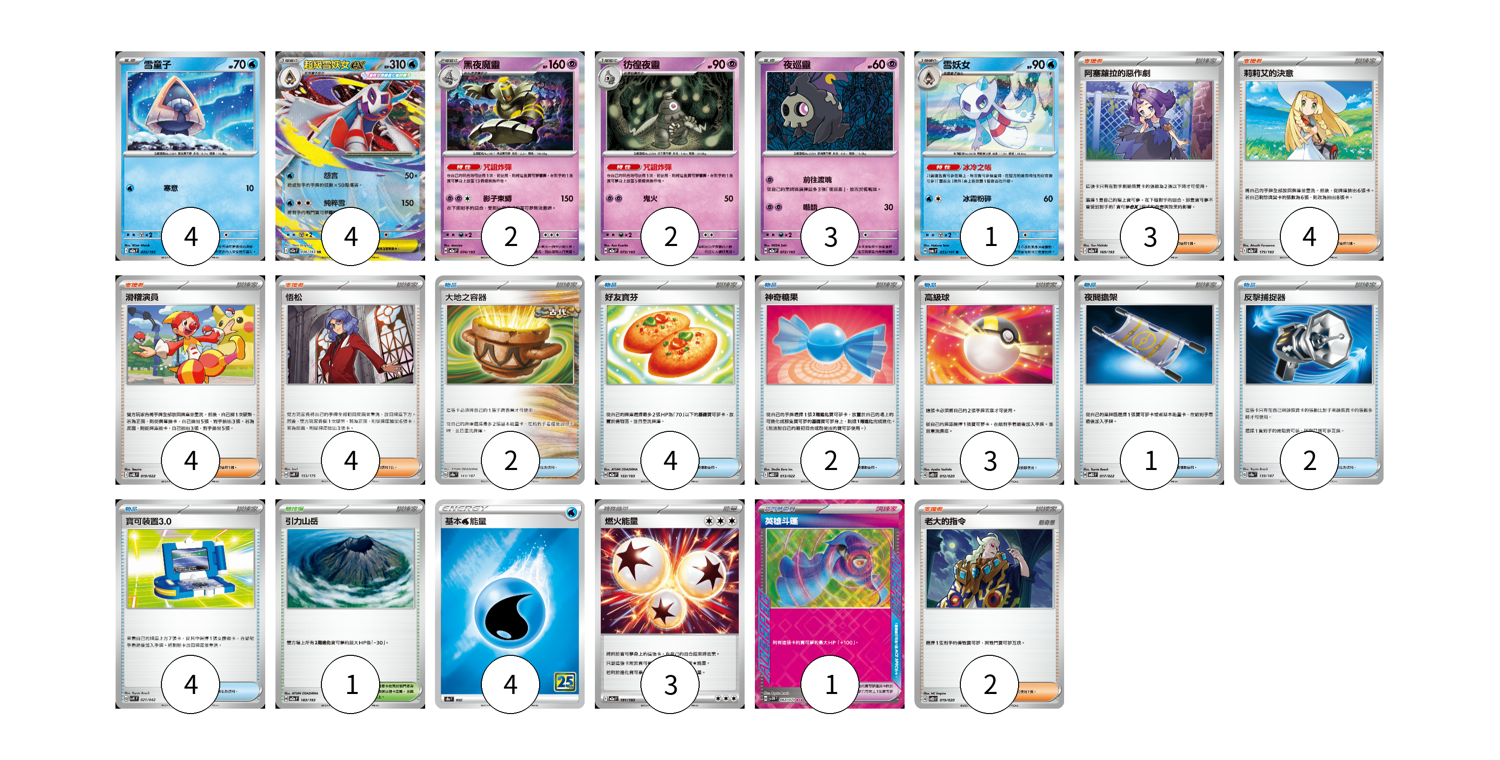 牌組構築方案 以此牌組為基礎新構築牌組 顯示卡面 顯示列表 寶可夢卡(16) 4 4 2 2 3 1 寶可夢道具(1) 1 物品卡(18) 2 4 2 3 1 2 4 支援者卡(17) 3 4 4 4 2 競技場卡(1) 1 能量卡(7) 4 3 寶可夢卡(16) 卡牌名稱 張數 卡牌名稱 張數 雪童子 M2a 035/193 04 超級雪妖女ex M2a 036/193 04 黑夜魔靈 M2a 074/193 02 彷徨夜靈 M2a 073/193 02 夜巡靈 M2a 072/193 03 雪妖女 SV6 033/101 01 寶可夢道具(1) 卡牌名稱 張數 卡牌名稱 張數 英雄斗篷 SV5M 064/071 01 物品卡(18) 卡牌名稱 張數 卡牌名稱 張數 大地之容器 SV8a 143/187 02 好友寶芬 M2a 153/193 04 神奇糖果 MBG 013/022 02 高級球 SVOD 012/020 03 夜間擔架 MBG 017/022 01 反擊捕捉器 SV8a 139/187 02 寶可裝置3.0 SVK 021/042 04 支援者卡(17) 卡牌名稱 張數 卡牌名稱 張數 阿塞蘿拉的惡作劇 M2a 169/193 03 莉莉艾的決意 M2a 175/193 04 滑稽演員 SVQL 019/022 04 悟松 SVM 153/175 04 老大的指令 SVOD 019/020 02 競技場卡(1) 卡牌名稱 張數 卡牌名稱 張數 引力山岳 M2a 183/193 01 能量卡(7) 卡牌名稱 張數 卡牌名稱 張數 基本水能量 S8a WAT 04 燃火能量 M2a 191/193 03 以此牌組為基礎新構築牌組 牌組編碼 PfTTuV-ItTjBt-cYzpZw copy 列印牌組單 牌組編碼已複製 分享至SNS