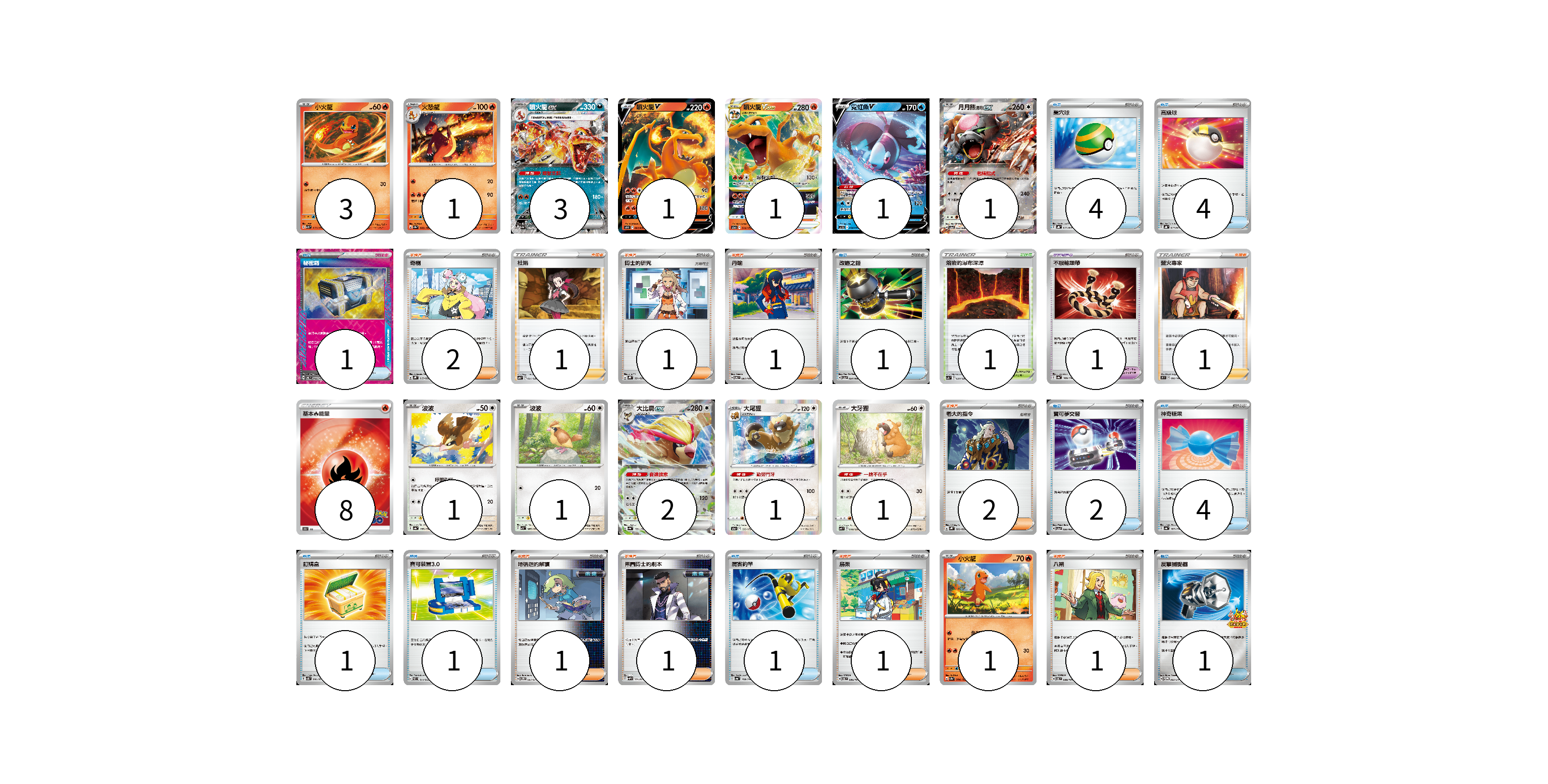 牌組構築方案 以此牌組為基礎新構築牌組 顯示卡面 顯示列表 寶可夢卡(18) 3 1 3 1 1 1 1 1 1 2 1 1 1 寶可夢道具(1) 1 物品卡(20) 4 4 1 1 2 4 1 1 1 1 支援者卡(12) 2 1 1 1 1 2 1 1 1 1 競技場卡(1) 1 能量卡(8) 8 寶可夢卡(18) 卡牌名稱 張數 卡牌名稱 張數 小火龍 SV3 012/108 03 火恐龍 SV2a 005/165 01 噴火龍ex SV4a 115/190 03 噴火龍V SO 001/030 01 噴火龍VSTAR S12a 014/172 01 霓虹魚V SVHK 004/022 01 月月熊 赫月 ex SV5a 052/066 01 波波 SV4a 137/190 01 波波 SV3 087/108 01 大比鳥ex SV4a 139/190 02 大尾狸 S12a 122/172 01 大牙狸 SVF 008/038 01 小火龍 SV2a 004/165 01 寶可夢道具(1) 卡牌名稱 張數 卡牌名稱 張數 不服輸頭帶 SV4a 168/190 01 物品卡(20) 卡牌名稱 張數 卡牌名稱 張數 巢穴球 SVHK 012/022 04 高級球 SVHK 013/022 04 秘密箱 SV6 092/101 01 改造之錘 SV5a 054/066 01 寶可夢交替 SV5a 056/066 02 神奇糖果 SV4a 163/190 04 訂購盒 SV5K 061/071 01 寶可裝置3.0 SVEL 014/020 01 厲害釣竿 SV4a 158/190 01 反擊捕捉器 SV-P 083/SV-P 01 支援者卡(12) 卡牌名稱 張數 卡牌名稱 張數 奇樹 SVHK 019/022 02 杜娟 SVB 021/028 01 博士的研究 SVHK 021/022 01 丹瑜 SV6 097/101 01 營火專家 S9 092/100 01 老大的指令 SVHK 022/022 02 暗碼迷的解讀 SV5M 067/071 01 弗圖博士的劇本 SVHM 021/022 01 烏栗 SV6 096/101 01 八朔 SV6 098/101 01 競技場卡(1) 卡牌名稱 張數 卡牌名稱 張數 熔岩的瀑布深潭 SVEL 020/020 01 能量卡(8) 卡牌名稱 張數 卡牌名稱 張數 基本火能量 S10b FIR 08 以此牌組為基礎新構築牌組 牌組編碼 PgjyMt-bwEztL-JbgkjE copy 列印牌組單 牌組編碼已複製 分享至SNS