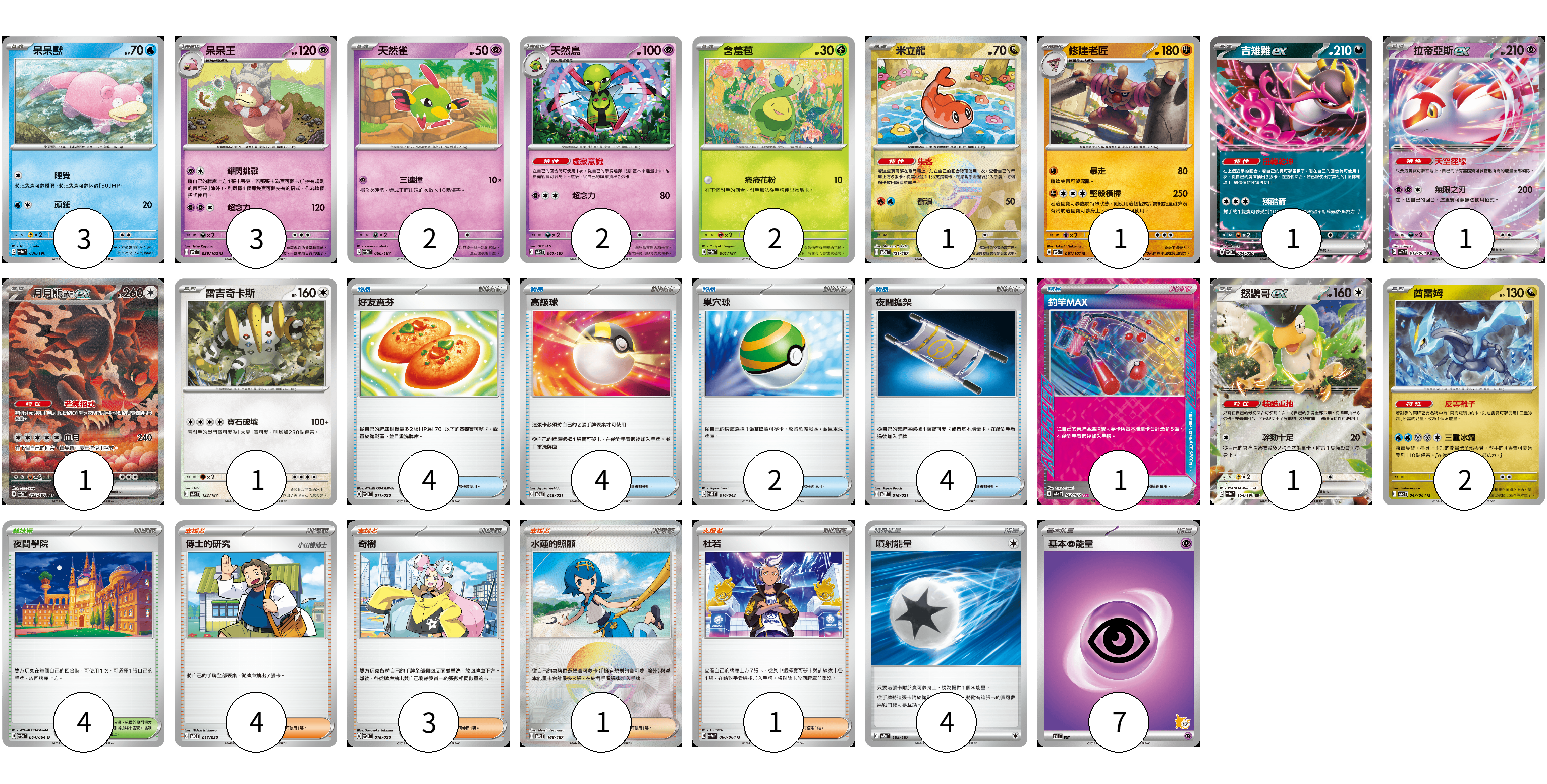 牌組構築方案 以此牌組為基礎新構築牌組 顯示卡面 顯示列表 寶可夢卡(21) 3 3 2 2 2 1 1 1 1 1 1 1 2 物品卡(15) 4 4 2 4 1 支援者卡(9) 4 3 1 1 競技場卡(4) 4 能量卡(11) 4 7 寶可夢卡(21) 卡牌名稱 張數 卡牌名稱 張數 呆呆獸 SV4a 036/190 03 呆呆王 SV7 039/102 03 天然雀 SV8a 060/187 02 天然鳥 SV8a 061/187 02 含羞苞 SV8a 001/187 02 米立龍 SV8a 121/187 01 修建老匠 SV6 061/101 01 吉雉雞ex SVOD 004/020 01 拉帝亞斯ex SV7a 019/064 01 月月熊 赫月ex SV8a 225/187 01 雷吉奇卡斯 SV8a 132/187 01 怒鸚哥ex SV4a 154/190 01 酋雷姆 SV6a 047/064 02 物品卡(15) 卡牌名稱 張數 卡牌名稱 張數 好友寶芬 SVOD 011/020 04 高級球 SVOM 013/021 04 巢穴球 SVK 016/042 02 夜間擔架 SVOM 016/021 04 釣竿MAX SV8a 142/187 01 支援者卡(9) 卡牌名稱 張數 卡牌名稱 張數 博士的研究 SVOD 017/020 04 奇樹 SVOD 016/020 03 水蓮的照顧 SV8a 168/187 01 杜若 SV7a 060/064 01 競技場卡(4) 卡牌名稱 張數 卡牌名稱 張數 夜間學院 SV6a 064/064 04 能量卡(11) 卡牌名稱 張數 卡牌名稱 張數 噴射能量 SV8a 185/187 04 基本【超】能量 SVI PSY 07 以此牌組為基礎新構築牌組 牌組編碼 PgzTEg-pFqnTL-QwFsyA copy 列印牌組單 牌組編碼已複製 分享至SNS