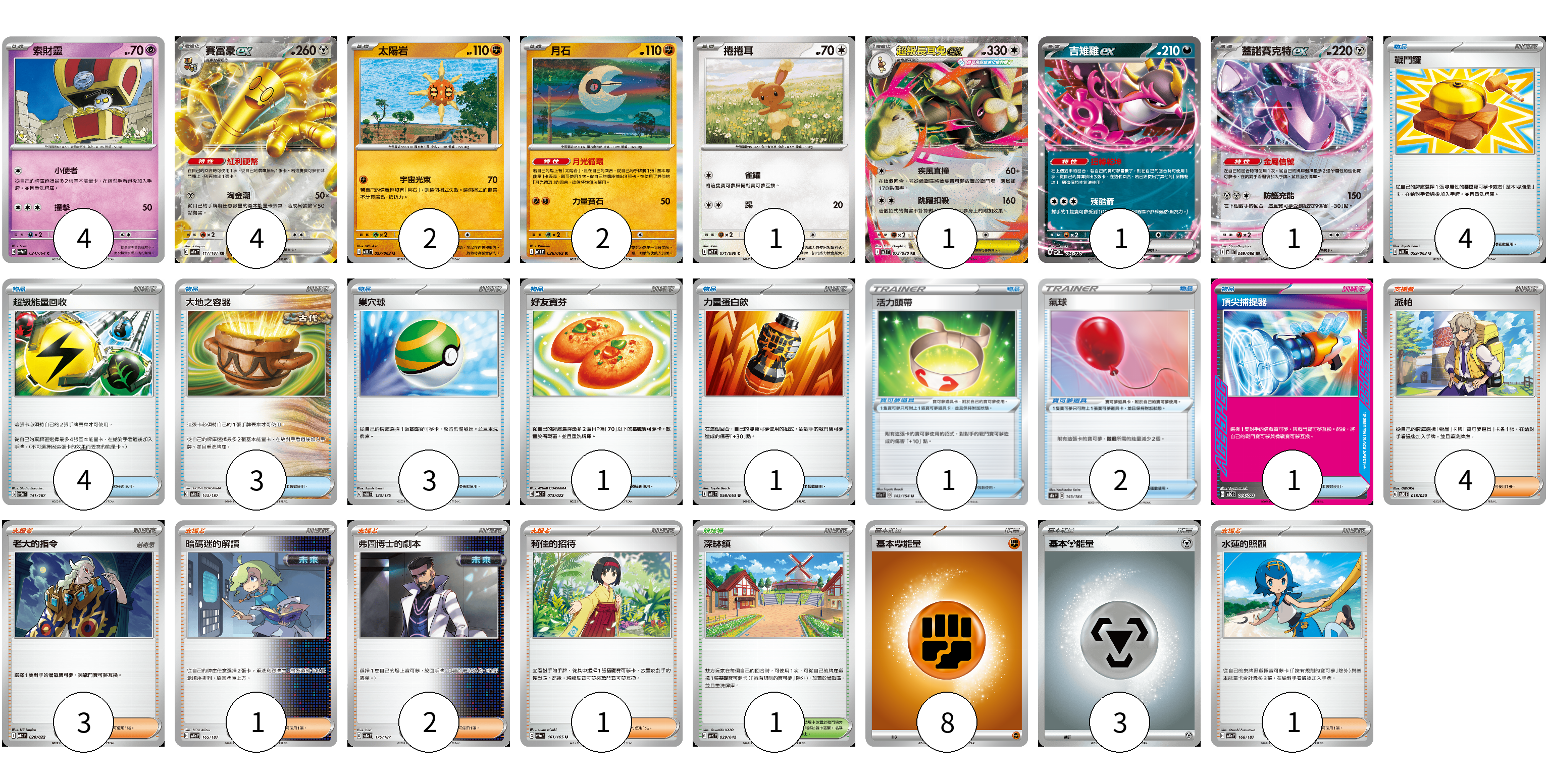 牌組構築方案 以此牌組為基礎新構築牌組 顯示卡面 顯示列表 寶可夢卡(16) 4 4 2 2 1 1 1 1 寶可夢道具(3) 1 2 物品卡(17) 4 4 3 3 1 1 1 支援者卡(12) 4 3 1 2 1 1 競技場卡(1) 1 能量卡(11) 8 3 寶可夢卡(16) 卡牌名稱 張數 卡牌名稱 張數 索財靈 SV7a 024/064 04 賽富豪ex SV8a 117/187 04 太陽岩 M1L 027/063 02 月石 M1L 026/063 02 捲捲耳 M2 071/080 01 超級長耳兔ex M2 072/080 01 吉雉雞ex SVOD 004/020 01 蓋諾賽克特ex SV11B 069/086 01 寶可夢道具(3) 卡牌名稱 張數 卡牌名稱 張數 活力頭帶 SC1a 143/154 01 氣球 S8b 145/184 02 物品卡(17) 卡牌名稱 張數 卡牌名稱 張數 戰鬥鑼 M1L 059/063 04 超級能量回收 SV8a 141/187 04 大地之容器 SV8a 143/187 03 巢穴球 SVM 133/175 03 好友寶芬 MBD 013/022 01 力量蛋白飲 M1L 058/063 01 頂尖捕捉器 MBG 014/022 01 支援者卡(12) 卡牌名稱 張數 卡牌名稱 張數 派帕 SVOD 018/020 04 老大的指令 MBD 020/022 03 暗碼迷的解讀 SV8a 165/187 01 弗圖博士的劇本 SV8a 175/187 02 莉佳的招待 SV2a 161/165 01 水蓮的照顧 SV8a 168/187 01 競技場卡(1) 卡牌名稱 張數 卡牌名稱 張數 深缽鎮 SVK 039/042 01 能量卡(11) 卡牌名稱 張數 卡牌名稱 張數 基本【鬥】能量 M-P FIG 08 基本【鋼】能量 M-P MET 03 以此牌組為基礎新構築牌組 牌組編碼 PiiCTR-ritRGr-WXgOWb copy 列印牌組單 牌組編碼已複製 分享至SNS