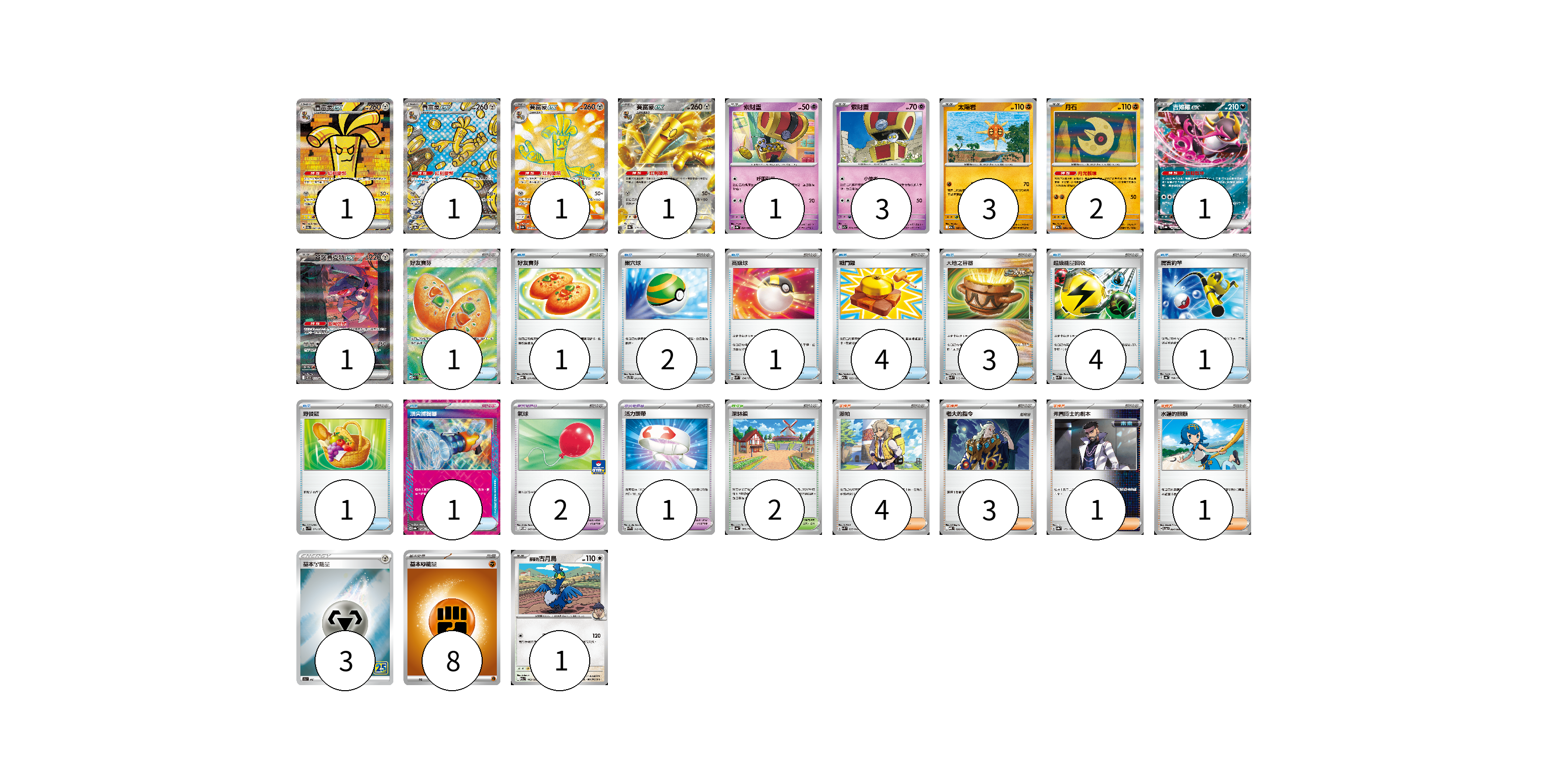 牌組構築方案 以此牌組為基礎新構築牌組 顯示卡面 顯示列表 寶可夢卡(16) 1 1 1 1 1 3 3 2 1 1 1 寶可夢道具(3) 2 1 物品卡(19) 1 1 2 1 4 3 4 1 1 1 支援者卡(9) 4 3 1 1 競技場卡(2) 2 能量卡(11) 3 8 寶可夢卡(16) 卡牌名稱 張數 卡牌名稱 張數 賽富豪ex SV3a 087/062 01 賽富豪ex SV8a 220/187 01 賽富豪ex SV3a 079/062 01 賽富豪ex SV8a 117/187 01 索財靈 SV3a 020/062 01 索財靈 SV7a 024/064 03 太陽岩 M2a 087/193 03 月石 M2a 086/193 02 吉雉雞ex SV8a 104/187 01 蓋諾賽克特ex SV11B 172/086 01 赫普的古月鳥 M2a 143/193 01 寶可夢道具(3) 卡牌名稱 張數 卡牌名稱 張數 氣球 M-P 047/M-P 02 活力頭帶 SVAW 019/023 01 物品卡(19) 卡牌名稱 張數 卡牌名稱 張數 好友寶芬 M1S 081/063 01 好友寶芬 MBG 011/022 01 巢穴球 SVTS 013/022 02 高級球 SVM 134/175 01 戰鬥鑼 M2a 155/193 04 大地之容器 SVK 012/042 03 超級能量回收 SVK 010/042 04 厲害釣竿 SV4a 158/190 01 野餐籃 SV1V 071/078 01 頂尖捕捉器 SV8a 148/187 01 支援者卡(9) 卡牌名稱 張數 卡牌名稱 張數 派帕 SVK 035/042 04 老大的指令 MBD 020/022 03 弗圖博士的劇本 SV8a 175/187 01 水蓮的照顧 SV5a 064/066 01 競技場卡(2) 卡牌名稱 張數 卡牌名稱 張數 深缽鎮 SV4a 185/190 02 能量卡(11) 卡牌名稱 張數 卡牌名稱 張數 基本鋼能量 S8a MET 03 基本【鬥】能量 M-P FIG 08 以此牌組為基礎新構築牌組 牌組編碼 Plwxmx-HbThwf-kWxNZg copy 列印牌組單 牌組編碼已複製 分享至SNS