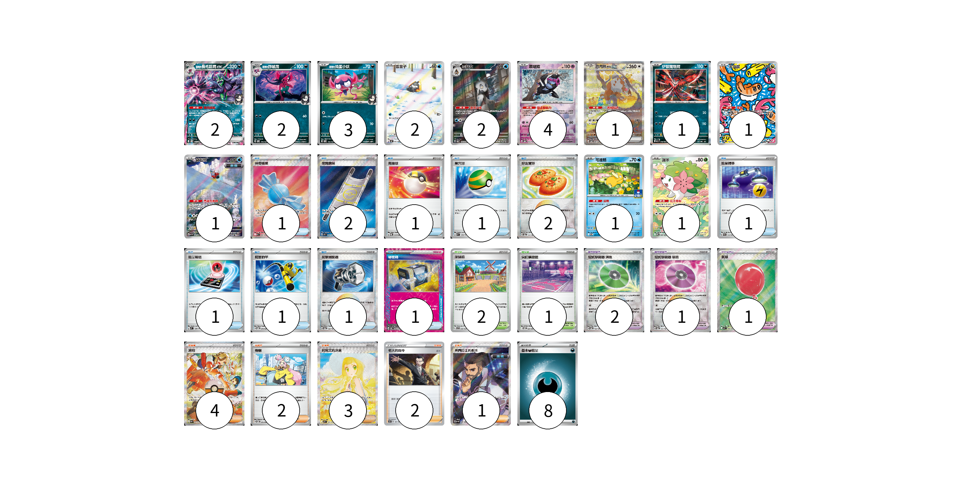 牌組構築方案 以此牌組為基礎新構築牌組 顯示卡面 顯示列表 寶可夢卡(21) 2 2 3 2 2 4 1 1 1 1 1 1 寶可夢道具(4) 2 1 1 物品卡(12) 1 2 1 1 2 1 1 1 1 1 支援者卡(12) 4 2 3 2 1 競技場卡(3) 2 1 能量卡(8) 8 寶可夢卡(21) 卡牌名稱 張數 卡牌名稱 張數 <瑪俐的>長毛巨魔ex SVOM 007/021 02 <瑪俐的>詐唬魔 SVOM 006/021 02 <瑪俐的>搗蛋小妖 SVOM 005/021 03 雪童子 SV3a 063/062 02 雪妖女 SV6 104/101 02 願增猿 SV8a 075/187 04 月月熊 赫月 ex SV5a 091/066 01 伊裴爾塔爾 M1L 040/063 01 米立龍 SV6 112/101 01 鐵包袱 SV4M 071/066 01 可達鴨 SV-P 220/SV-P 01 謝米 SV9a 066/063 01 寶可夢道具(4) 卡牌名稱 張數 卡牌名稱 張數 招式學習器 演進 SV8a 160/187 02 招式學習器 衰退 SV8a 161/187 01 氣球 M1L 084/063 01 物品卡(12) 卡牌名稱 張數 卡牌名稱 張數 神奇糖果 M1S 082/063 01 夜間擔架 M1L 083/063 02 高級球 SVQL 015/022 01 巢穴球 SVM 133/175 01 好友寶芬 SV8a 147/187 02 能量轉移 SVAM 012/023 01 能量輸送 SVM 128/175 01 厲害釣竿 SVOD 010/020 01 反擊捕捉器 SV8a 139/187 01 秘密箱 SV6 092/101 01 支援者卡(12) 卡牌名稱 張數 卡牌名稱 張數 派帕 SV4a 353/190 04 奇樹 SVOD 016/020 02 莉莉艾的決意 M1L 091/063 03 老大的指令(坂木) SC1D 161/164 02 弗圖博士的劇本 SV4M 086/066 01 競技場卡(3) 卡牌名稱 張數 卡牌名稱 張數 深缽鎮 SVF 036/038 02 尖釘鎮道館 SVOM 021/021 01 能量卡(8) 卡牌名稱 張數 卡牌名稱 張數 基本【惡】能量 MBG DAR 08 以此牌組為基礎新構築牌組 牌組編碼 PmaufS-bfmaTv-JNAsQt copy 列印牌組單 牌組編碼已複製 分享至SNS