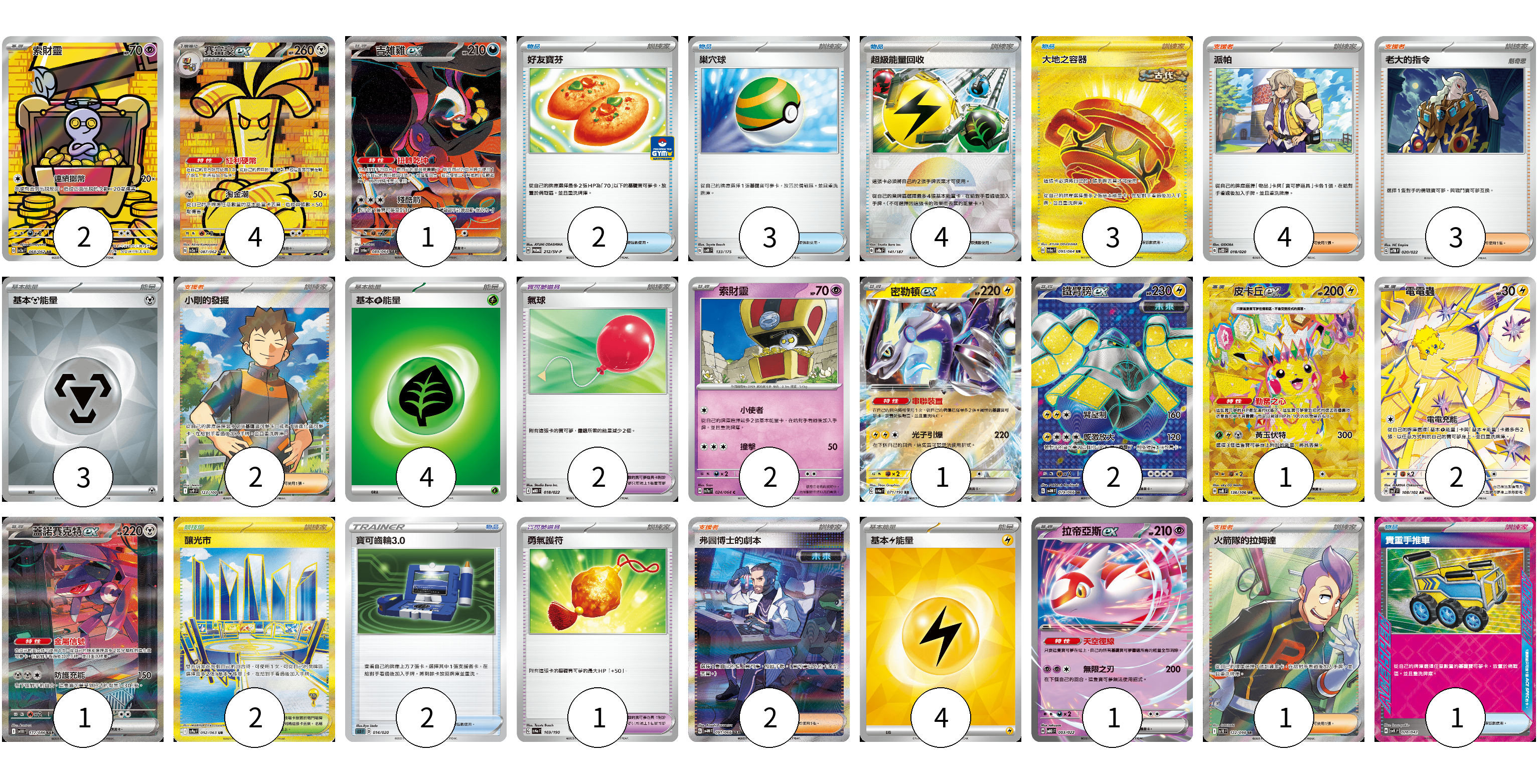 牌組構築方案 以此牌組為基礎新構築牌組 顯示卡面 顯示列表 寶可夢卡(17) 2 4 1 2 1 2 1 2 1 1 寶可夢道具(3) 2 1 物品卡(15) 2 3 4 3 2 1 支援者卡(12) 4 3 2 2 1 競技場卡(2) 2 能量卡(11) 3 4 4 寶可夢卡(17) 卡牌名稱 張數 卡牌名稱 張數 索財靈 SV3a 068/062 02 賽富豪ex SV3a 087/062 04 吉雉雞ex SV6a 089/064 01 索財靈 SV7a 024/064 02 密勒頓ex SV4a 071/190 01 鐵臂膀ex SV4M 079/066 02 皮卡丘ex SV8 136/106 01 電電蟲 SV7 108/102 02 蓋諾賽克特ex SV11B 172/086 01 拉帝亞斯ex MBD 003/022 01 寶可夢道具(3) 卡牌名稱 張數 卡牌名稱 張數 氣球 MBD 018/022 02 勇氣護符 SV4a 169/190 01 物品卡(15) 卡牌名稱 張數 卡牌名稱 張數 好友寶芬 SV-P 212/SV-P 02 巢穴球 SVM 133/175 03 超級能量回收 SV8a 141/187 04 大地之容器 SV6a 093/064 03 寶可齒輪3.0 SLD 014/020 02 貴重手推車 SVK 020/042 01 支援者卡(12) 卡牌名稱 張數 卡牌名稱 張數 派帕 SVOD 018/020 04 老大的指令 SVTM 020/022 03 小剛的發掘 SV9 123/100 02 弗圖博士的劇本 SV4M 091/066 02 火箭隊的拉姆達 SV10 122/098 01 競技場卡(2) 卡牌名稱 張數 卡牌名稱 張數 釀光市 SV9a 092/063 02 能量卡(11) 卡牌名稱 張數 卡牌名稱 張數 基本【鋼】能量 SVOD MET 03 基本【草】能量 SVTM GRA 04 基本【雷】能量 SVQP LIG 04 以此牌組為基礎新構築牌組 牌組編碼 PmgZOG-PHxPNM-BHvhFh copy 列印牌組單 牌組編碼已複製 分享至SNS