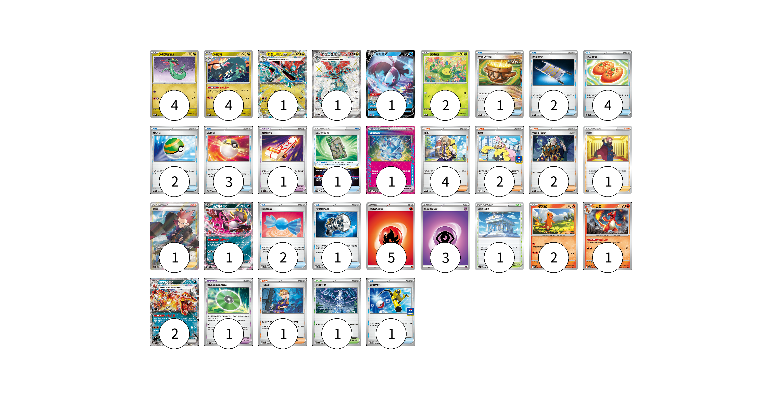 牌組構築方案 以此牌組為基礎新構築牌組 顯示卡面 顯示列表 寶可夢卡(19) 4 4 1 1 1 2 1 2 1 2 寶可夢道具(3) 1 1 1 物品卡(17) 1 2 4 2 3 1 2 1 1 支援者卡(11) 4 2 2 1 1 1 競技場卡(2) 1 1 能量卡(8) 5 3 寶可夢卡(19) 卡牌名稱 張數 卡牌名稱 張數 多龍梅西亞 SV8a 118/187 04 多龍奇 SV8a 119/187 04 多龍巴魯托ex SV8a 120/187 01 多龍巴魯托ex SV6 120/101 01 霓虹魚V SPD 002/020 01 含羞苞 SV8a 001/187 02 吉雉雞ex SV6a 038/064 01 小火龍 SVTL 001/021 02 火恐龍 SVTL 002/021 01 噴火龍ex SV4a 115/190 02 寶可夢道具(3) 卡牌名稱 張數 卡牌名稱 張數 緊急滑板 SVK 023/042 01 璀璨結晶 SV7 094/102 01 招式學習器 演進 SVK 025/042 01 物品卡(17) 卡牌名稱 張數 卡牌名稱 張數 大地之容器 SV8a 143/187 01 夜間擔架 SV6a 056/064 02 好友寶芬 SV5K 063/071 04 巢穴球 SVM 133/175 02 高級球 SVTG 013/019 03 森林封印石 SVF 024/038 01 神奇糖果 SVTG 014/019 02 反擊捕捉器 SVTS 009/022 01 厲害釣竿 SV-P 112/SV-P 01 支援者卡(11) 卡牌名稱 張數 卡牌名稱 張數 派帕 SVK 035/042 04 奇樹 SV-P 106/SV-P 02 老大的指令 SVM 172/175 02 阿渡 S12 096/098 01 阿渡 S12 114/098 01 白蕾雅 SV7 100/102 01 競技場卡(2) 卡牌名稱 張數 卡牌名稱 張數 神奧神殿 S12a 169/172 01 阻礙之塔 SV6 100/101 01 能量卡(8) 卡牌名稱 張數 卡牌名稱 張數 基本【火】能量 SVB FIR 05 基本【超】能量 SVB PSY 03 以此牌組為基礎新構築牌組 牌組編碼 PqluLz-DJZupQ-jNzQjb copy 列印牌組單 牌組編碼已複製 分享至SNS