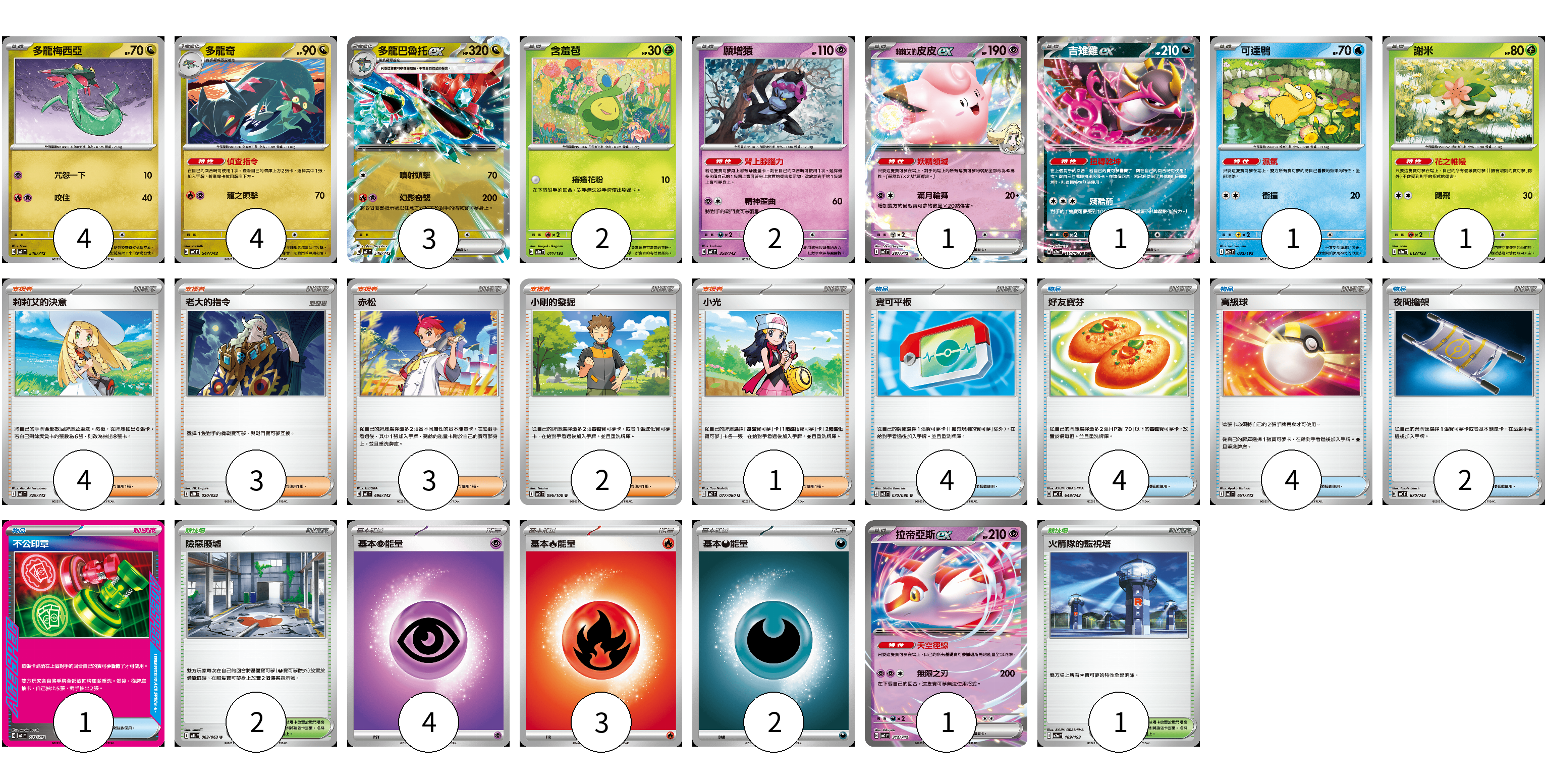 牌組構築方案 以此牌組為基礎新構築牌組 顯示卡面 顯示列表 寶可夢卡(20) 4 4 3 2 2 1 1 1 1 1 物品卡(15) 4 4 4 2 1 支援者卡(13) 4 3 3 2 1 競技場卡(3) 2 1 能量卡(9) 4 3 2 寶可夢卡(20) 卡牌名稱 張數 卡牌名稱 張數 多龍梅西亞 MC 546/742 04 多龍奇 MC 547/742 04 多龍巴魯托ex MC 548/742 03 含羞苞 M2a 011/193 02 願增猿 MC 358/742 02 <莉莉艾的>皮皮ex MC 287/742 01 吉雉雞ex M2a 114/193 01 可達鴨 M2a 032/193 01 謝米 M2a 012/193 01 拉帝亞斯ex MC 312/742 01 物品卡(15) 卡牌名稱 張數 卡牌名稱 張數 寶可平板 M3 070/080 04 好友寶芬 MC 648/742 04 高級球 MC 651/742 04 夜間擔架 MC 670/742 02 不公印章 MC 633/742 01 支援者卡(13) 卡牌名稱 張數 卡牌名稱 張數 莉莉艾的決意 MC 729/742 04 老大的指令 MBD 020/022 03 赤松 MC 696/742 03 小剛的發掘 SV9 096/100 02 小光 M2 077/080 01 競技場卡(3) 卡牌名稱 張數 卡牌名稱 張數 險惡廢墟 M1L 063/063 02 火箭隊的監視塔 M2a 189/193 01 能量卡(9) 卡牌名稱 張數 卡牌名稱 張數 基本【超】能量 MC PSY 04 基本【火】能量 MC FIR 03 基本【惡】能量 MC DAR 02 以此牌組為基礎新構築牌組 牌組編碼 PrtYWY-EKEBNa-kymnvq copy 列印牌組單 牌組編碼已複製 分享至SNS