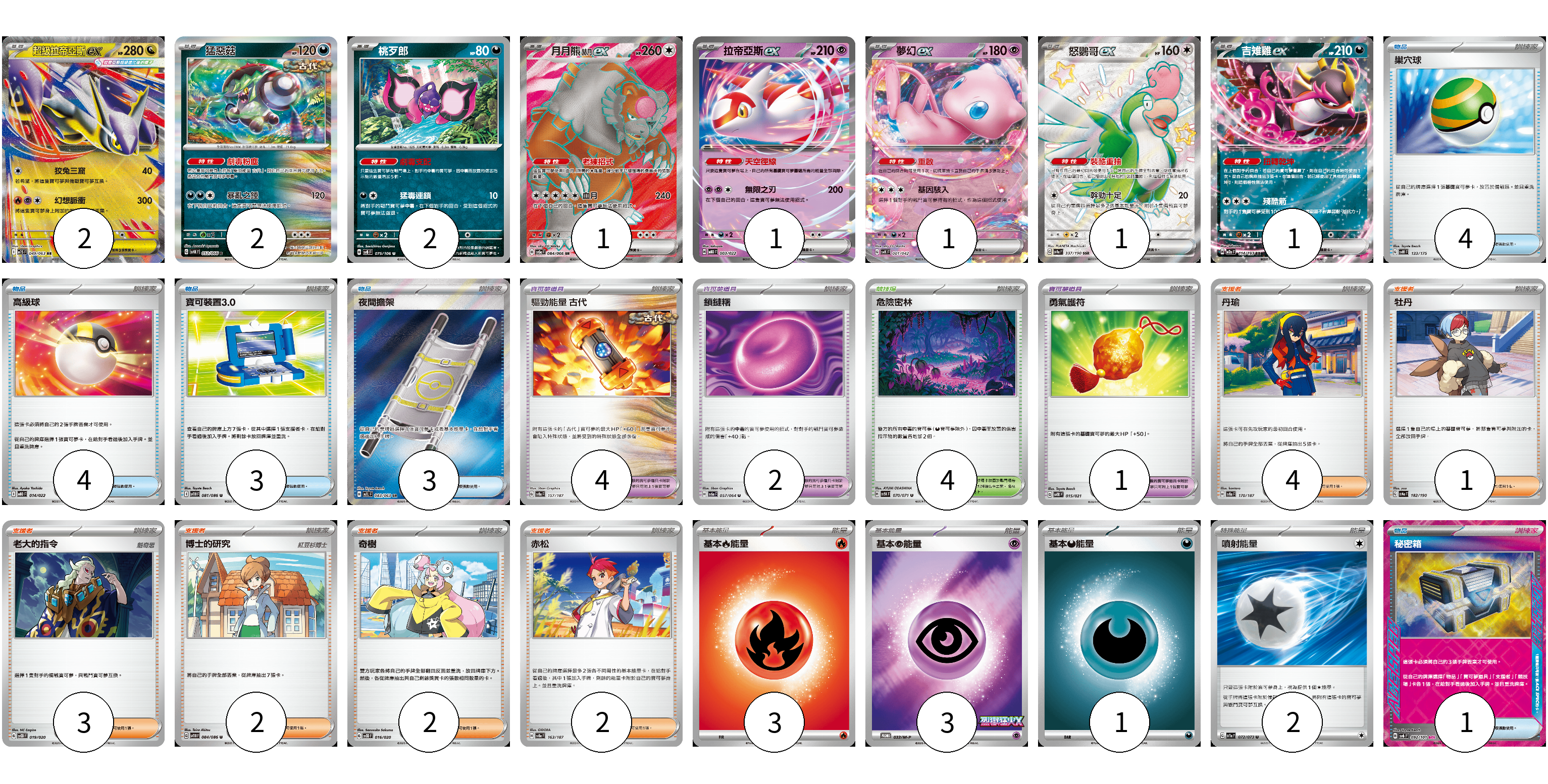牌組構築方案 以此牌組為基礎新構築牌組 顯示卡面 顯示列表 寶可夢卡(11) 2 2 2 1 1 1 1 1 寶可夢道具(7) 4 2 1 物品卡(15) 4 4 3 3 1 支援者卡(14) 4 1 3 2 2 2 競技場卡(4) 4 能量卡(9) 3 3 1 2 寶可夢卡(11) 卡牌名稱 張數 卡牌名稱 張數 超級拉帝亞斯ex M1S 049/063 02 猛惡菇 SV4K 053/066 02 桃歹郎 SV8 075/106 02 月月熊 赫月 ex SV5a 084/066 01 拉帝亞斯ex MBD 003/022 01 夢幻ex SVK 001/042 01 怒鸚哥ex SV4a 337/190 01 吉雉雞ex M2a 114/193 01 寶可夢道具(7) 卡牌名稱 張數 卡牌名稱 張數 驅勁能量 古代 SV8a 157/187 04 鎖鏈糬 SV6a 057/064 02 勇氣護符 SVTR 015/021 01 物品卡(15) 卡牌名稱 張數 卡牌名稱 張數 巢穴球 SVM 133/175 04 高級球 MBD 014/022 04 寶可裝置3.0 SV11B 081/086 03 夜間擔架 M1L 083/063 03 秘密箱 SV6 092/101 01 支援者卡(14) 卡牌名稱 張數 卡牌名稱 張數 丹瑜 SV8a 170/187 04 牡丹 SV4a 182/190 01 老大的指令 SVOD 019/020 03 博士的研究 SV11B 084/086 02 奇樹 SVOD 016/020 02 赤松 SV8a 163/187 02 競技場卡(4) 卡牌名稱 張數 卡牌名稱 張數 危險密林 SV5K 070/071 04 能量卡(9) 卡牌名稱 張數 卡牌名稱 張數 基本【火】能量 M-P FIR 03 基本【超】能量 M-P 033/M-P 03 基本【惡】能量 M-P DAR 01 噴射能量 SV1a 072/073 02 以此牌組為基礎新構築牌組 牌組編碼 PsPLKs-MkKbNw-gYoRGY copy 列印牌組單 牌組編碼已複製 分享至SNS