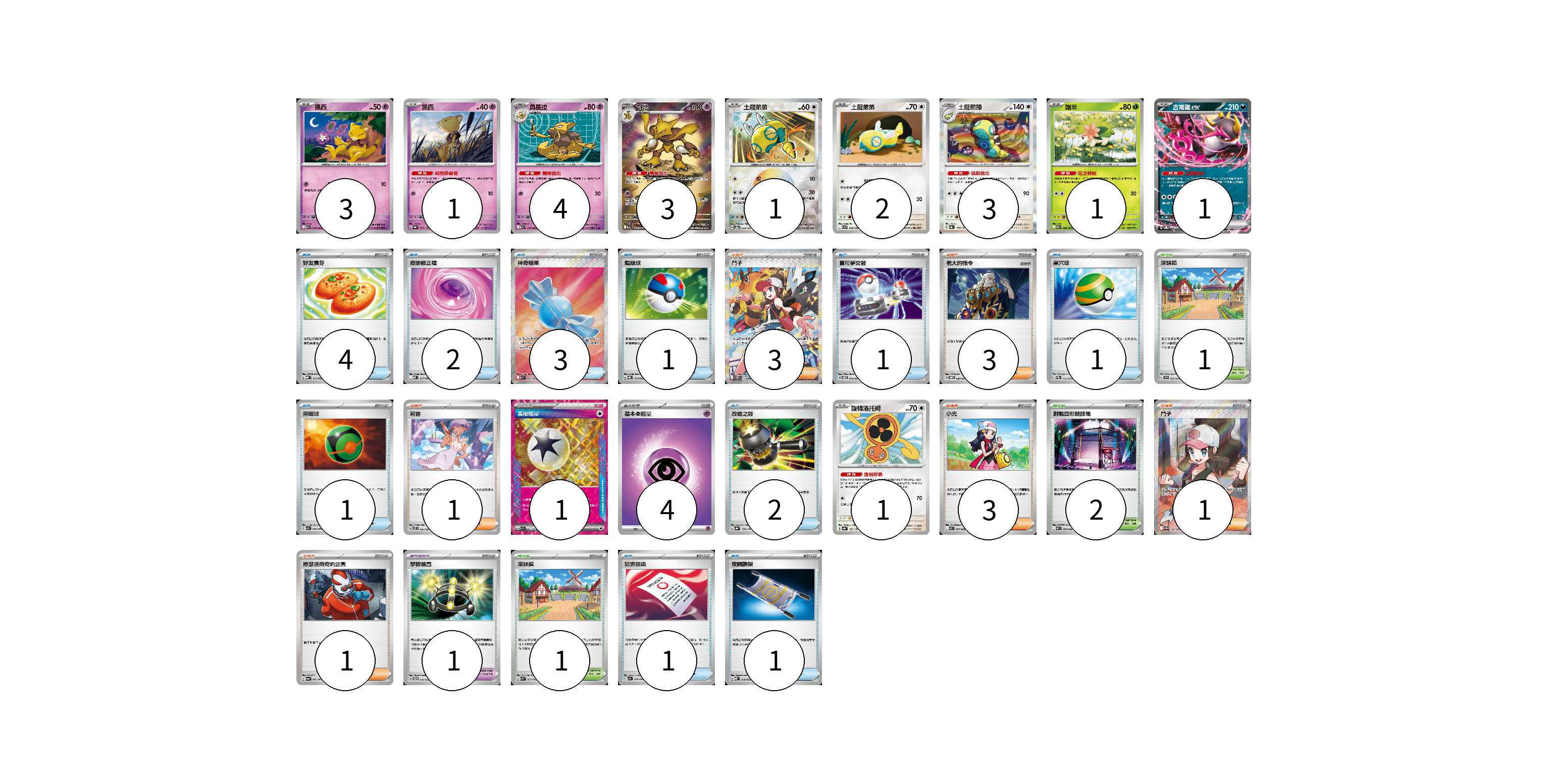 牌組構築方案 以此牌組為基礎新構築牌組 顯示卡面 顯示列表 寶可夢卡(20) 3 1 4 3 1 2 3 1 1 1 寶可夢道具(1) 1 物品卡(17) 4 2 3 1 1 1 1 2 1 1 支援者卡(12) 3 3 1 3 1 1 競技場卡(4) 1 2 1 能量卡(5) 1 4 寶可夢卡(20) 卡牌名稱 張數 卡牌名稱 張數 凱西 M1S 036/063 03 凱西 SV8a 057/187 01 勇基拉 M1S 037/063 04 胡地 M1S 071/063 03 土龍弟弟 SV8a 129/187 01 土龍弟弟 SV9 078/100 02 土龍節節 SV8a 130/187 03 謝米 SV9a 006/063 01 吉雉雞ex SVOD 004/020 01 旋轉洛托姆 SV8a 131/187 01 寶可夢道具(1) 卡牌名稱 張數 卡牌名稱 張數 學習裝置 SVTM 016/022 01 物品卡(17) 卡牌名稱 張數 卡牌名稱 張數 好友寶芬 MBD 013/022 04 奇跡修正檔 MBD 017/022 02 神奇糖果 M1S 082/063 03 超級球 SVQL 014/022 01 寶可夢交替 SVOM 015/021 01 巢穴球 SVEM 012/020 01 黑暗球 SV7a 054/064 01 改造之錘 SV8a 138/187 02 妨害信函 SV7a 055/064 01 夜間擔架 MBD 016/022 01 支援者卡(12) 卡牌名稱 張數 卡牌名稱 張數 鬥子 SV11W 173/086 03 老大的指令 SVOM 020/021 03 莉普 SVTS 021/022 01 小光 M2 077/080 03 鬥子 SV11W 166/086 01 庫瑟洛斯奇的企圖 SV6a 062/064 01 競技場卡(4) 卡牌名稱 張數 卡牌名稱 張數 深缽鎮 SVF 036/038 01 對戰圓形競技場 M2 079/080 02 深缽鎮 SVK 039/042 01 能量卡(5) 卡牌名稱 張數 卡牌名稱 張數 富裕能量 SV7a 064/064 01 基本【超】能量 M-P PSY 04 以此牌組為基礎新構築牌組 牌組編碼 Psnnga-EKzgnv-upsAWL copy 列印牌組單 牌組編碼已複製 分享至SNS