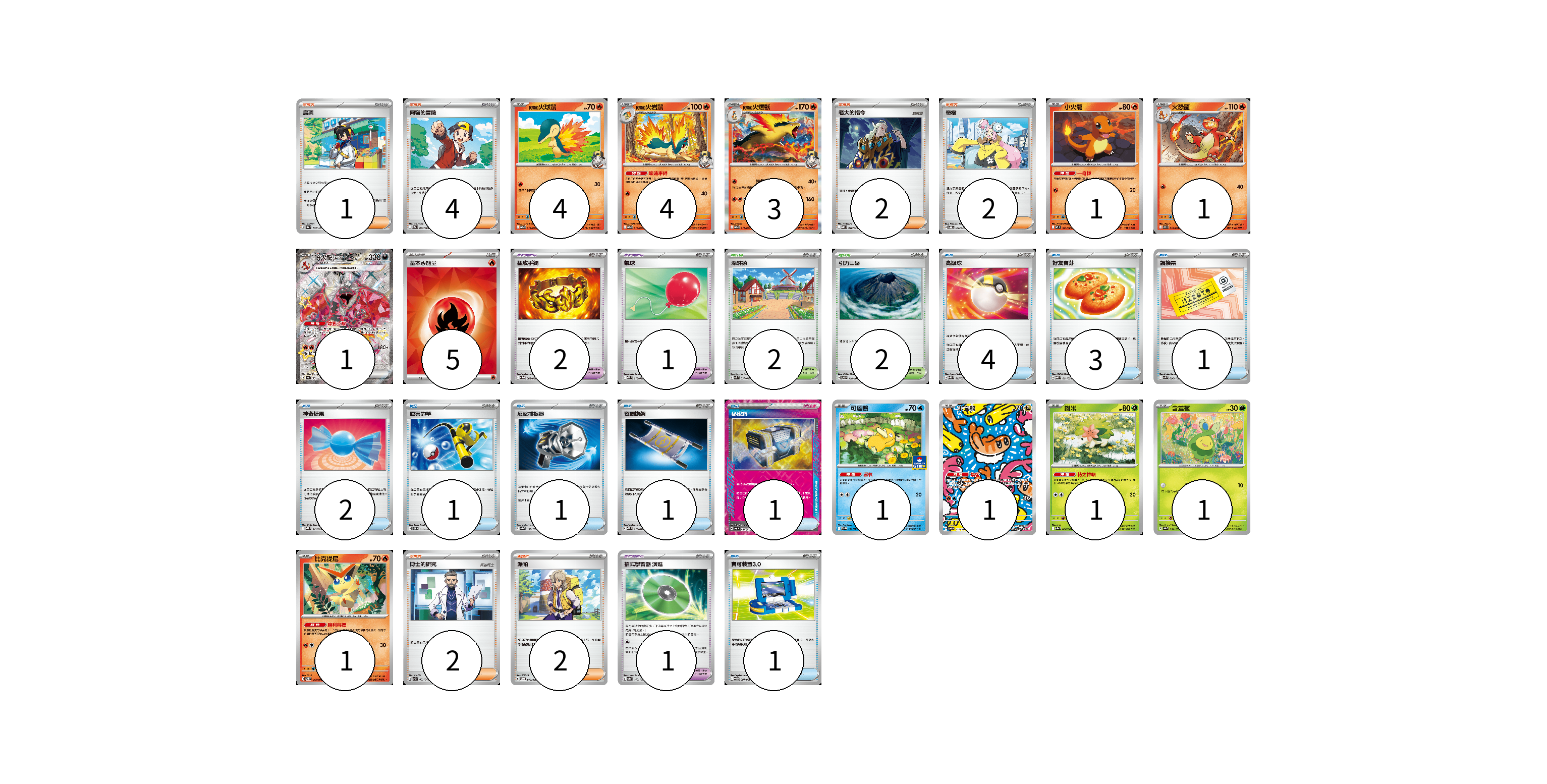 牌組構築方案 以此牌組為基礎新構築牌組 顯示卡面 顯示列表 寶可夢卡(19) 4 4 3 1 1 1 1 1 1 1 1 寶可夢道具(4) 2 1 1 物品卡(15) 4 3 1 2 1 1 1 1 1 支援者卡(13) 1 4 2 2 2 2 競技場卡(4) 2 2 能量卡(5) 5 寶可夢卡(19) 卡牌名稱 張數 卡牌名稱 張數 <阿響的>火球鼠 SV9a 015/063 04 <阿響的>火岩鼠 SV9a 016/063 04 <阿響的>火爆獸 SV9a 017/063 03 小火龍 M2 011/080 01 火恐龍 M2 012/080 01 噴火龍ex SV4a 331/190 01 可達鴨 SV-P 220/SV-P 01 米立龍 SV6 112/101 01 謝米 SV9a 006/063 01 含羞苞 SV8a 001/187 01 比克提尼 SV8 012/106 01 寶可夢道具(4) 卡牌名稱 張數 卡牌名稱 張數 猛攻手鐲 SV11W 082/086 02 氣球 MBD 018/022 01 招式學習器 演進 SV8a 160/187 01 物品卡(15) 卡牌名稱 張數 卡牌名稱 張數 高級球 SVQL 015/022 04 好友寶芬 MBG 011/022 03 調換票 SV9 090/100 01 神奇糖果 MBG 013/022 02 厲害釣竿 SVOM 011/021 01 反擊捕捉器 SV8a 139/187 01 夜間擔架 MBD 016/022 01 秘密箱 SV6 092/101 01 寶可裝置3.0 SV11B 081/086 01 支援者卡(13) 卡牌名稱 張數 卡牌名稱 張數 烏栗 SV8a 169/187 01 阿響的冒險 SV9a 063/063 04 老大的指令 MBD 020/022 02 奇樹 SVOD 016/020 02 博士的研究 SVK 033/042 02 派帕 SVOD 018/020 02 競技場卡(4) 卡牌名稱 張數 卡牌名稱 張數 深缽鎮 SVK 039/042 02 引力山岳 SV8 106/106 02 能量卡(5) 卡牌名稱 張數 卡牌名稱 張數 基本【火】能量 SVQL FIR 05 以此牌組為基礎新構築牌組 牌組編碼 Pvgibg-wrrCTr-NMEdSg copy 列印牌組單 牌組編碼已複製 分享至SNS