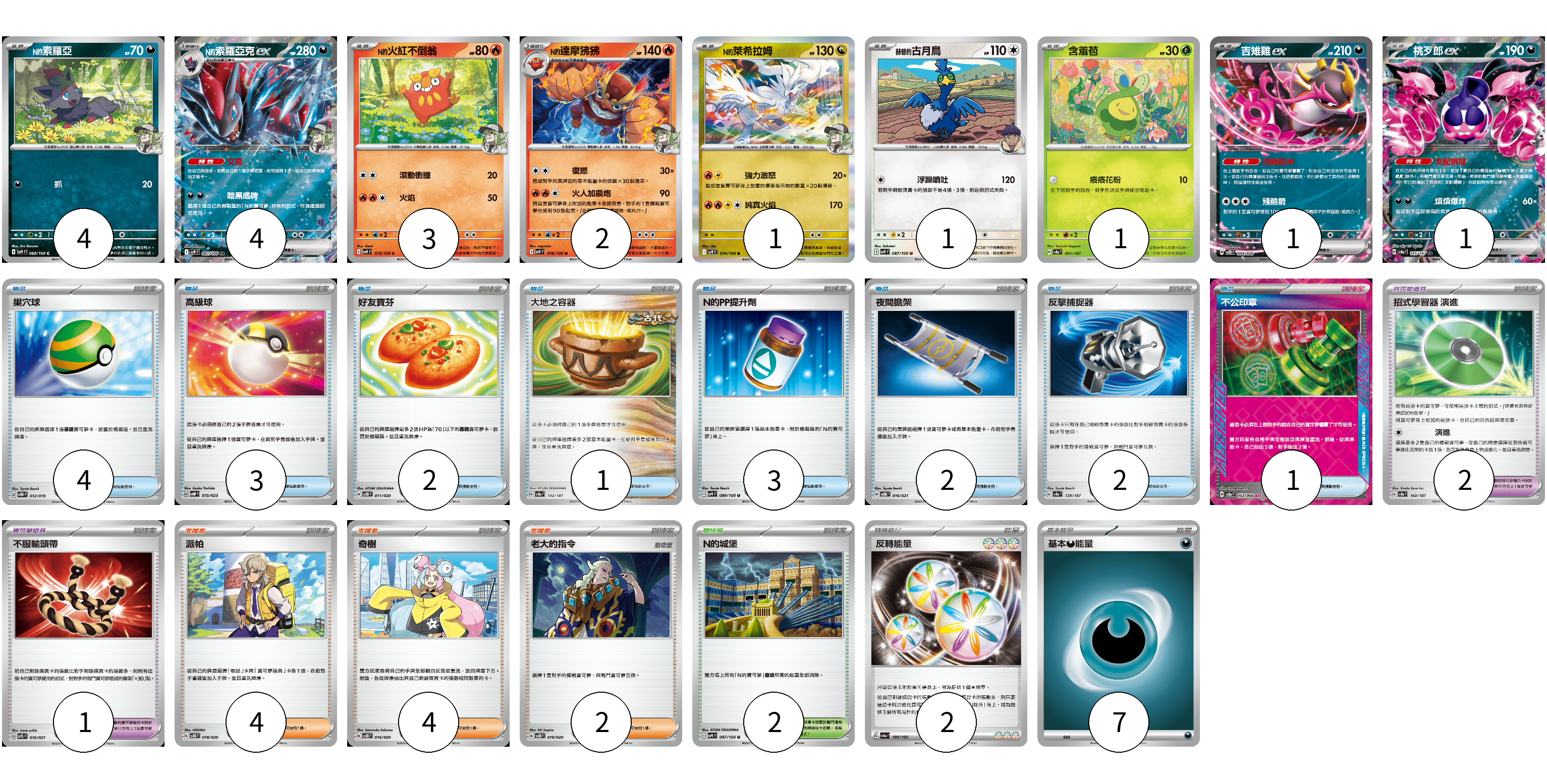 牌組構築方案 以此牌組為基礎新構築牌組 顯示卡面 顯示列表 寶可夢卡(18) 4 4 3 2 1 1 1 1 1 寶可夢道具(3) 2 1 物品卡(18) 4 3 2 1 3 2 2 1 支援者卡(10) 4 4 2 競技場卡(2) 2 能量卡(9) 2 7 寶可夢卡(18) 卡牌名稱 張數 卡牌名稱 張數 N的索羅亞 SV9 060/100 04 N的索羅亞克ex SV9 061/100 04 N的火紅不倒翁 SV9 015/100 03 N的達摩狒狒 SV9 016/100 02 N的萊希拉姆 SV9 074/100 01 赫普的古月鳥 SV9 087/100 01 含羞苞 SV8a 001/187 01 吉雉雞ex SVOD 004/020 01 桃歹郎ex SV8a 105/187 01 寶可夢道具(3) 卡牌名稱 張數 卡牌名稱 張數 招式學習器 演進 SV8a 160/187 02 不服輸頭帶 SVTL 016/021 01 物品卡(18) 卡牌名稱 張數 卡牌名稱 張數 巢穴球 SVTG 012/019 04 高級球 SVQP 015/023 03 好友寶芬 SVOD 011/020 02 大地之容器 SV8a 143/187 01 N的PP提升劑 SV9 089/100 03 夜間擔架 SVOM 016/021 02 反擊捕捉器 SV8a 139/187 02 不公印章 SV5a 053/066 01 支援者卡(10) 卡牌名稱 張數 卡牌名稱 張數 派帕 SVOD 018/020 04 奇樹 SVOD 016/020 04 老大的指令 SVOD 019/020 02 競技場卡(2) 卡牌名稱 張數 卡牌名稱 張數 N的城堡 SV9 097/100 02 能量卡(9) 卡牌名稱 張數 卡牌名稱 張數 反轉能量 SV4a 189/190 02 基本【惡】能量 SVF DAR 07 以此牌組為基礎新構築牌組 牌組編碼 PxmSUT-jMvKiu-YYjpmZ copy 列印牌組單 牌組編碼已複製 分享至SNS