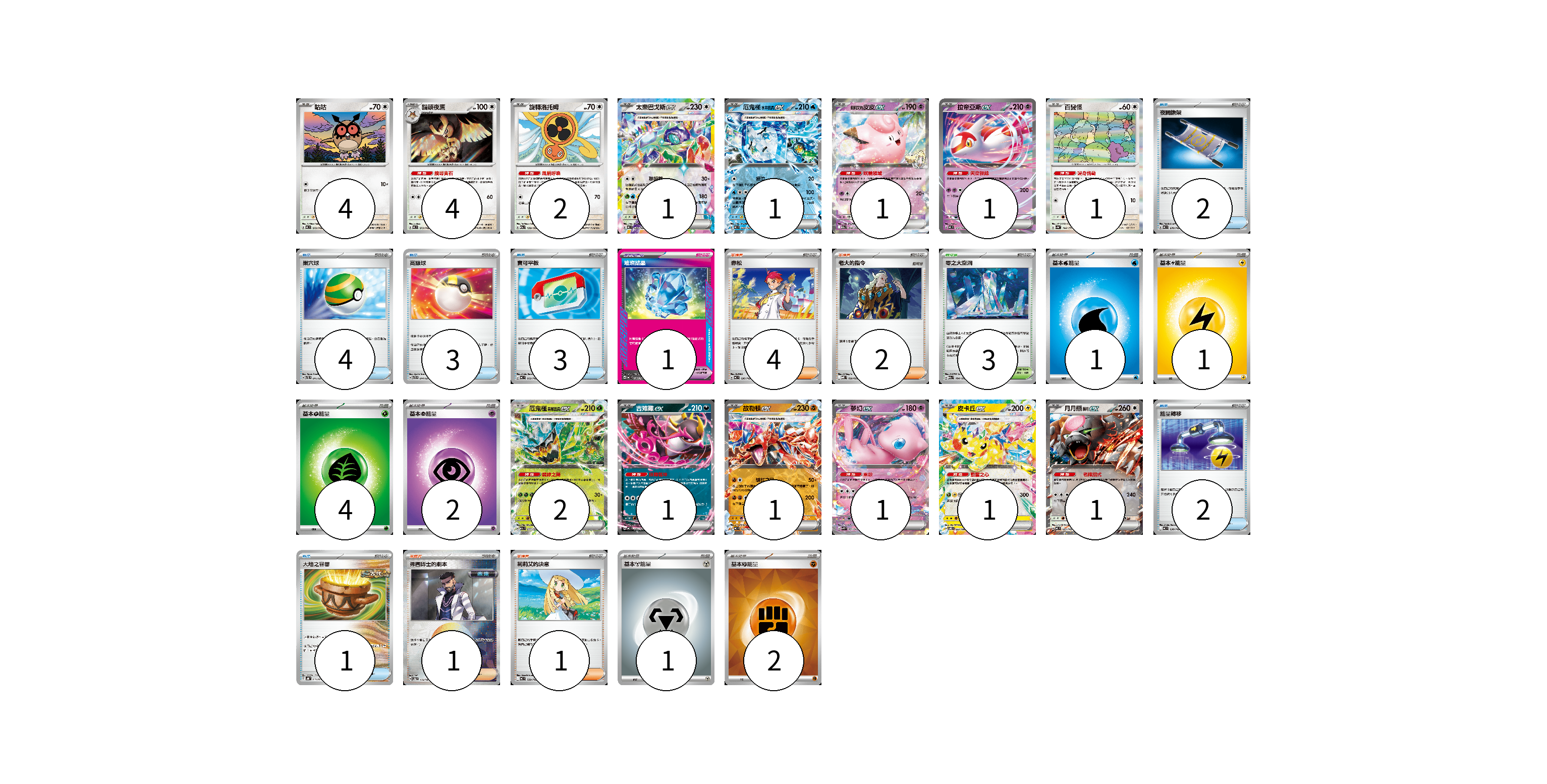 牌組構築方案 以此牌組為基礎新構築牌組 顯示卡面 顯示列表 寶可夢卡(22) 4 4 2 1 1 1 1 1 2 1 1 1 1 1 寶可夢道具(1) 1 物品卡(15) 2 4 3 3 2 1 支援者卡(8) 4 2 1 1 競技場卡(3) 3 能量卡(11) 1 1 4 2 1 2 寶可夢卡(22) 卡牌名稱 張數 卡牌名稱 張數 咕咕 MC 572/742 04 貓頭夜鷹 MC 573/742 04 旋轉洛托姆 M2a 139/193 02 太樂巴戈斯ex MC 630/742 01 厄鬼椪 水井面具ex MC 224/742 01 莉莉艾的皮皮ex M2a 060/193 01 拉帝亞斯ex MC 312/742 01 百變怪 SV4a 144/190 01 厄鬼椪 碧草面具ex M2a 017/193 02 吉雉雞ex MC 489/742 01 故勒頓ex MC 425/742 01 夢幻ex SVK 001/042 01 皮卡丘ex SV8 033/106 01 月月熊 赫月 ex MC 625/742 01 寶可夢道具(1) 卡牌名稱 張數 卡牌名稱 張數 璀璨結晶 MC 680/742 01 物品卡(15) 卡牌名稱 張數 卡牌名稱 張數 夜間擔架 MC 670/742 02 巢穴球 SVTL 011/021 04 高級球 SVTR 014/021 03 寶可平板 MC 662/742 03 能量轉移 MC 638/742 02 大地之容器 SVHK 011/022 01 支援者卡(8) 卡牌名稱 張數 卡牌名稱 張數 赤松 MC 696/742 04 老大的指令 MBD 020/022 02 弗圖博士的劇本 SV8a 175/187 01 莉莉艾的決意 MC 729/742 01 競技場卡(3) 卡牌名稱 張數 卡牌名稱 張數 零之大空洞 M2a 184/193 03 能量卡(11) 卡牌名稱 張數 卡牌名稱 張數 基本【水】能量 MC WAT 01 基本【雷】能量 MC LIG 01 基本【草】能量 MC GRA 04 基本【超】能量 MC PSY 02 基本【鋼】能量 SVD MET 01 基本【鬥】能量 SVK FIG 02 以此牌組為基礎新構築牌組 牌組編碼 PzRHmb-BrqDDY-QTYqGP copy 列印牌組單 牌組編碼已複製 分享至SNS