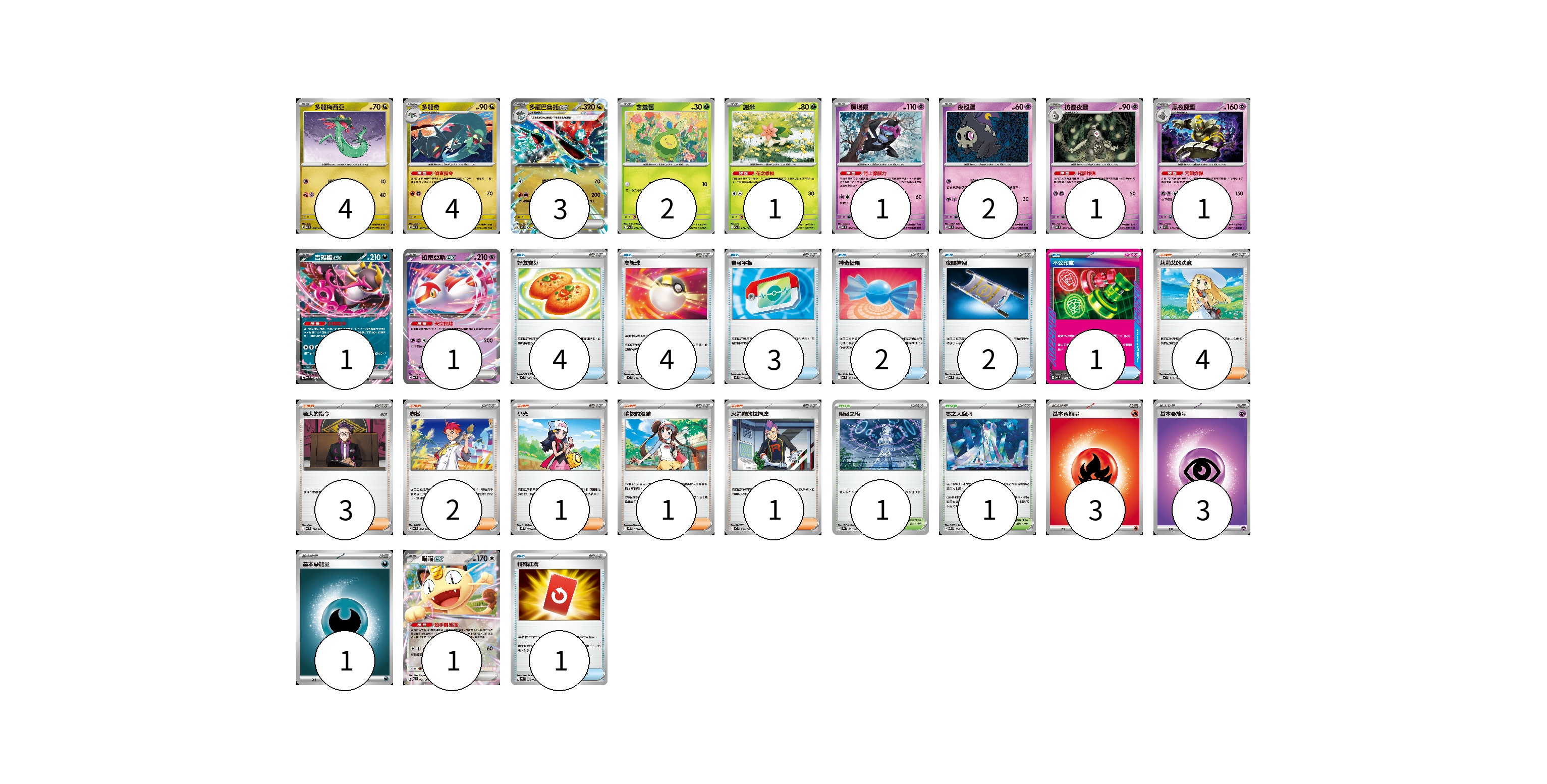 牌組構築方案 以此牌組為基礎新構築牌組 顯示卡面 顯示列表 寶可夢卡(22) 4 4 3 2 1 1 2 1 1 1 1 1 物品卡(17) 4 4 3 2 2 1 1 支援者卡(12) 4 3 2 1 1 1 競技場卡(2) 1 1 能量卡(7) 3 3 1 寶可夢卡(22) 卡牌名稱 張數 卡牌名稱 張數 多龍梅西亞 MC 546/742 04 多龍奇 MC 547/742 04 多龍巴魯托ex MC 548/742 03 含羞苞 M2a 011/193 02 謝米 M2a 012/193 01 願增猿 MC 358/742 01 夜巡靈 MC 308/742 02 彷徨夜靈 MC 309/742 01 黑夜魔靈 MC 310/742 01 吉雉雞ex MC 489/742 01 拉帝亞斯ex MC 312/742 01 喵喵ex M3 061/080 01 物品卡(17) 卡牌名稱 張數 卡牌名稱 張數 好友寶芬 MC 648/742 04 高級球 MC 651/742 04 寶可平板 M3 070/080 03 神奇糖果 MC 655/742 02 夜間擔架 MC 670/742 02 不公印章 MC 633/742 01 特殊紅牌 M4 072/083 01 支援者卡(12) 卡牌名稱 張數 卡牌名稱 張數 莉莉艾的決意 MC 729/742 04 老大的指令 MC 724/742 03 赤松 MC 696/742 02 小光 M2 077/080 01 鳴依的勉勵 M3 075/080 01 火箭隊的拉姆達 MC 734/742 01 競技場卡(2) 卡牌名稱 張數 卡牌名稱 張數 阻礙之塔 SV8a 181/187 01 零之大空洞 M2a 184/193 01 能量卡(7) 卡牌名稱 張數 卡牌名稱 張數 基本【火】能量 MC FIR 03 基本【超】能量 MC PSY 03 基本【惡】能量 MC DAR 01 以此牌組為基礎新構築牌組 牌組編碼 QBKvEi-ctBDWQ-QyuNiM copy 列印牌組單 牌組編碼已複製 分享至SNS