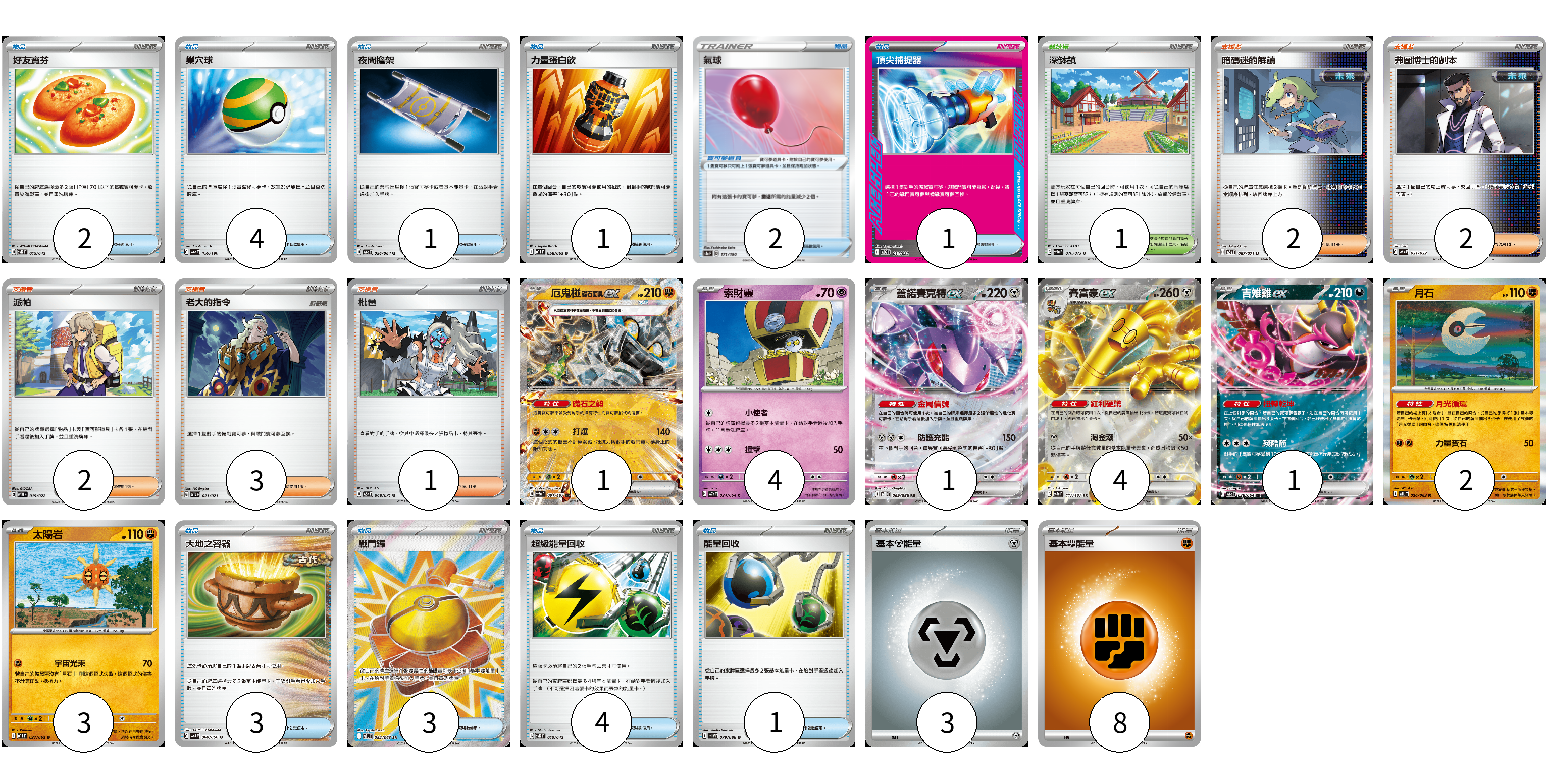 牌組構築方案 以此牌組為基礎新構築牌組 顯示卡面 顯示列表 寶可夢卡(16) 1 4 1 4 1 2 3 寶可夢道具(2) 2 物品卡(20) 2 4 1 1 1 3 3 4 1 支援者卡(10) 2 2 2 3 1 競技場卡(1) 1 能量卡(11) 3 8 寶可夢卡(16) 卡牌名稱 張數 卡牌名稱 張數 厄鬼椪 礎石面具ex SV8a 091/187 01 索財靈 SV7a 024/064 04 蓋諾賽克特ex SV11B 069/086 01 賽富豪ex SV8a 117/187 04 吉雉雞ex SV6a 038/064 01 月石 M1L 026/063 02 太陽岩 M1L 027/063 03 寶可夢道具(2) 卡牌名稱 張數 卡牌名稱 張數 氣球 S4a 171/190 02 物品卡(20) 卡牌名稱 張數 卡牌名稱 張數 好友寶芬 SVK 015/042 02 巢穴球 SV4a 159/190 04 夜間擔架 SV6a 056/064 01 力量蛋白飲 M1L 058/063 01 頂尖捕捉器 MBG 014/022 01 大地之容器 SV4K 060/066 03 戰鬥鑼 M1L 082/063 03 超級能量回收 SVK 010/042 04 能量回收 SV11W 079/086 01 支援者卡(10) 卡牌名稱 張數 卡牌名稱 張數 暗碼迷的解讀 SV5M 067/071 02 弗圖博士的劇本 SVHM 021/022 02 派帕 SVTM 019/022 02 老大的指令 SVTL 021/021 03 枇琶 SV5K 068/071 01 競技場卡(1) 卡牌名稱 張數 卡牌名稱 張數 深缽鎮 SV1a 070/073 01 能量卡(11) 卡牌名稱 張數 卡牌名稱 張數 基本【鋼】能量 M-P MET 03 基本【鬥】能量 M-P FIG 08 以此牌組為基礎新構築牌組 牌組編碼 QEgDoW-rHgjKn-LBruYO copy 列印牌組單 牌組編碼已複製 分享至SNS