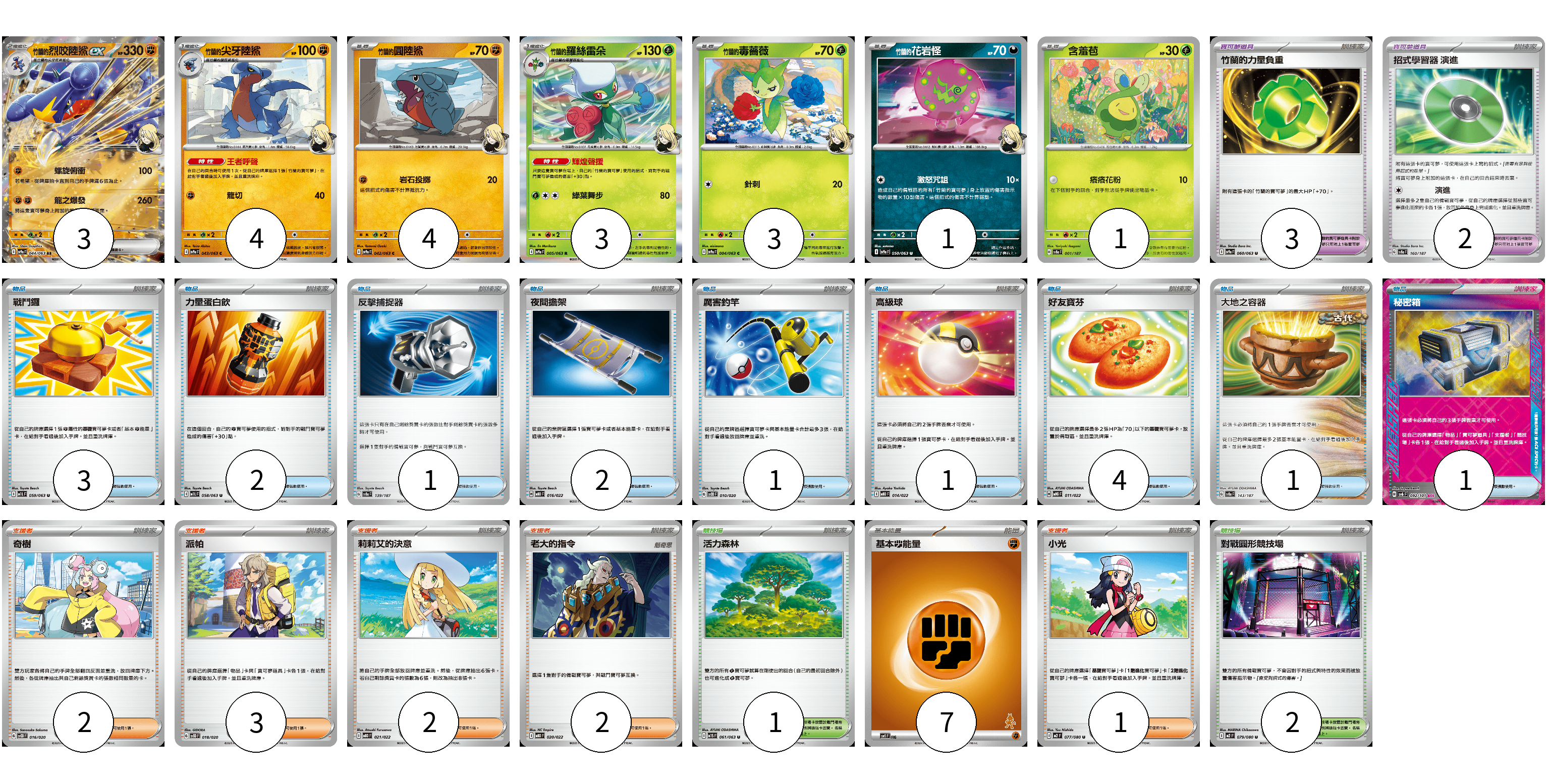 牌組構築方案 以此牌組為基礎新構築牌組 顯示卡面 顯示列表 寶可夢卡(19) 3 4 4 3 3 1 1 寶可夢道具(5) 3 2 物品卡(16) 3 2 1 2 1 1 4 1 1 支援者卡(10) 2 3 2 2 1 競技場卡(3) 1 2 能量卡(7) 7 寶可夢卡(19) 卡牌名稱 張數 卡牌名稱 張數 <竹蘭的>烈咬陸鯊ex SV9a 044/063 03 <竹蘭的>尖牙陸鯊 SV9a 043/063 04 <竹蘭的>圓陸鯊 SV9a 042/063 04 <竹蘭的>羅絲雷朵 SV9a 005/063 03 <竹蘭的>毒薔薇 SV9a 004/063 03 <竹蘭的>花岩怪 SV9a 050/063 01 含羞苞 SV8a 001/187 01 寶可夢道具(5) 卡牌名稱 張數 卡牌名稱 張數 竹蘭的力量負重 SV9a 060/063 03 招式學習器 演進 SV8a 160/187 02 物品卡(16) 卡牌名稱 張數 卡牌名稱 張數 戰鬥鑼 M1L 059/063 03 力量蛋白飲 M1L 058/063 02 反擊捕捉器 SV8a 139/187 01 夜間擔架 MBD 016/022 02 厲害釣竿 SVOD 010/020 01 高級球 MBD 014/022 01 好友寶芬 MBG 011/022 04 大地之容器 SV8a 143/187 01 秘密箱 SV6 092/101 01 支援者卡(10) 卡牌名稱 張數 卡牌名稱 張數 奇樹 SVOD 016/020 02 派帕 SVOD 018/020 03 莉莉艾的決意 MBD 021/022 02 老大的指令 MBD 020/022 02 小光 M2 077/080 01 競技場卡(3) 卡牌名稱 張數 卡牌名稱 張數 活力森林 M1S 061/063 01 對戰圓形競技場 M2 079/080 02 能量卡(7) 卡牌名稱 張數 卡牌名稱 張數 基本【鬥】能量 SVI FIG 07 以此牌組為基礎新構築牌組 牌組編碼 QHBCzH-sSJRyX-tscXYo copy 列印牌組單 牌組編碼已複製 分享至SNS
