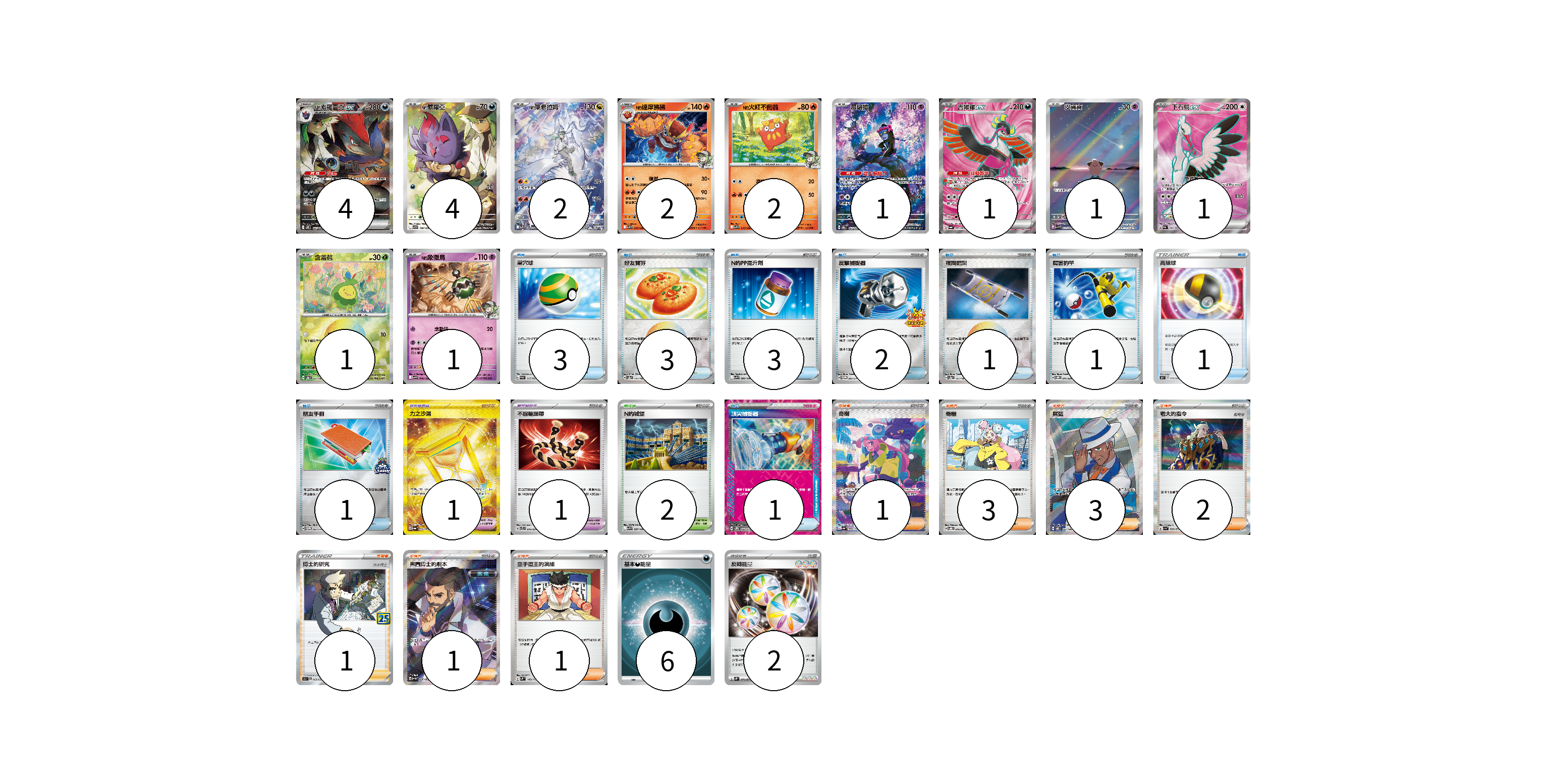牌組構築方案 以此牌組為基礎新構築牌組 顯示卡面 顯示列表 寶可夢卡(20) 4 4 2 2 2 1 1 1 1 1 1 寶可夢道具(2) 1 1 物品卡(16) 3 3 3 2 1 1 1 1 1 支援者卡(12) 1 3 3 2 1 1 1 競技場卡(2) 2 能量卡(8) 6 2 寶可夢卡(20) 卡牌名稱 張數 卡牌名稱 張數 N的索羅亞克ex SV9 127/100 04 N的索羅亞 SV9 108/100 04 N的萊希拉姆 SV9 109/100 02 N的達摩狒狒 SV9 016/100 02 N的火紅不倒翁 SV9 015/100 02 願增猿 SV6 107/101 01 吉雉雞ex SV6a 081/064 01 皮寶寶 SV3 113/108 01 下石鳥ex SV3a 080/062 01 含羞苞 SV8a 001/187 01 N的象徵鳥 SV9 040/100 01 寶可夢道具(2) 卡牌名稱 張數 卡牌名稱 張數 力之沙漏 SV6a 094/064 01 不服輸頭帶 SVTL 016/021 01 物品卡(16) 卡牌名稱 張數 卡牌名稱 張數 巢穴球 SVAM 015/023 03 好友寶芬 SV8a 147/187 03 N的PP提升劑 SV9 089/100 03 反擊捕捉器 SV-P 083/SV-P 02 夜間擔架 SV8a 151/187 01 厲害釣竿 SVOM 011/021 01 高級球 SK 015/030 01 朋友手冊 SV-P 182/SV-P 01 頂尖捕捉器 SV5M 062/071 01 支援者卡(12) 卡牌名稱 張數 卡牌名稱 張數 奇樹 SV4a 350/190 01 奇樹 SVOD 016/020 03 席藍 SV8 127/106 03 老大的指令 SV1a 069/073 02 博士的研究(大木博士) S8a 003/028 01 弗圖博士的劇本 SV4M 086/066 01 空手道王的演練 SVM 143/175 01 競技場卡(2) 卡牌名稱 張數 卡牌名稱 張數 N的城堡 SV9 097/100 02 能量卡(8) 卡牌名稱 張數 卡牌名稱 張數 基本惡能量 SLD DAR 06 反轉能量 SV2P 071/071 02 以此牌組為基礎新構築牌組 牌組編碼 QHQOzO-RpAfZV-lExWGa copy 列印牌組單 牌組編碼已複製 分享至SNS