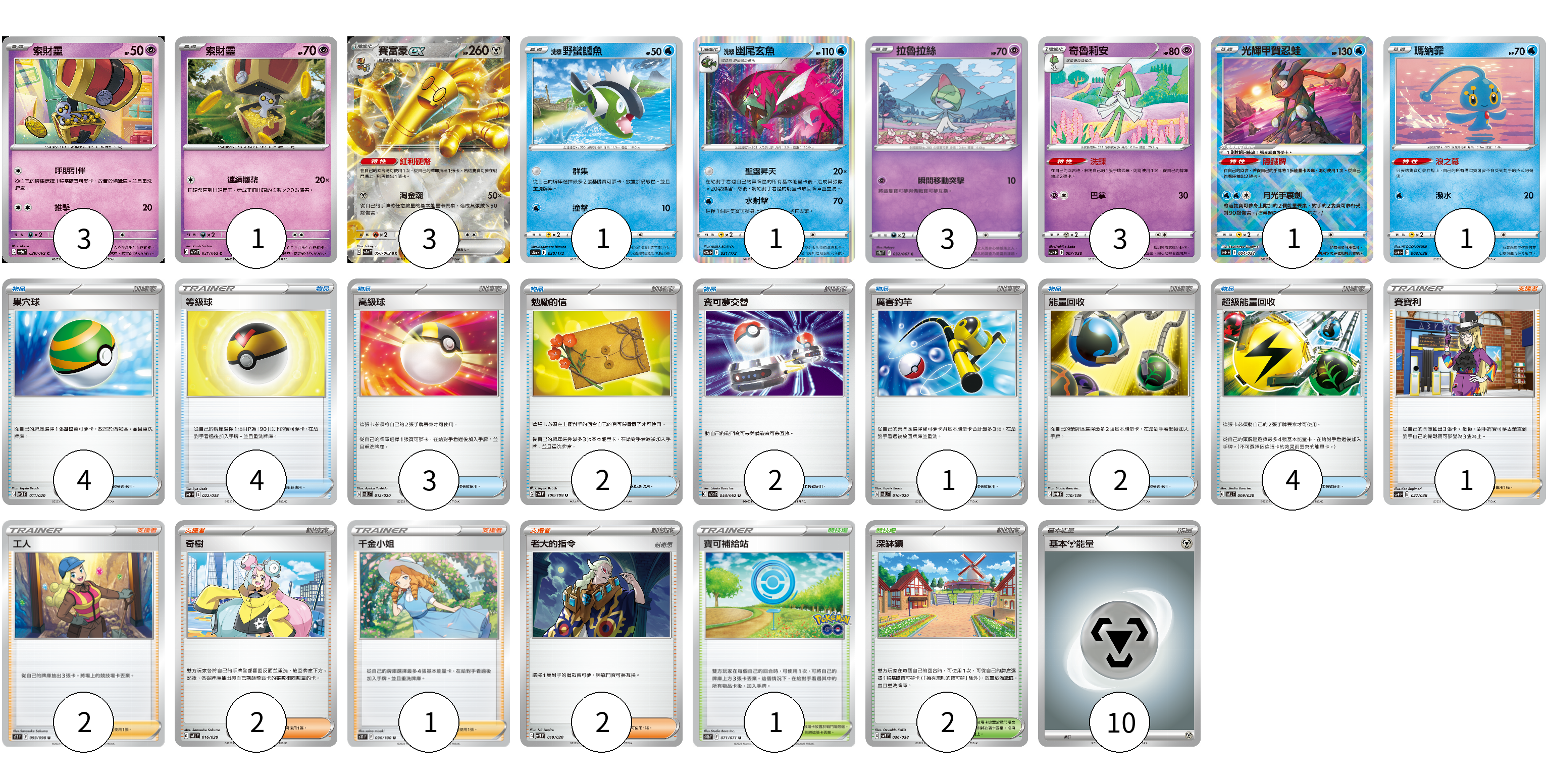 牌組構築方案 以此牌組為基礎新構築牌組 顯示卡面 顯示列表 寶可夢卡(18) 3 1 3 1 1 3 3 1 1 1 物品卡(21) 4 4 3 2 2 2 4 支援者卡(8) 1 2 2 1 2 競技場卡(3) 1 2 能量卡(10) 10 寶可夢卡(18) 卡牌名稱 張數 卡牌名稱 張數 索財靈 SV3a 020/062 03 索財靈 SV3a 021/062 01 賽富豪ex SV3a 050/062 03 洗翠 野蠻鱸魚 S12a 030/172 01 洗翠 幽尾玄魚 S12a 031/172 01 拉魯拉絲 S9a 032/067 03 奇魯莉安 SVF 007/038 03 光輝甲賀忍蛙 SVF 004/038 01 瑪納霏 SVF 003/038 01 厲害釣竿 SVEL 010/020 01 物品卡(21) 卡牌名稱 張數 卡牌名稱 張數 巢穴球 SVEL 011/020 04 等級球 SVF 022/038 04 高級球 SVEL 012/020 03 勉勵的信 SV3 100/108 02 寶可夢交替 SV3a 054/062 02 能量回收 SVD 110/139 02 超級能量回收 SVEL 009/020 04 支援者卡(8) 卡牌名稱 張數 卡牌名稱 張數 賽寶利 SVF 027/038 01 工人 S12 093/098 02 奇樹 SVEL 016/020 02 千金小姐 S11 096/100 01 老大的指令 SVEL 019/020 02 競技場卡(3) 卡牌名稱 張數 卡牌名稱 張數 寶可補給站 S10b 071/071 01 深缽鎮 SVF 036/038 02 能量卡(10) 卡牌名稱 張數 卡牌名稱 張數 基本鋼能量 sv-p MET 10 以此牌組為基礎新構築牌組 牌組編碼 QIzNjh-VGAPXZ-Audhes copy 列印牌組單 牌組編碼已複製 分享至SNS