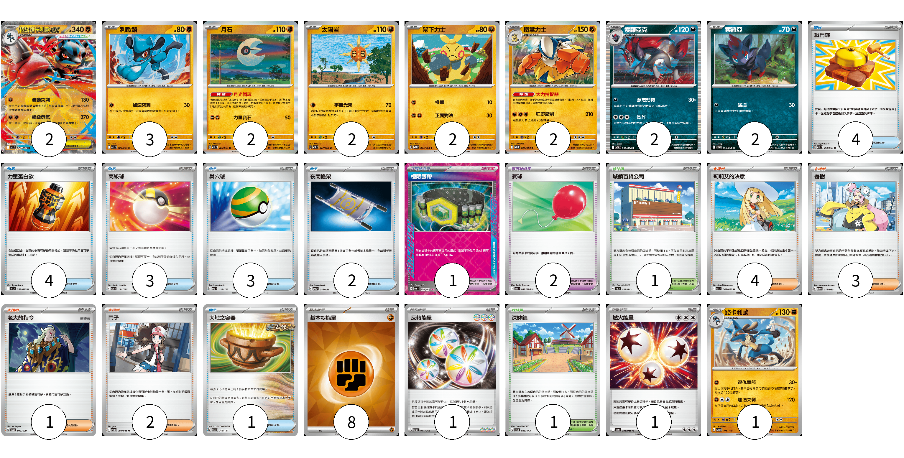 牌組構築方案 以此牌組為基礎新構築牌組 顯示卡面 顯示列表 寶可夢卡(18) 2 3 2 2 2 2 2 2 1 寶可夢道具(3) 1 2 物品卡(17) 4 4 3 3 2 1 支援者卡(10) 4 3 1 2 競技場卡(2) 1 1 能量卡(10) 8 1 1 寶可夢卡(18) 卡牌名稱 張數 卡牌名稱 張數 超級路卡利歐ex M1L 029/063 02 利歐路 M1L 028/063 03 月石 M1L 026/063 02 太陽岩 M1L 027/063 02 幕下力士 M1L 024/063 02 鐵掌力士 M1L 025/063 02 索羅亞克 SV11W 059/086 02 索羅亞 SV11W 058/086 02 路卡利歐 SV4a 105/190 01 寶可夢道具(3) 卡牌名稱 張數 卡牌名稱 張數 極限腰帶 SV8a 159/187 01 氣球 SV11B 082/086 02 物品卡(17) 卡牌名稱 張數 卡牌名稱 張數 戰鬥鑼 M1L 059/063 04 力量蛋白飲 M1L 058/063 04 高級球 SVM 134/175 03 巢穴球 SVM 133/175 03 夜間擔架 SVOM 016/021 02 大地之容器 SV8a 143/187 01 支援者卡(10) 卡牌名稱 張數 卡牌名稱 張數 莉莉艾的決意 M1L 062/063 04 奇樹 SVOD 016/020 03 老大的指令 SVOD 019/020 01 鬥子 SV11W 085/086 02 競技場卡(2) 卡牌名稱 張數 卡牌名稱 張數 城鎮百貨公司 SVK 037/042 01 深缽鎮 SVK 039/042 01 能量卡(10) 卡牌名稱 張數 卡牌名稱 張數 基本【鬥】能量 SVM FIG 08 反轉能量 SVK 041/042 01 燃火能量 SV11W 086/086 01 以此牌組為基礎新構築牌組 牌組編碼 QKwLdn-zjQuVc-onmDWm copy 列印牌組單 牌組編碼已複製 分享至SNS