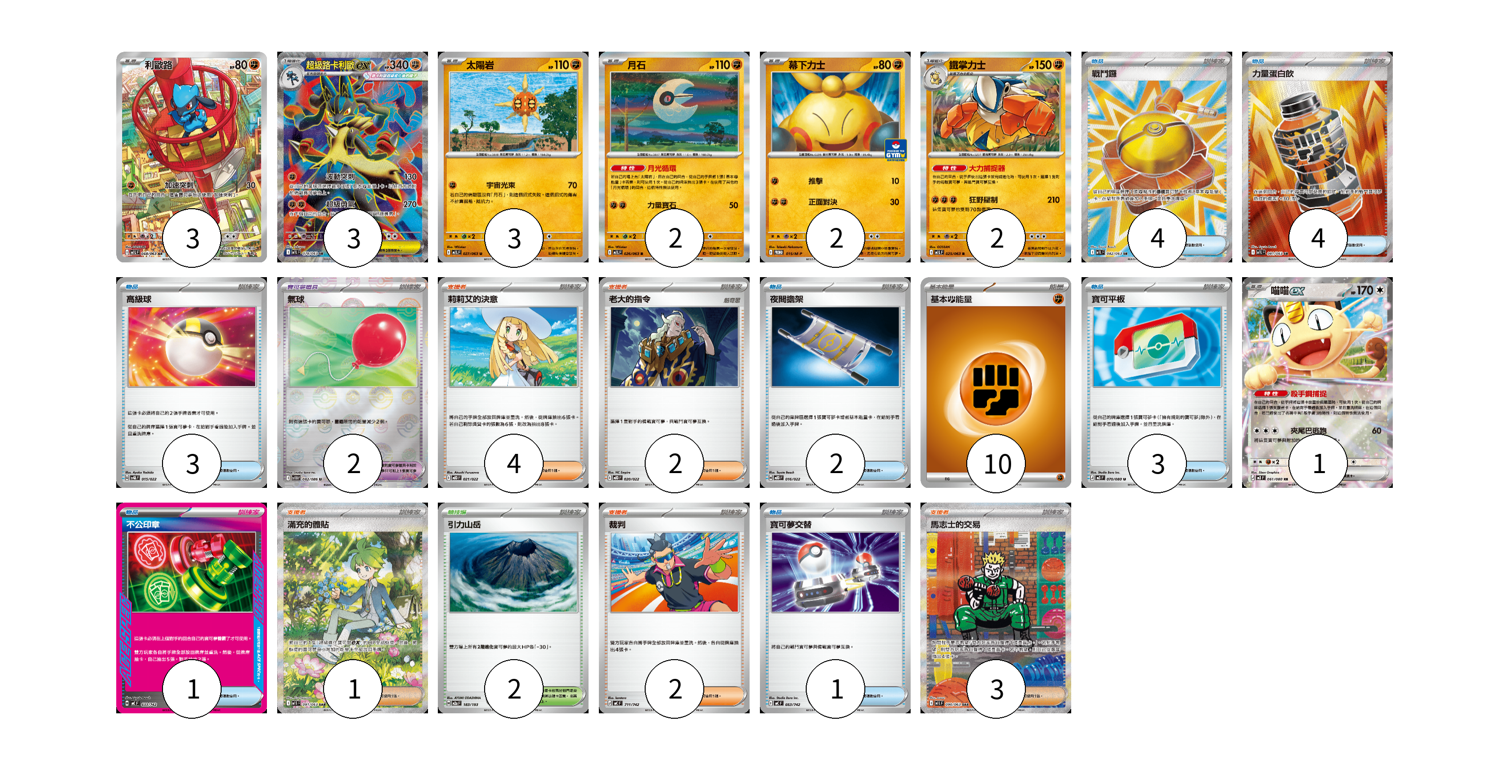 牌組構築方案 以此牌組為基礎新構築牌組 顯示卡面 顯示列表 寶可夢卡(16) 3 3 3 2 2 2 1 寶可夢道具(2) 2 物品卡(18) 4 4 3 2 3 1 1 支援者卡(12) 4 2 1 2 3 競技場卡(2) 2 能量卡(10) 10 寶可夢卡(16) 卡牌名稱 張數 卡牌名稱 張數 利歐路 M1L 068/063 03 超級路卡利歐ex M1L 078/063 03 太陽岩 M1L 027/063 03 月石 M1L 026/063 02 幕下力士 M-P 015/M-P 02 鐵掌力士 M1L 025/063 02 喵喵ex M3 061/080 01 寶可夢道具(2) 卡牌名稱 張數 卡牌名稱 張數 氣球 SV11B 082/086 02 物品卡(18) 卡牌名稱 張數 卡牌名稱 張數 戰鬥鑼 M1L 082/063 04 力量蛋白飲 M1L 081/063 04 高級球 SVQL 015/022 03 夜間擔架 MBD 016/022 02 寶可平板 M3 070/080 03 不公印章 MC 633/742 01 寶可夢交替 MC 663/742 01 支援者卡(12) 卡牌名稱 張數 卡牌名稱 張數 莉莉艾的決意 MBD 021/022 04 老大的指令 MBD 020/022 02 滿充的體貼 M1S 091/063 01 裁判 MC 711/742 02 馬志士的交易 M1L 090/063 03 競技場卡(2) 卡牌名稱 張數 卡牌名稱 張數 引力山岳 M2a 183/193 02 能量卡(10) 卡牌名稱 張數 卡牌名稱 張數 基本鬥能量 sv-p FIG 10 以此牌組為基礎新構築牌組 牌組編碼 QLDHHZ-HIOXEj-eSHUSE copy 列印牌組單 牌組編碼已複製 分享至SNS
