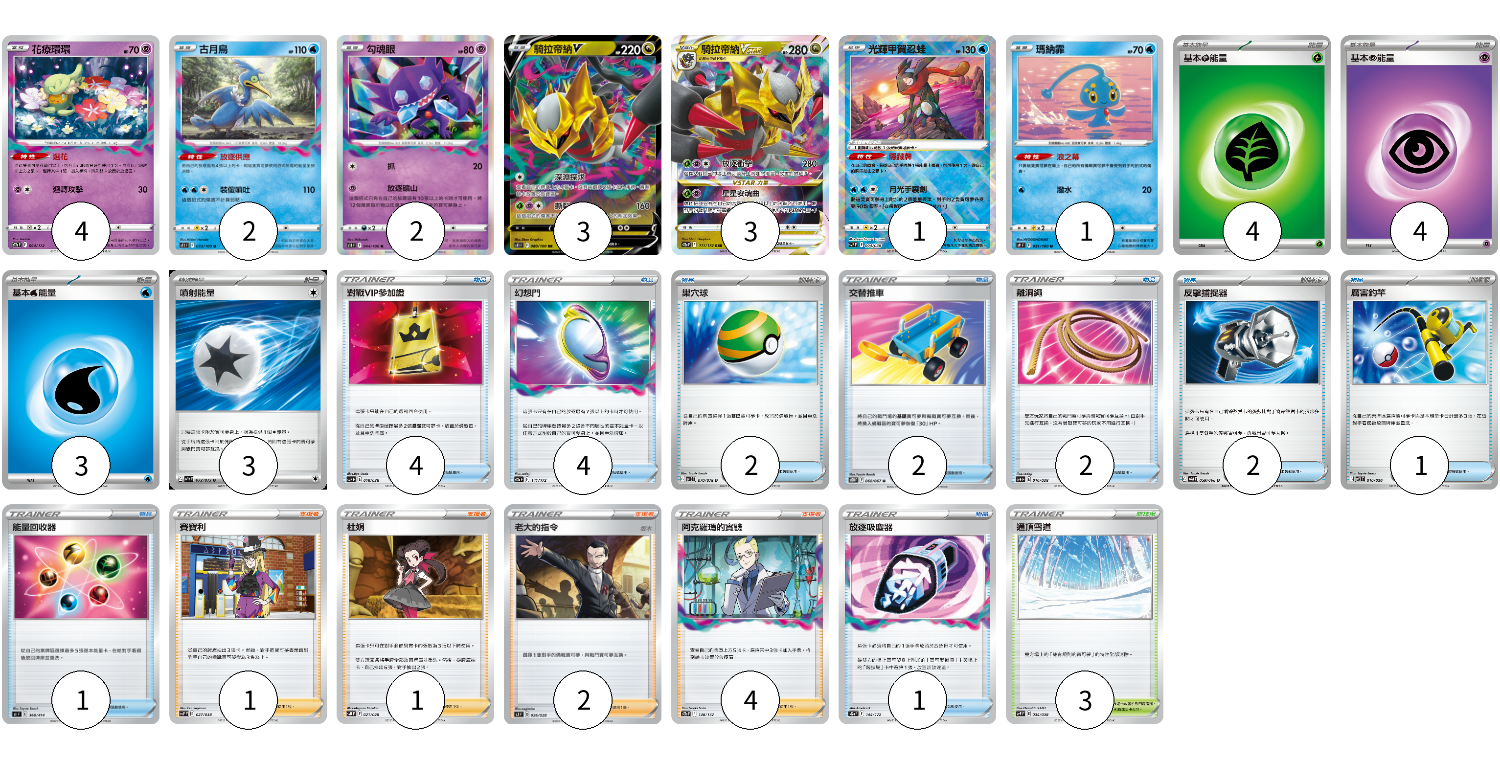 牌組構築方案 以此牌組為基礎新構築牌組 顯示卡面 顯示列表 寶可夢卡(17) 4 2 2 3 3 1 1 1 物品卡(18) 4 4 2 2 2 2 1 1 支援者卡(8) 1 1 2 4 競技場卡(3) 3 能量卡(14) 4 4 3 3 寶可夢卡(17) 卡牌名稱 張數 卡牌名稱 張數 花療環環 S12a 064/172 04 古月鳥 S11 033/100 02 勾魂眼 S11 044/100 02 騎拉帝納V S11 080/100 03 騎拉帝納VSTAR S12a 111/172 03 光輝甲賀忍蛙 SVF 004/038 01 瑪納霏 S9 031/100 01 厲害釣竿 SVEL 010/020 01 物品卡(18) 卡牌名稱 張數 卡牌名稱 張數 對戰VIP參加證 SVF 018/038 04 幻想門 S12a 141/172 04 巢穴球 SV1S 070/078 02 交替推車 S10D 060/067 02 離洞繩 SVF 010/038 02 反擊捕捉器 SV4M 059/066 02 能量回收器 SI 368/414 01 放逐吸塵器 S12a 144/172 01 支援者卡(8) 卡牌名稱 張數 卡牌名稱 張數 賽寶利 SVF 027/038 01 杜娟 SVB 021/028 01 老大的指令(坂木) SJ 026/028 02 阿克羅瑪的實驗 S12a 148/172 04 競技場卡(3) 卡牌名稱 張數 卡牌名稱 張數 通頂雪道 SVF 034/038 03 能量卡(14) 卡牌名稱 張數 卡牌名稱 張數 基本【草】能量 SVF GRA 04 基本【超】能量 SVEM PSY 04 基本【水】能量 SVF WAT 03 噴射能量 SV1a 072/073 03 以此牌組為基礎新構築牌組 牌組編碼 QLpNao-jvneZv-DbwjpF copy 列印牌組單 牌組編碼已複製 分享至SNS