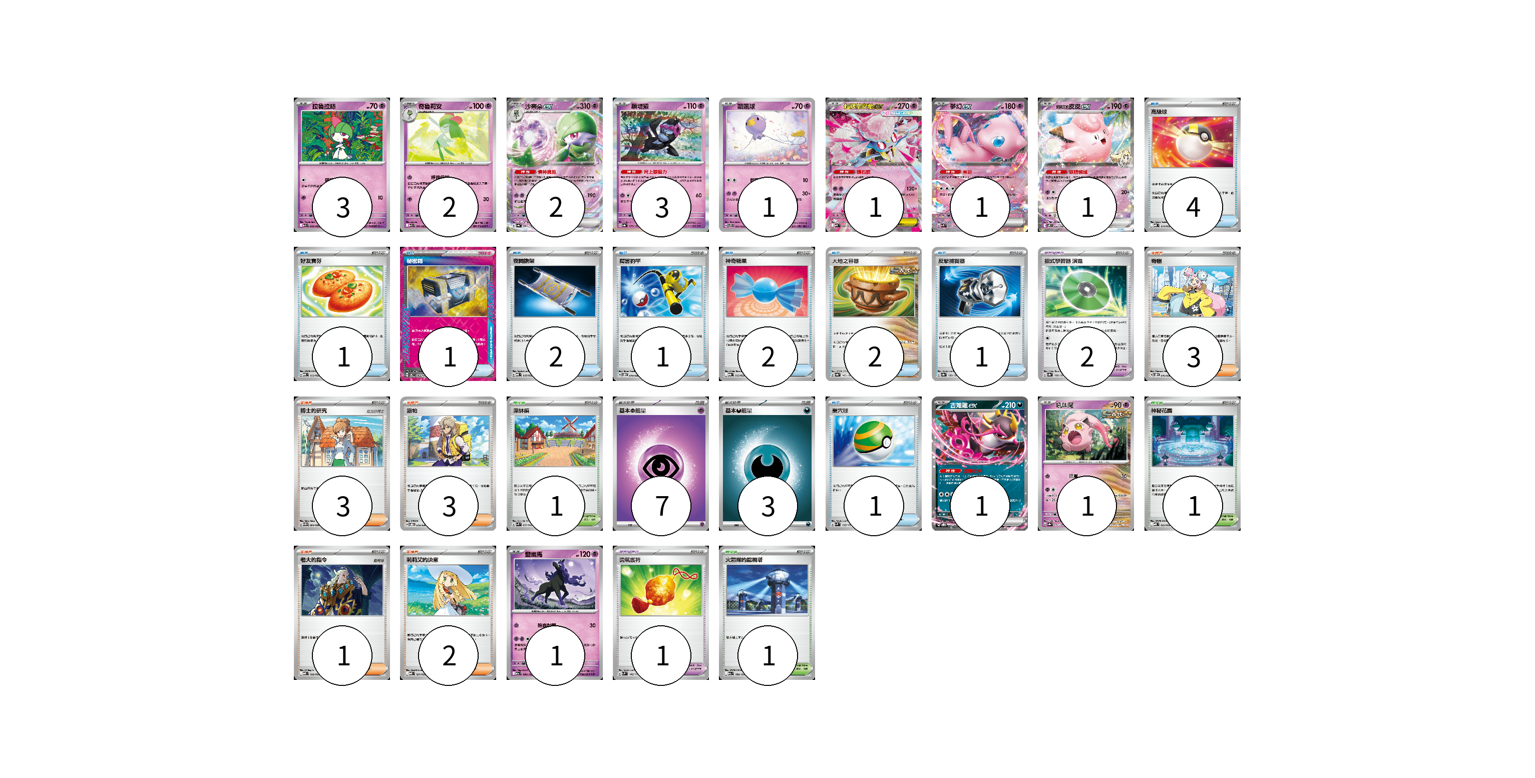牌組構築方案 以此牌組為基礎新構築牌組 顯示卡面 顯示列表 寶可夢卡(17) 3 2 2 3 1 1 1 1 1 1 1 寶可夢道具(3) 2 1 物品卡(15) 4 1 1 2 1 2 2 1 1 支援者卡(12) 3 3 3 1 2 競技場卡(3) 1 1 1 能量卡(10) 7 3 寶可夢卡(17) 卡牌名稱 張數 卡牌名稱 張數 拉魯拉絲 M1S 040/063 03 奇魯莉安 M1S 041/063 02 沙奈朵ex SV4a 082/190 02 願增猿 SV8a 075/187 03 飄飄球 SVTS 005/022 01 超級蒂安希ex MBD 006/022 01 夢幻ex SVK 001/042 01 莉莉艾的皮皮ex SV9 033/100 01 吉雉雞ex SVOD 004/020 01 吼叫尾 SV8a 071/187 01 靈幽馬 M2a 080/193 01 寶可夢道具(3) 卡牌名稱 張數 卡牌名稱 張數 招式學習器 演進 SV8a 160/187 02 勇氣護符 SVM 142/175 01 物品卡(15) 卡牌名稱 張數 卡牌名稱 張數 高級球 MBD 014/022 04 好友寶芬 MBD 013/022 01 秘密箱 SV6 092/101 01 夜間擔架 MBD 016/022 02 厲害釣竿 SVOD 010/020 01 神奇糖果 MBG 013/022 02 大地之容器 SV8a 143/187 02 反擊捕捉器 SV8a 139/187 01 巢穴球 SVM 133/175 01 支援者卡(12) 卡牌名稱 張數 卡牌名稱 張數 奇樹 SVOD 016/020 03 博士的研究 SV11B 084/086 03 派帕 SVOD 018/020 03 老大的指令 MBD 020/022 01 莉莉艾的決意 MBD 021/022 02 競技場卡(3) 卡牌名稱 張數 卡牌名稱 張數 深缽鎮 SVK 039/042 01 神秘花園 MBD 022/022 01 火箭隊的監視塔 M2a 189/193 01 能量卡(10) 卡牌名稱 張數 卡牌名稱 張數 基本【超】能量 MBD PSY 07 基本【惡】能量 MBG DAR 03 以此牌組為基礎新構築牌組 牌組編碼 QMKyef-WCNCQF-dazZrf copy 列印牌組單 牌組編碼已複製 分享至SNS