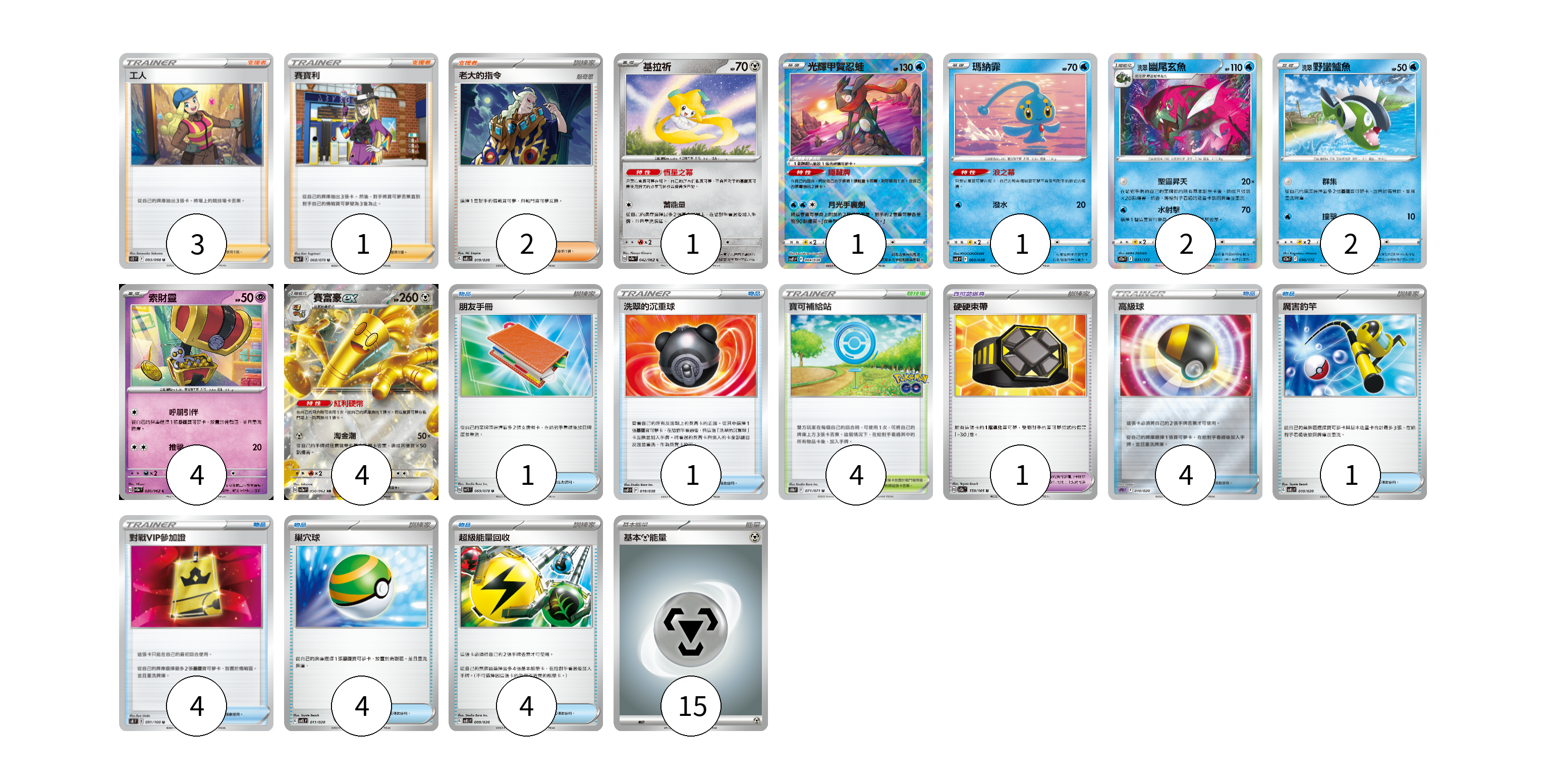 牌組構築方案 以此牌組為基礎新構築牌組 顯示卡面 顯示列表 寶可夢卡(16) 1 1 1 2 2 4 4 1 寶可夢道具(1) 1 物品卡(18) 1 1 4 4 4 4 支援者卡(6) 3 1 2 競技場卡(4) 4 能量卡(15) 15 寶可夢卡(16) 卡牌名稱 張數 卡牌名稱 張數 基拉祈 SV3a 042/062 01 光輝甲賀忍蛙 SVF 004/038 01 瑪納霏 SVF 003/038 01 洗翠 幽尾玄魚 S12a 031/172 02 洗翠 野蠻鱸魚 S12a 030/172 02 索財靈 SV3a 020/062 04 賽富豪ex SV3a 050/062 04 厲害釣竿 SVEL 010/020 01 寶可夢道具(1) 卡牌名稱 張數 卡牌名稱 張數 硬硬束帶 SV2a 159/165 01 物品卡(18) 卡牌名稱 張數 卡牌名稱 張數 朋友手冊 SV1S 069/078 01 洗翠的沉重球 SVF 019/038 01 高級球 SPD 010/020 04 對戰VIP參加證 S8 091/100 04 巢穴球 SVEL 011/020 04 超級能量回收 SVEL 009/020 04 支援者卡(6) 卡牌名稱 張數 卡牌名稱 張數 工人 S12 093/098 03 賽寶利 S5a 068/070 01 老大的指令 SVEL 019/020 02 競技場卡(4) 卡牌名稱 張數 卡牌名稱 張數 寶可補給站 S10b 071/071 04 能量卡(15) 卡牌名稱 張數 卡牌名稱 張數 基本【鋼】能量 SVF MET 15 以此牌組為基礎新構築牌組 牌組編碼 QOVheu-nnYiIS-lZxDtr copy 列印牌組單 牌組編碼已複製 分享至SNS