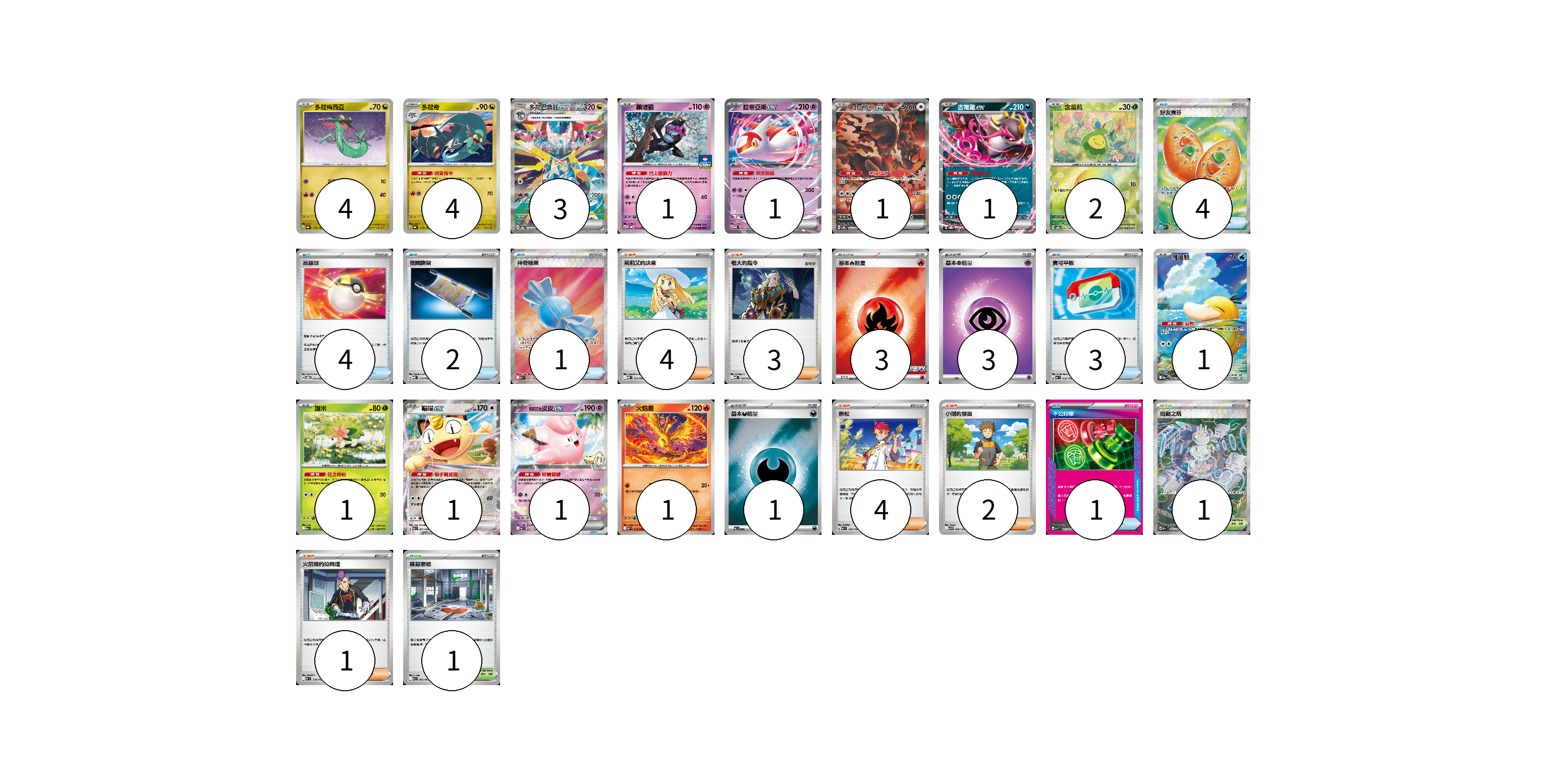 牌組構築方案 以此牌組為基礎新構築牌組 顯示卡面 顯示列表 寶可夢卡(22) 4 4 3 1 1 1 1 2 1 1 1 1 1 物品卡(15) 4 4 2 1 3 1 支援者卡(14) 4 3 4 2 1 競技場卡(2) 1 1 能量卡(7) 3 3 1 寶可夢卡(22) 卡牌名稱 張數 卡牌名稱 張數 多龍梅西亞 SV8a 118/187 04 多龍奇 SV8a 119/187 04 多龍巴魯托ex SV8a 221/187 03 願增猿 M-P 014/M-P 01 拉帝亞斯ex MBD 003/022 01 月月熊 赫月ex SV8a 225/187 01 吉雉雞ex SVOD 004/020 01 含羞苞 SV8a 001/187 02 可達鴨 M2a 199/193 01 謝米 M2a 012/193 01 喵喵ex M3 061/080 01 莉莉艾的皮皮ex MC 287/742 01 火焰鳥 M2 014/080 01 物品卡(15) 卡牌名稱 張數 卡牌名稱 張數 好友寶芬 M1S 081/063 04 高級球 SVOD 012/020 04 夜間擔架 MBD 016/022 02 神奇糖果 M1S 082/063 01 寶可平板 MC 662/742 03 不公印章 MBD 011/022 01 支援者卡(14) 卡牌名稱 張數 卡牌名稱 張數 莉莉艾的決意 MBD 021/022 04 老大的指令 MBD 020/022 03 赤松 MC 696/742 04 小剛的發掘 SV9 096/100 02 火箭隊的拉姆達 MC 734/742 01 競技場卡(2) 卡牌名稱 張數 卡牌名稱 張數 阻礙之塔 M2a 222/193 01 險惡廢墟 M1L 063/063 01 能量卡(7) 卡牌名稱 張數 卡牌名稱 張數 基本【火】能量 M-P 032/M-P 03 基本【超】能量 MBD PSY 03 基本【惡】能量 MC DAR 01 以此牌組為基礎新構築牌組 牌組編碼 QPNJfK-eYKbHI-IHkBBM copy 列印牌組單 牌組編碼已複製 分享至SNS