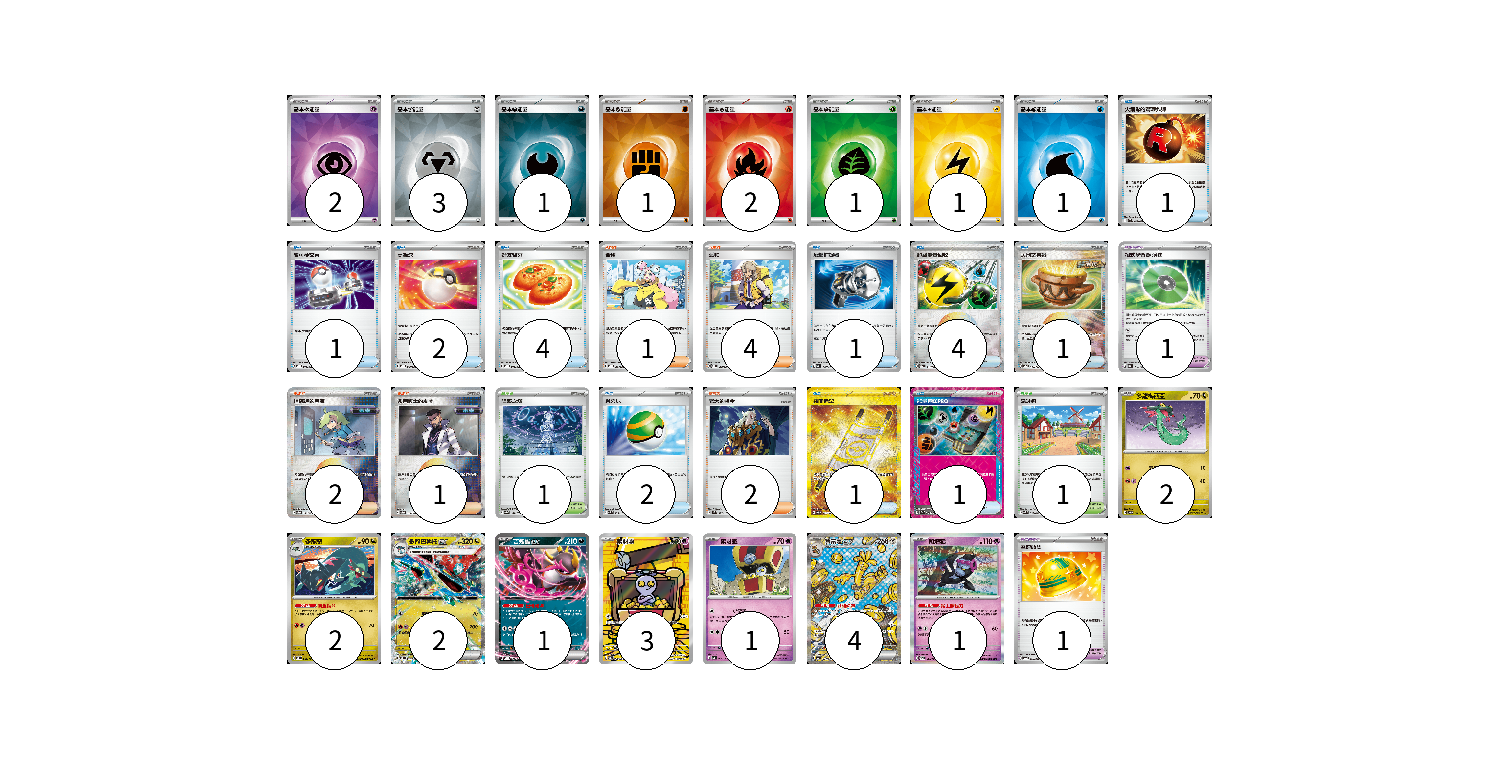 牌組構築方案 以此牌組為基礎新構築牌組 顯示卡面 顯示列表 寶可夢卡(16) 2 2 2 1 3 1 4 1 寶可夢道具(2) 1 1 物品卡(18) 1 1 2 4 1 4 1 2 1 1 支援者卡(10) 1 4 2 1 2 競技場卡(2) 1 1 能量卡(12) 2 3 1 1 2 1 1 1 寶可夢卡(16) 卡牌名稱 張數 卡牌名稱 張數 多龍梅西亞 SV6 079/101 02 多龍奇 SV6 080/101 02 多龍巴魯托ex SV6 081/101 02 吉雉雞ex SVOD 004/020 01 索財靈 SV3a 068/062 03 索財靈 SV7a 024/064 01 賽富豪ex SV8a 220/187 04 願增猿 SV6 055/101 01 寶可夢道具(2) 卡牌名稱 張數 卡牌名稱 張數 招式學習器 演進 SV8a 160/187 01 幸運頭盔 SV5a 060/066 01 物品卡(18) 卡牌名稱 張數 卡牌名稱 張數 火箭隊的驚嚇炸彈 SV10 089/098 01 寶可夢交替 SVOD 014/020 01 高級球 SVOD 012/020 02 好友寶芬 SVOD 011/020 04 反擊捕捉器 SV8a 139/187 01 超級能量回收 SV8a 141/187 04 大地之容器 SV8a 143/187 01 巢穴球 SVM 133/175 02 夜間擔架 SV8 137/106 01 能量輸送PRO SV7a 052/064 01 支援者卡(10) 卡牌名稱 張數 卡牌名稱 張數 奇樹 SVOD 016/020 01 派帕 SVOD 018/020 04 暗碼迷的解讀 SV8a 165/187 02 弗圖博士的劇本 SV8a 175/187 01 老大的指令 SVM 172/175 02 競技場卡(2) 卡牌名稱 張數 卡牌名稱 張數 阻礙之塔 SV8a 181/187 01 深缽鎮 SVK 039/042 01 能量卡(12) 卡牌名稱 張數 卡牌名稱 張數 基本【超】能量 SVOD PSY 02 基本【鋼】能量 SVOD MET 03 基本【惡】能量 SVOM DAR 01 基本【鬥】能量 SVM FIG 01 基本【火】能量 SVM FIR 02 基本【草】能量 SVM GRA 01 基本【雷】能量 SVM LIG 01 基本【水】能量 SVM WAT 01 以此牌組為基礎新構築牌組 牌組編碼 QPyNyA-zVipxl-TzOOgH copy 列印牌組單 牌組編碼已複製 分享至SNS