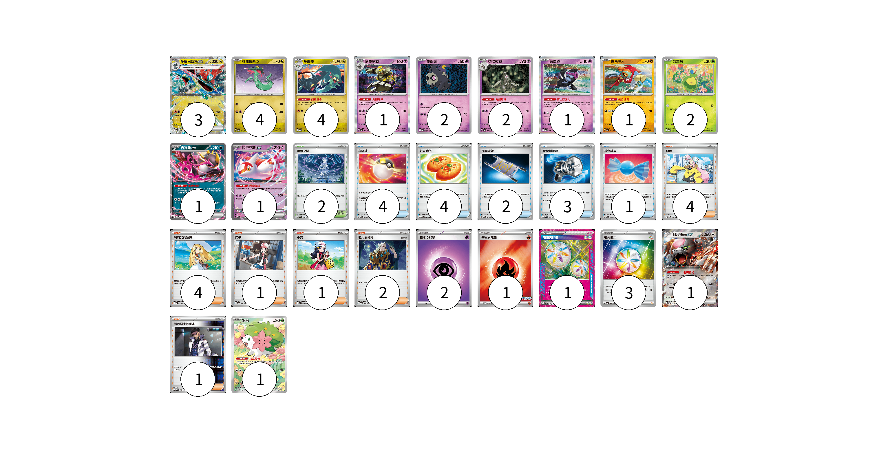 牌組構築方案 以此牌組為基礎新構築牌組 顯示卡面 顯示列表 寶可夢卡(24) 3 4 4 1 2 2 1 1 2 1 1 1 1 物品卡(14) 4 4 2 3 1 支援者卡(13) 4 4 1 1 2 1 競技場卡(2) 2 能量卡(7) 2 1 1 3 寶可夢卡(24) 卡牌名稱 張數 卡牌名稱 張數 多龍巴魯托ex SV8a 120/187 03 多龍梅西亞 SV8a 118/187 04 多龍奇 SV8a 119/187 04 黑夜魔靈 SV8a 066/187 01 夜巡靈 SV8a 064/187 02 彷徨夜靈 SV8a 065/187 02 願增猿 SV8a 075/187 01 摔角鷹人 SV8a 084/187 01 含羞苞 SV8a 001/187 02 吉雉雞ex SVOD 004/020 01 拉帝亞斯ex MBD 003/022 01 月月熊 赫月 ex SV5a 052/066 01 謝米 SV9a 066/063 01 物品卡(14) 卡牌名稱 張數 卡牌名稱 張數 高級球 MBG 012/022 04 好友寶芬 MBD 013/022 04 夜間擔架 MBD 016/022 02 反擊捕捉器 SV8a 139/187 03 神奇糖果 MBG 013/022 01 支援者卡(13) 卡牌名稱 張數 卡牌名稱 張數 奇樹 SVOD 016/020 04 莉莉艾的決意 MBD 021/022 04 鬥子 SV11W 085/086 01 小光 M2 077/080 01 老大的指令 MBD 020/022 02 弗圖博士的劇本 SV8a 175/187 01 競技場卡(2) 卡牌名稱 張數 卡牌名稱 張數 阻礙之塔 SV8a 181/187 02 能量卡(7) 卡牌名稱 張數 卡牌名稱 張數 基本【超】能量 MBD PSY 02 基本【火】能量 M-P 032/M-P 01 新衝天能量 SV5K 071/071 01 夜光能量 SV4a 190/190 03 以此牌組為基礎新構築牌組 牌組編碼 QRoQym-vIuyiN-BXrLCs copy 列印牌組單 牌組編碼已複製 分享至SNS